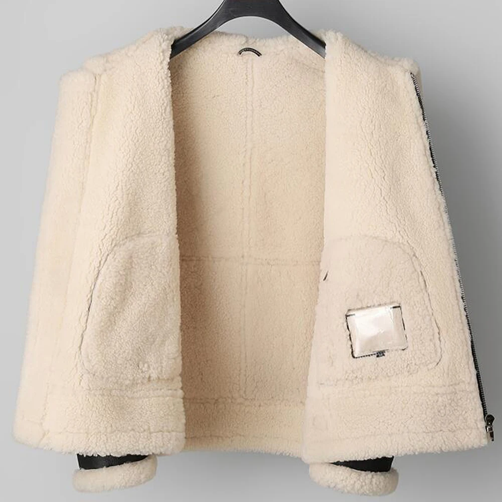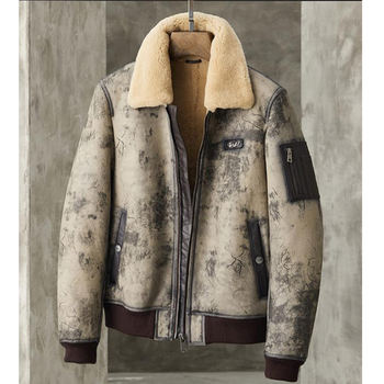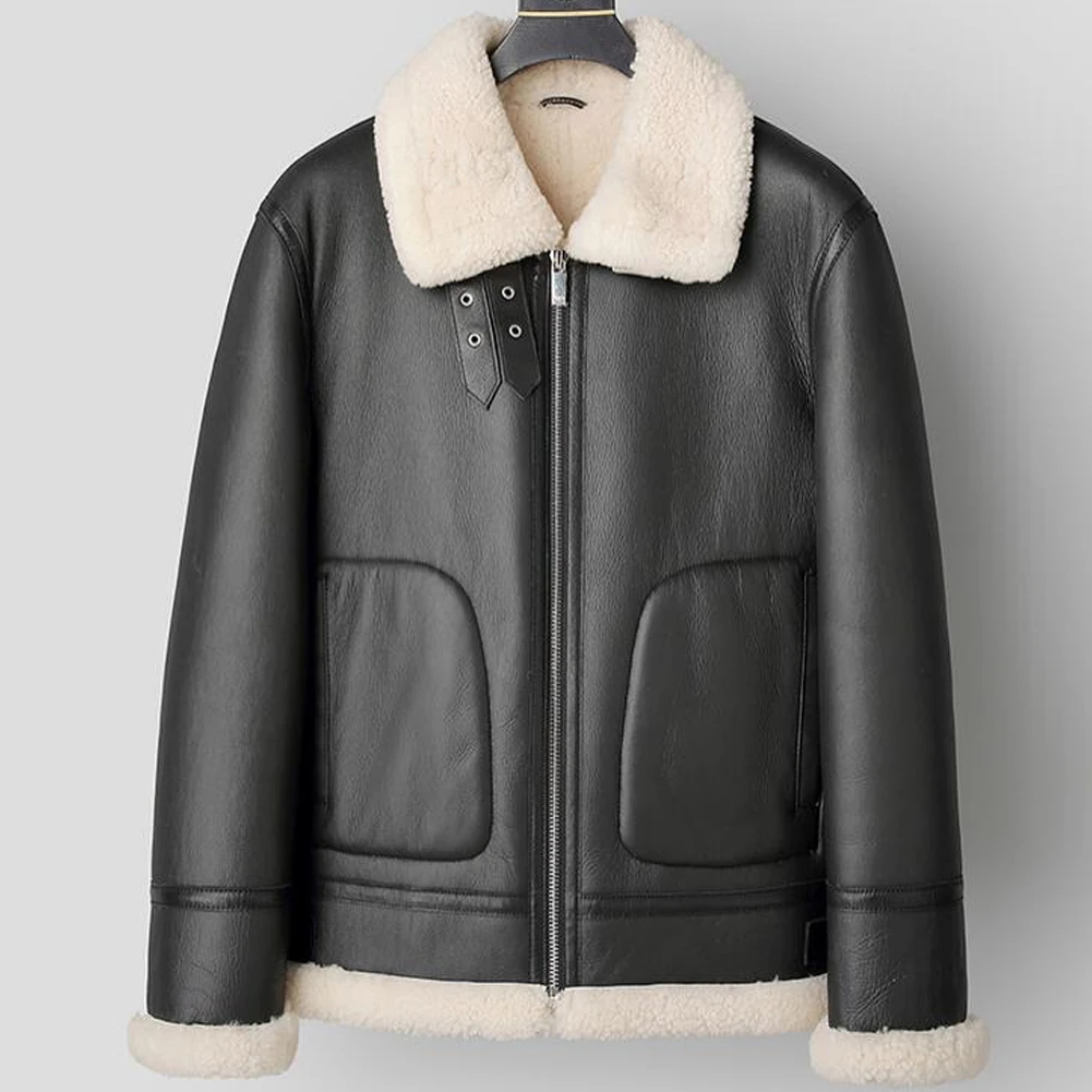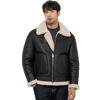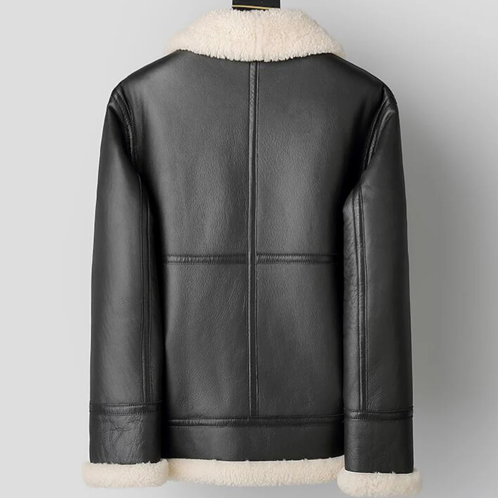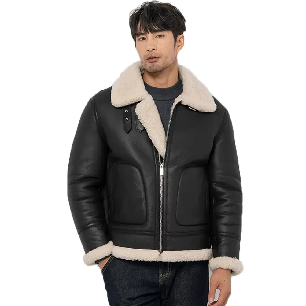 Denny&Dora Mens Shearling Jacket Mens Aviator Shearling Jacket Winter Thick Lapel Collar Black Leather Jacket