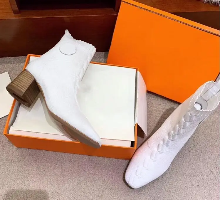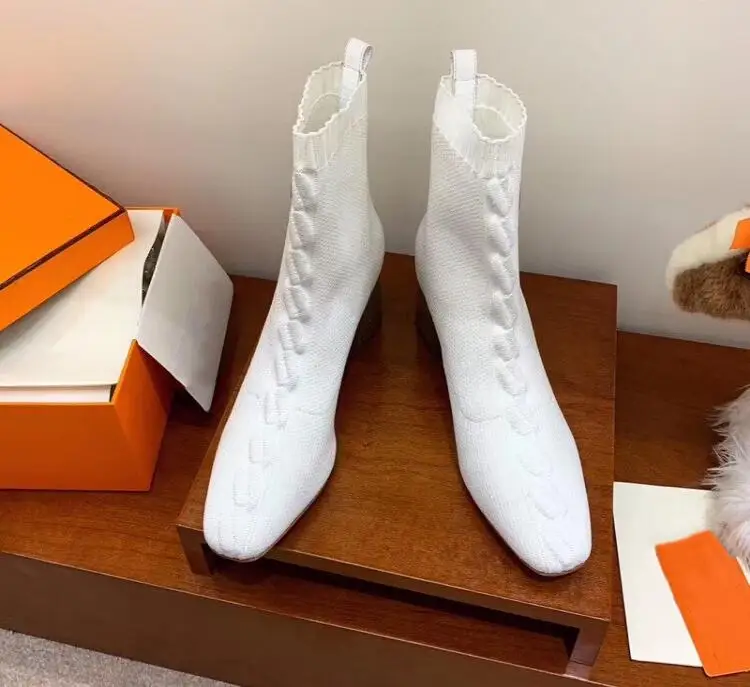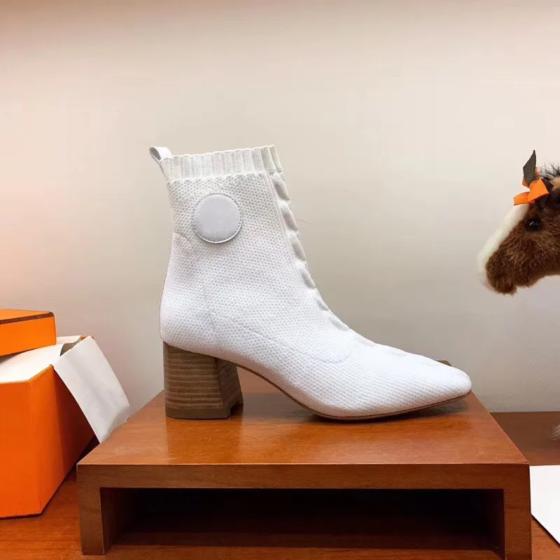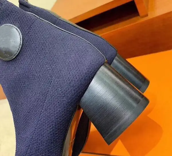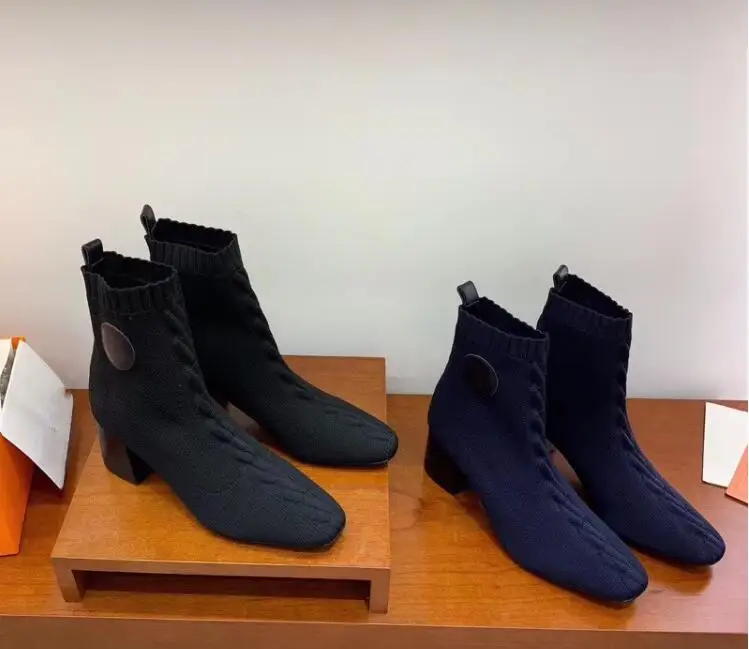 Designer ladies block high heels socks boots Stretch knitting leather shoes women ankle boots autumn luxury brand runway botas