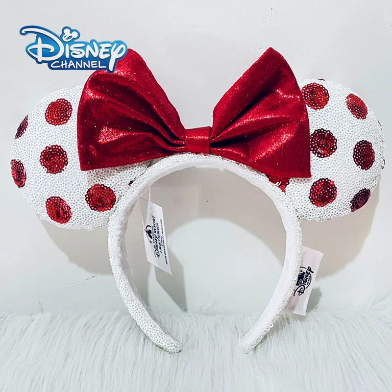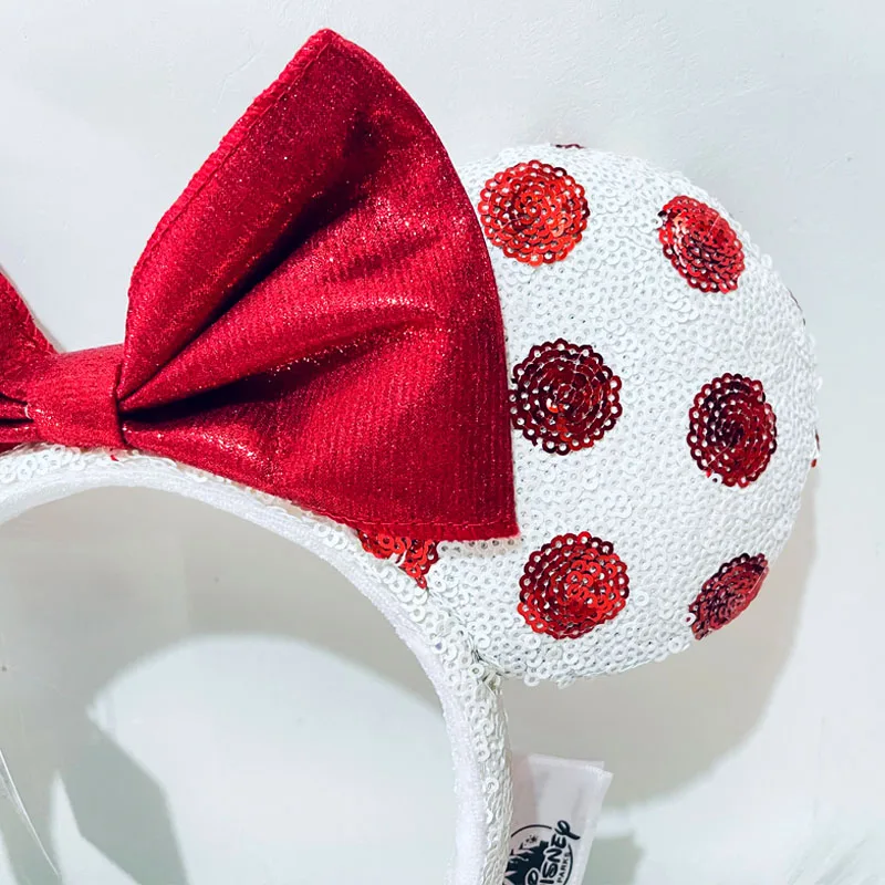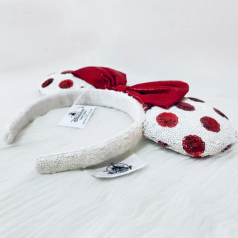 Disney Red And White Headband Mickey Ear For Adults Sequins Bow Headband Minnie Park Accessories Headwear