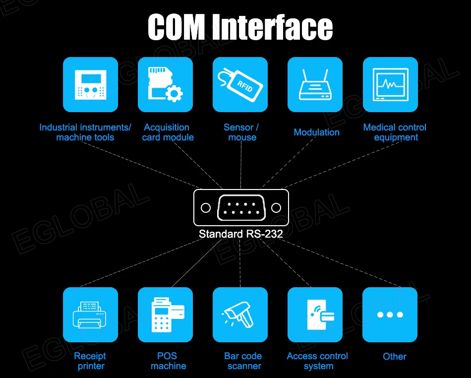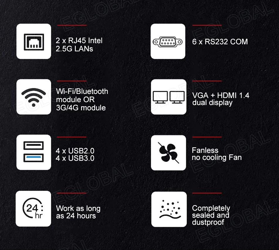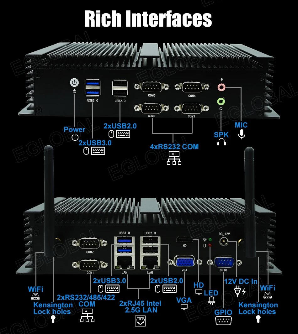 6 x COM RS232(3 line) ports, COM1 COM2 can change to RS485/422 from BIOS |