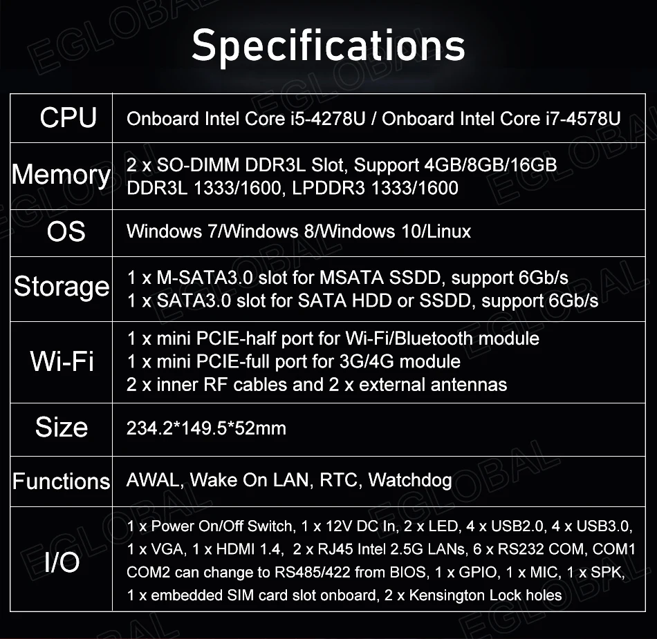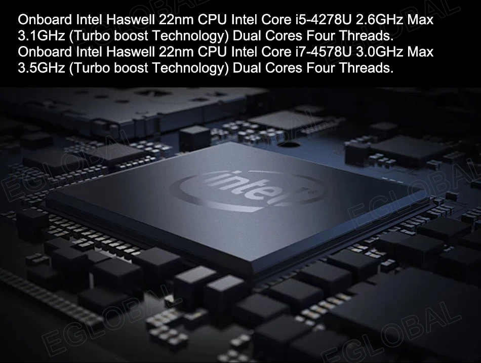 - CPU: Onboard Intel Haswell 22nm CPU Intel Core i7-4578U 3.0GHz Max 3.5GHz(Turbo boost Technology) Dual Cores Four Threads 4MB cache TDP 28W Intel Iris Graphics 5100.