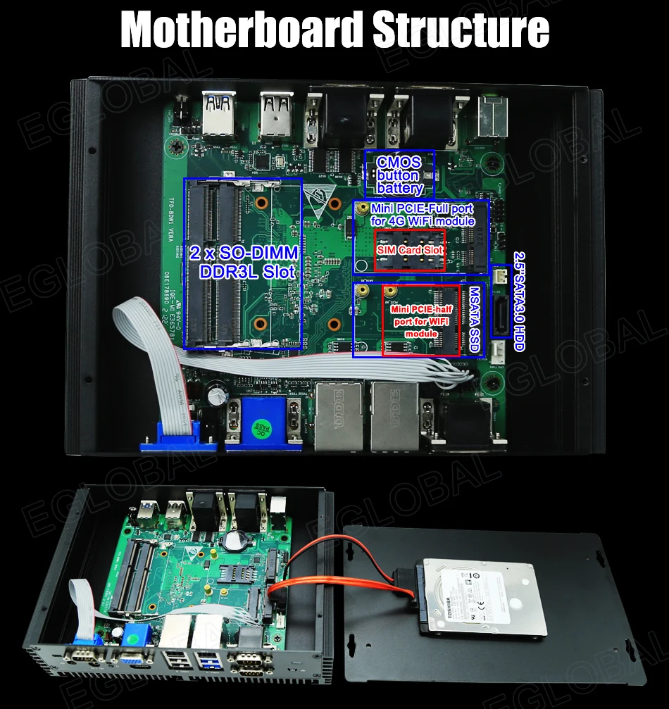 1 x mini PCIE-half port for Wi-Fi/Bluetooth module 1 x mini PCIE-full port for 3G/4G module |