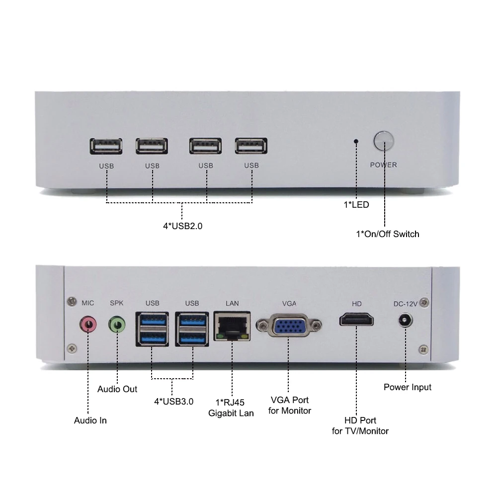 2*WiFi antennas, 1*MIC, 1*SPK, 4*USB3.0, 1*LAN, 1*VGA, 1*HD, 1*DC 12V |