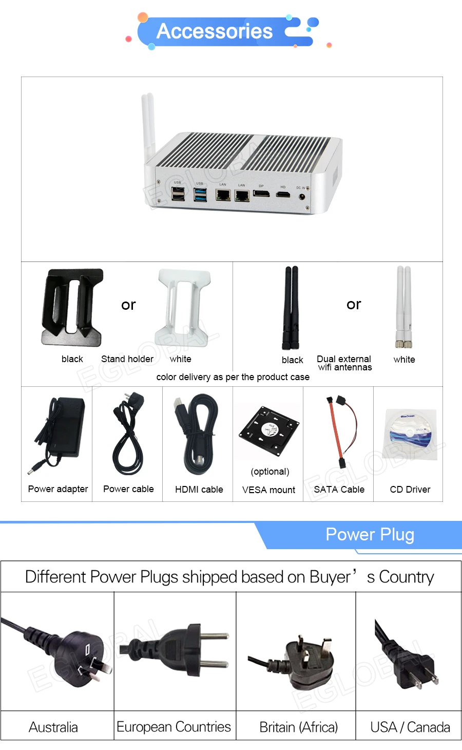 Mini PC device, power adapter, a stand holder, a VESA mount(optional), dual WiFi antennas(optional), a HD cable( as a gift), a Screw Bag, Warranty Card |