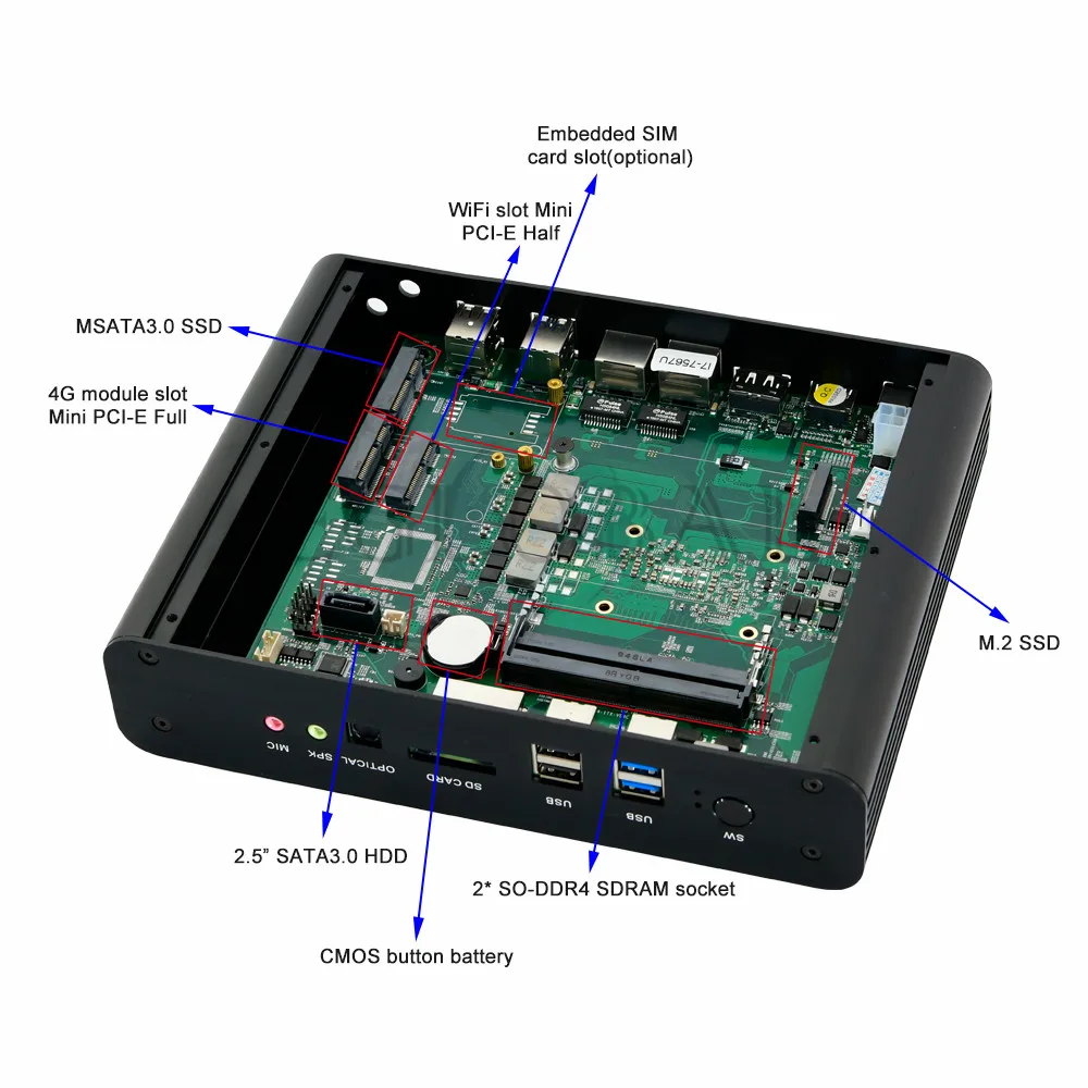 Support 1*mSATA SSD+1*M.2(NVMe/SATA) SSD+1*2.5” SATA HDD/SSD installation together |