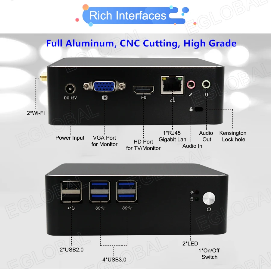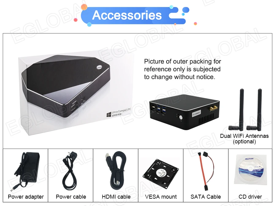 | Standard | 1xMini PC, 1xPower Adapter, 1xPower Cord, 1xScrews Bag, 1xVESA mount |