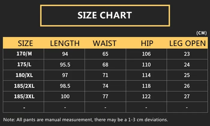 1. All pants are manual measurement, there may be a 1-3 cm deviations.