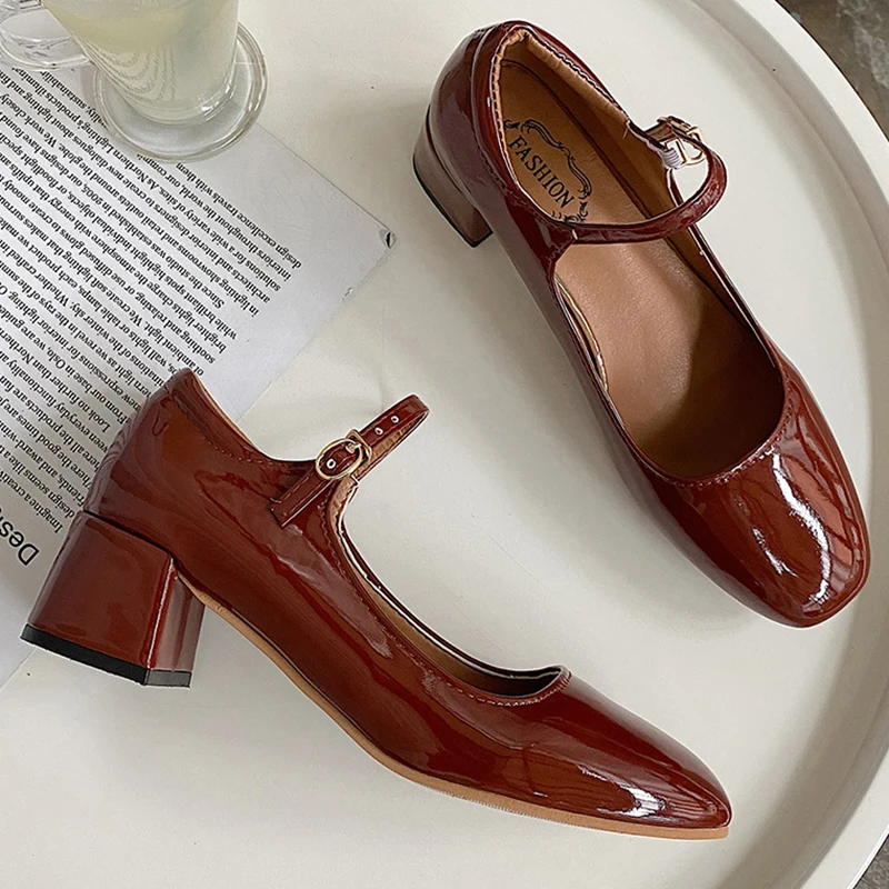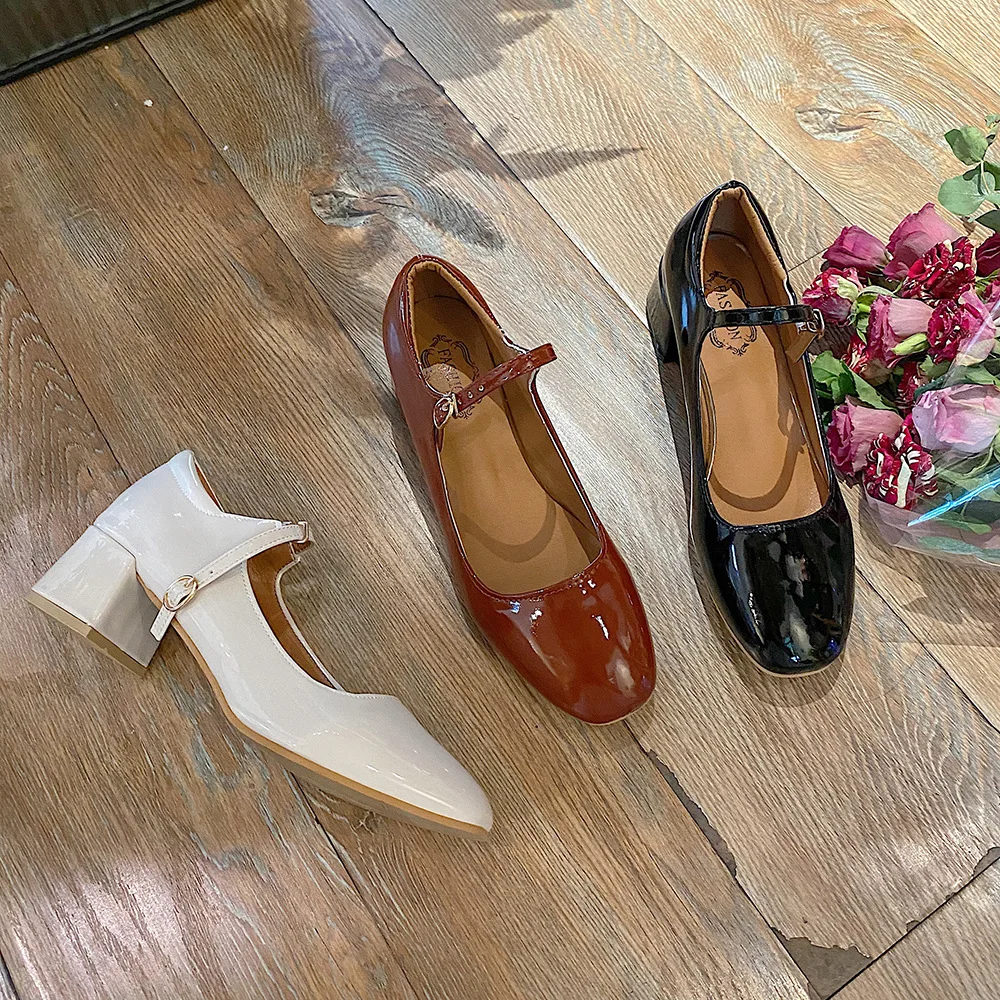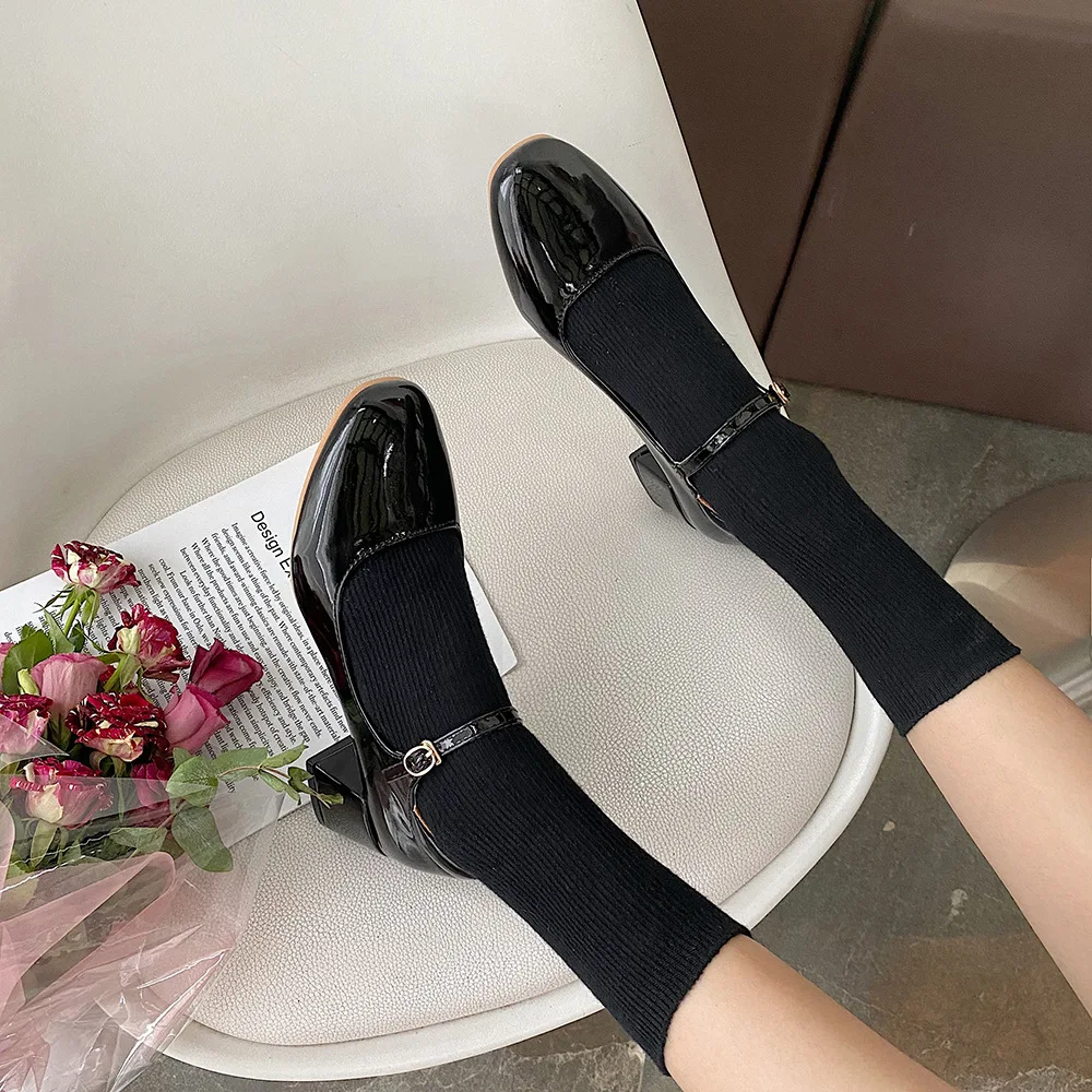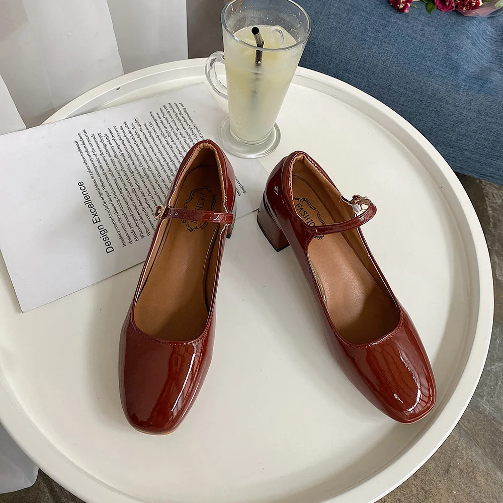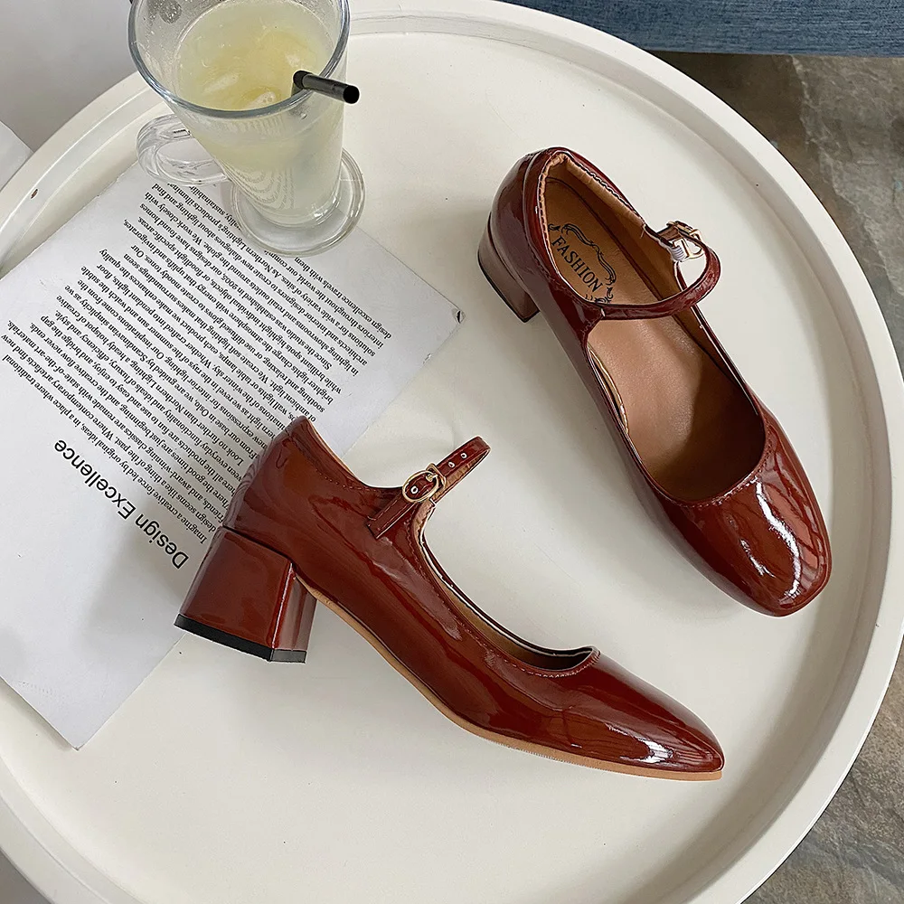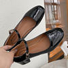 Elegant Japanned leather buckle band mary janes women loafers shoes women ballerina solid square toe chunky heels ballet flats