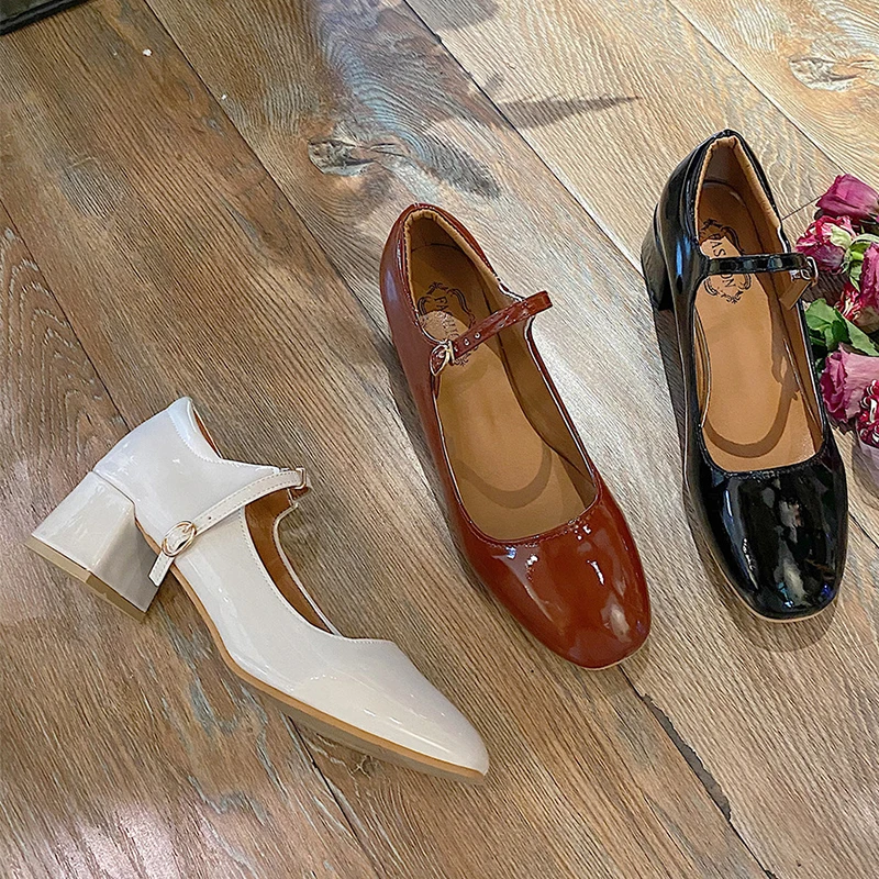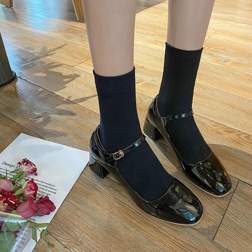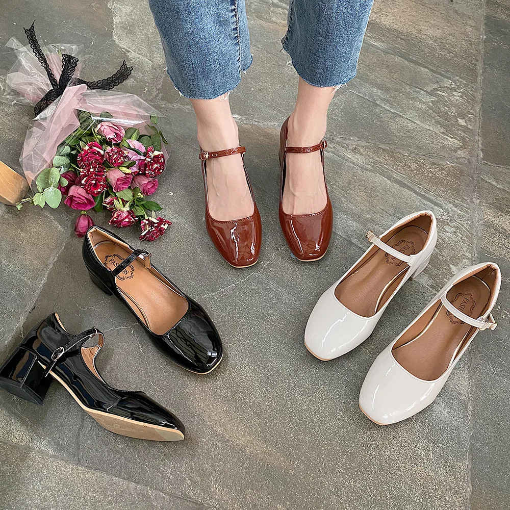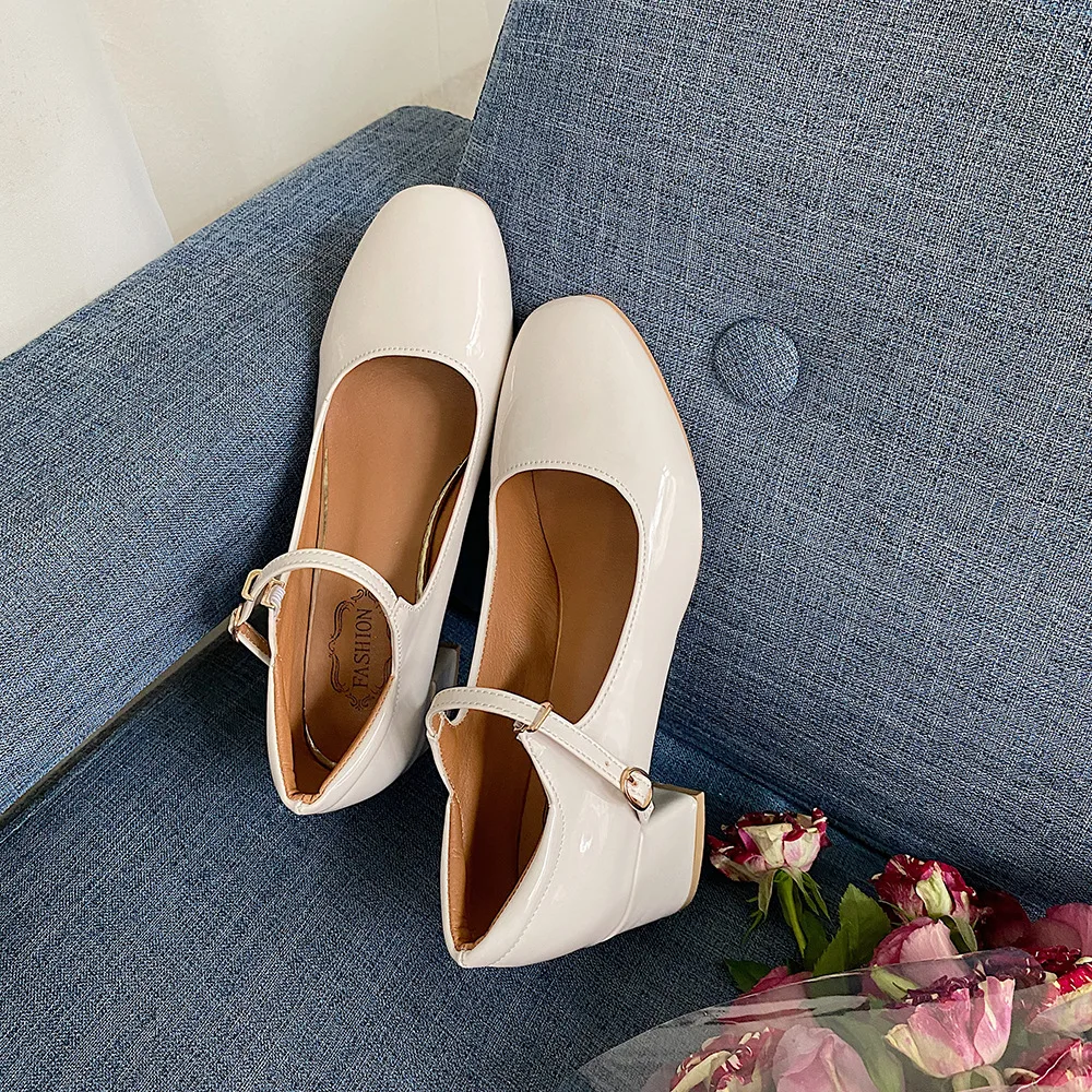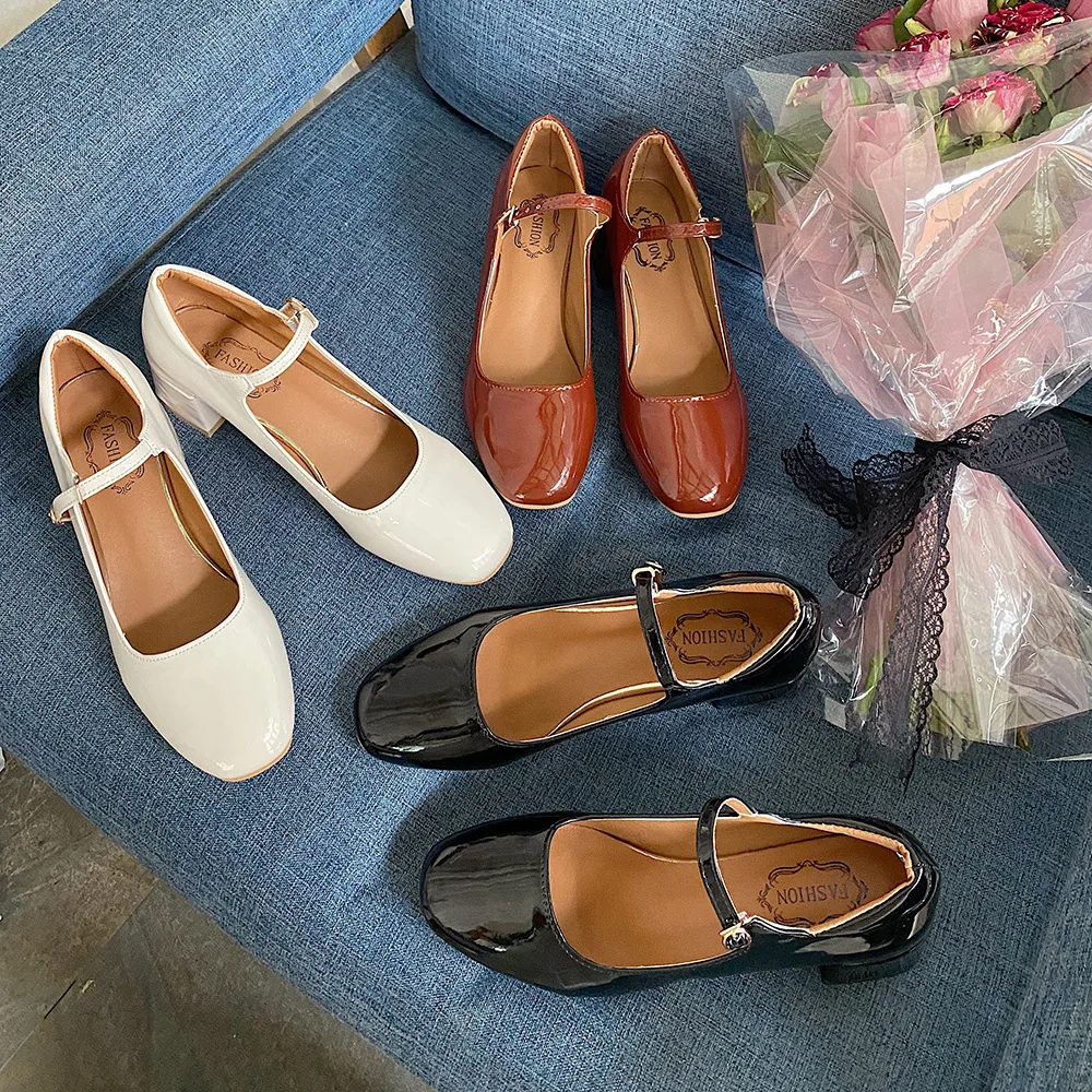 Elegant Japanned leather buckle band mary janes women loafers shoes women ballerina solid square toe chunky heels ballet flats