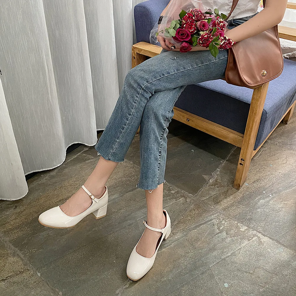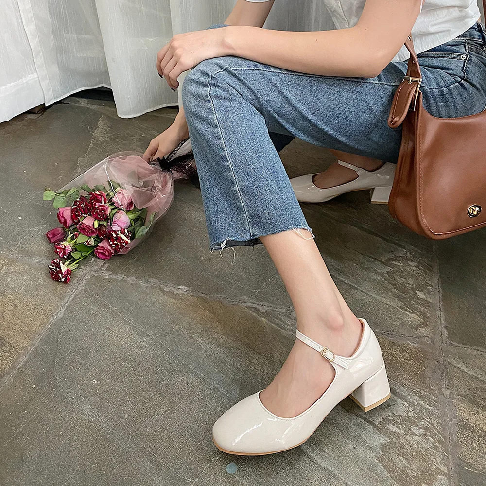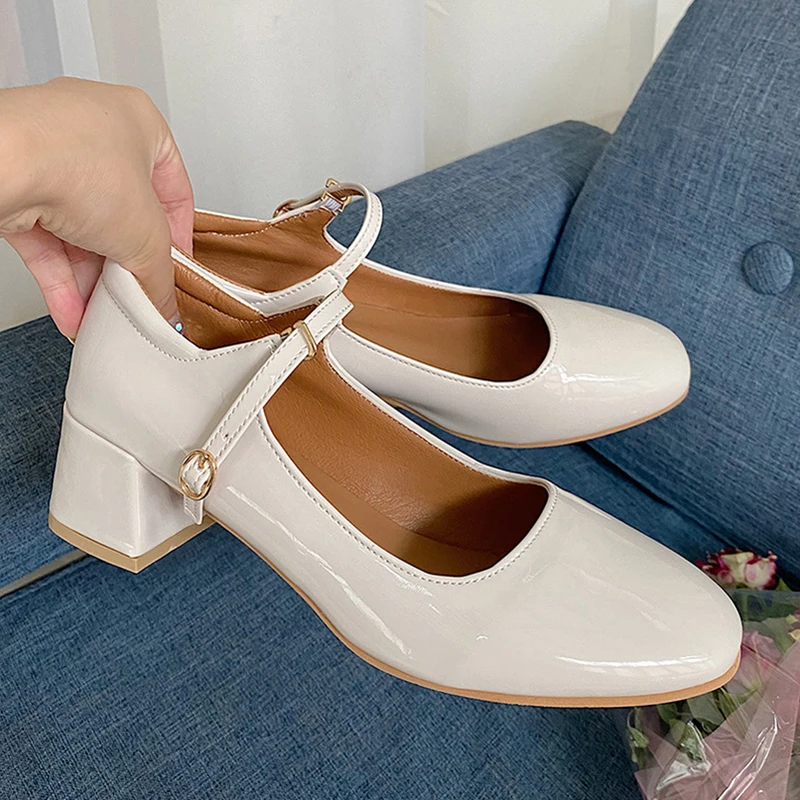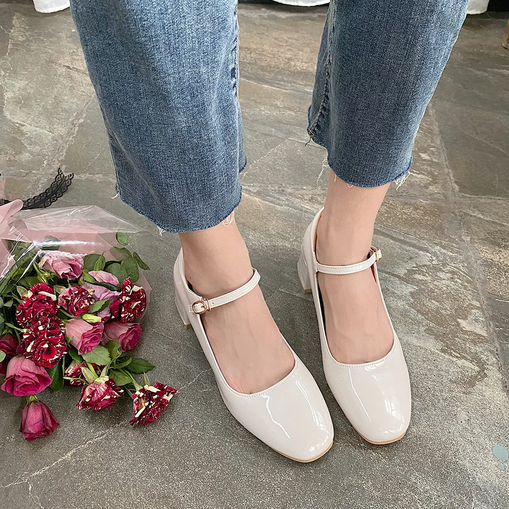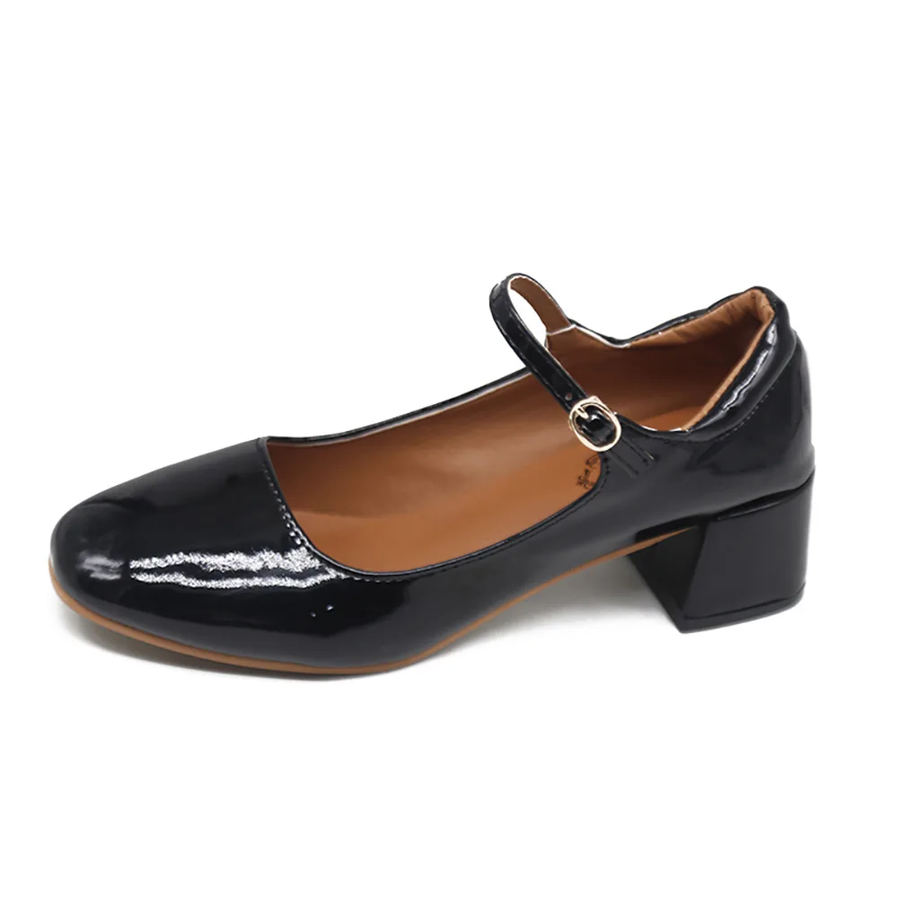Elegant Japanned leather buckle band mary janes women loafers shoes women ballerina solid square toe chunky heels ballet flats