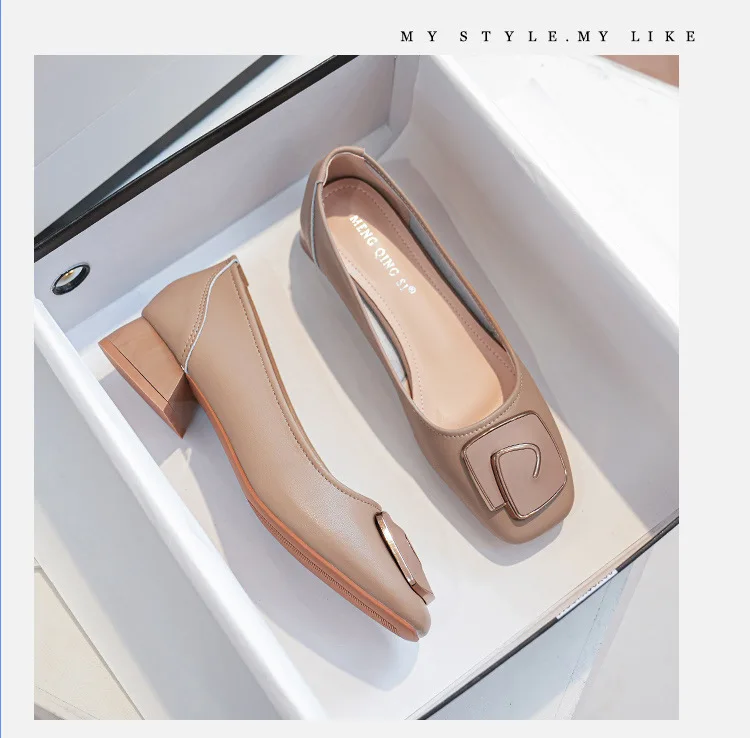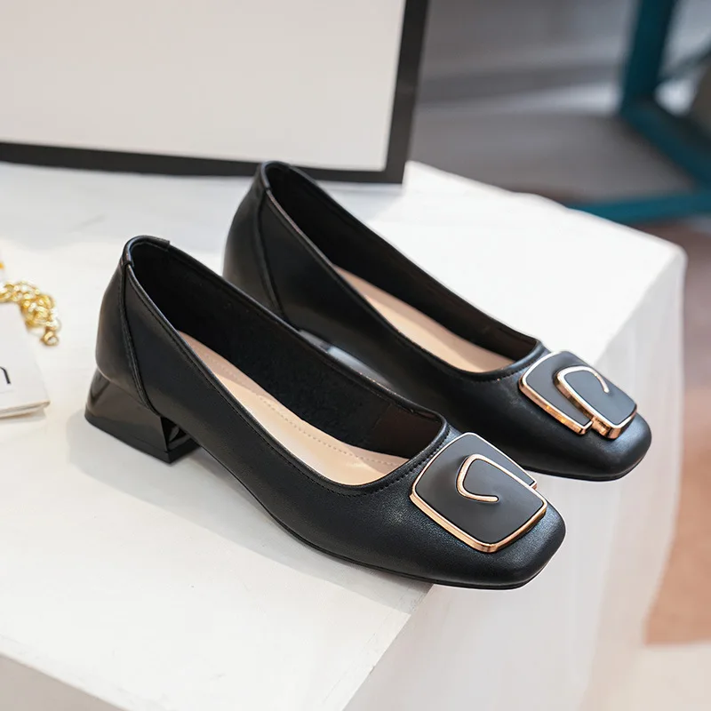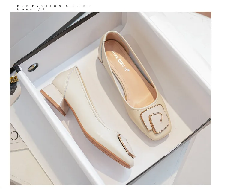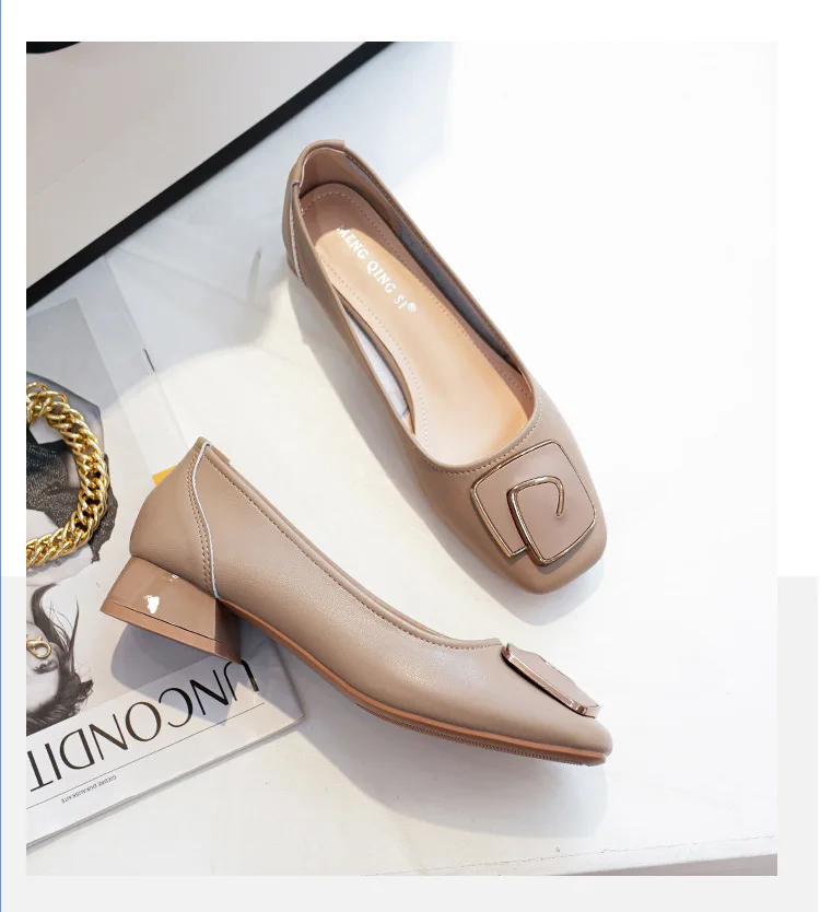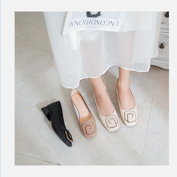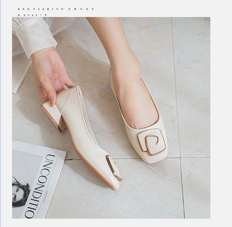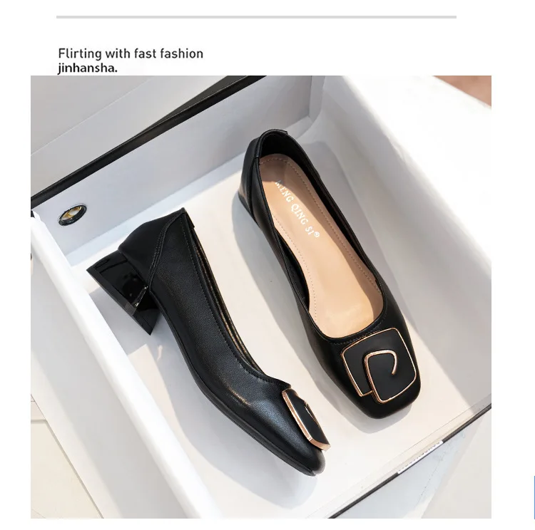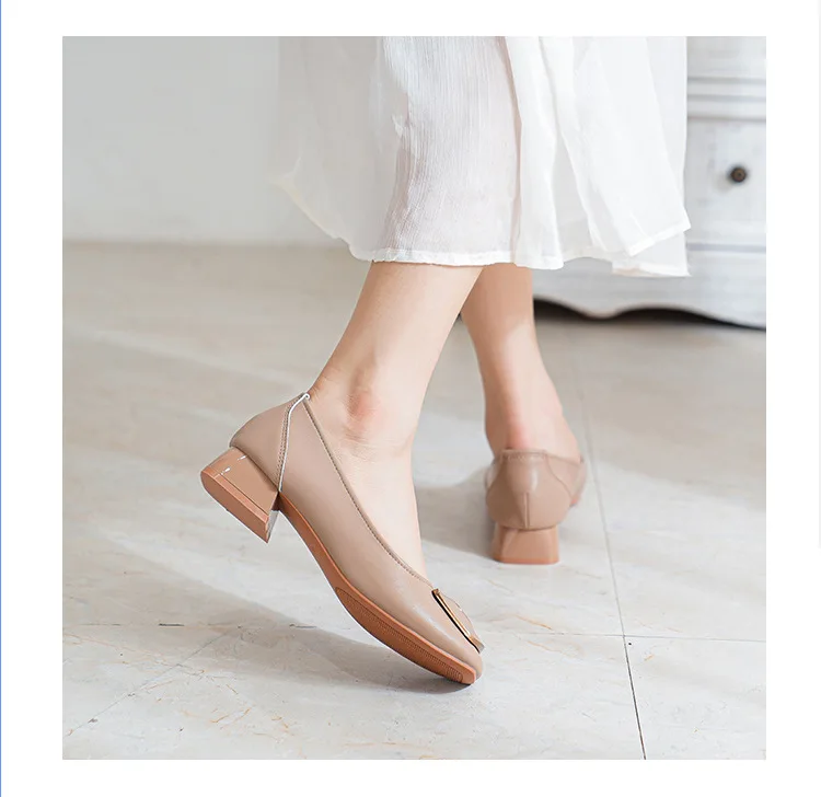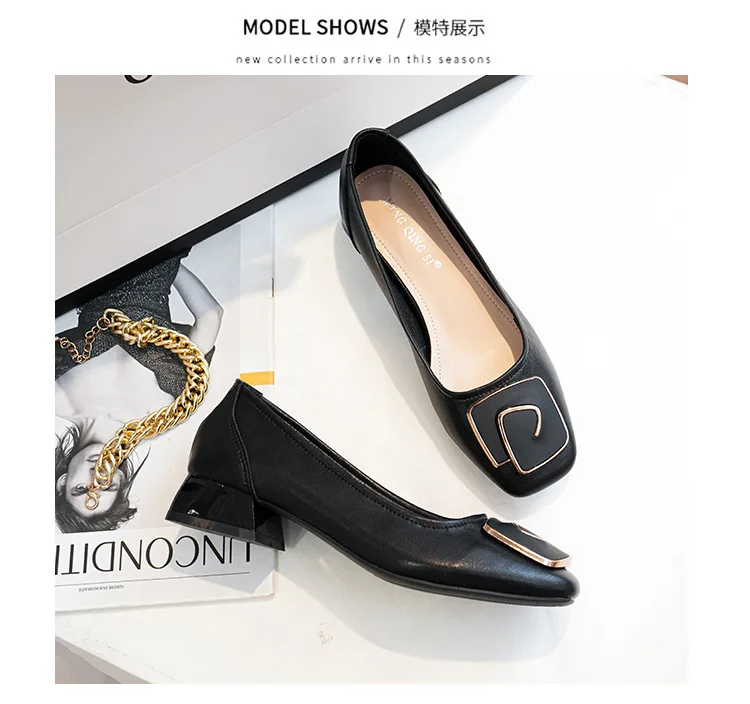 Elegant Ladies Office Dress Shoes Cow Leather Pumps Woman Medium High Heel Mary Janes Metal Button Loafers Femme Square Toe Shoe