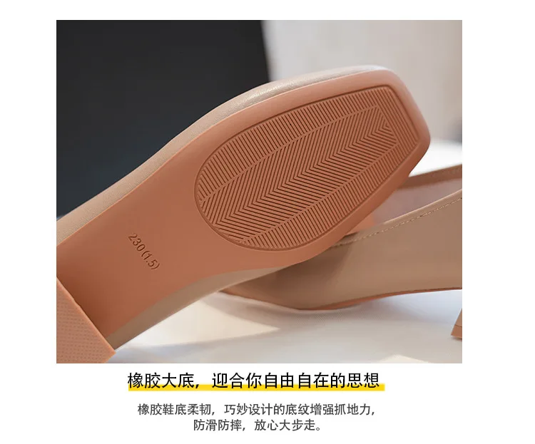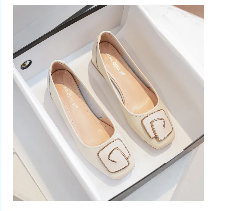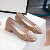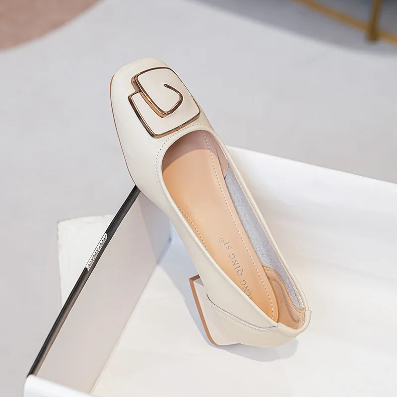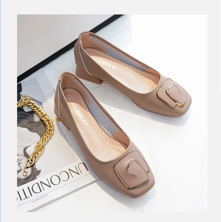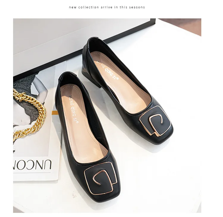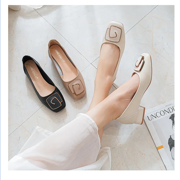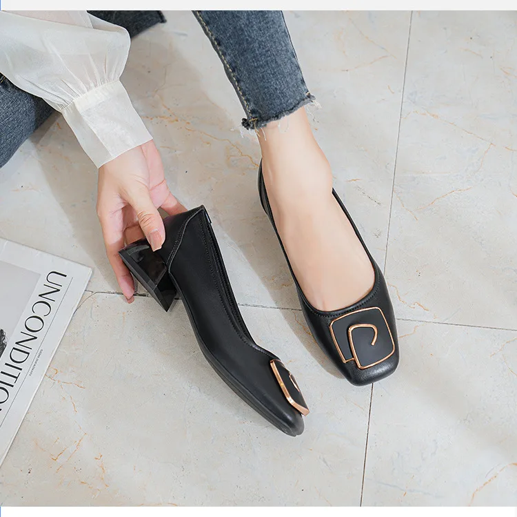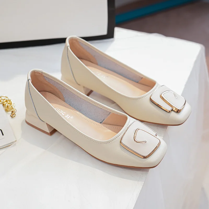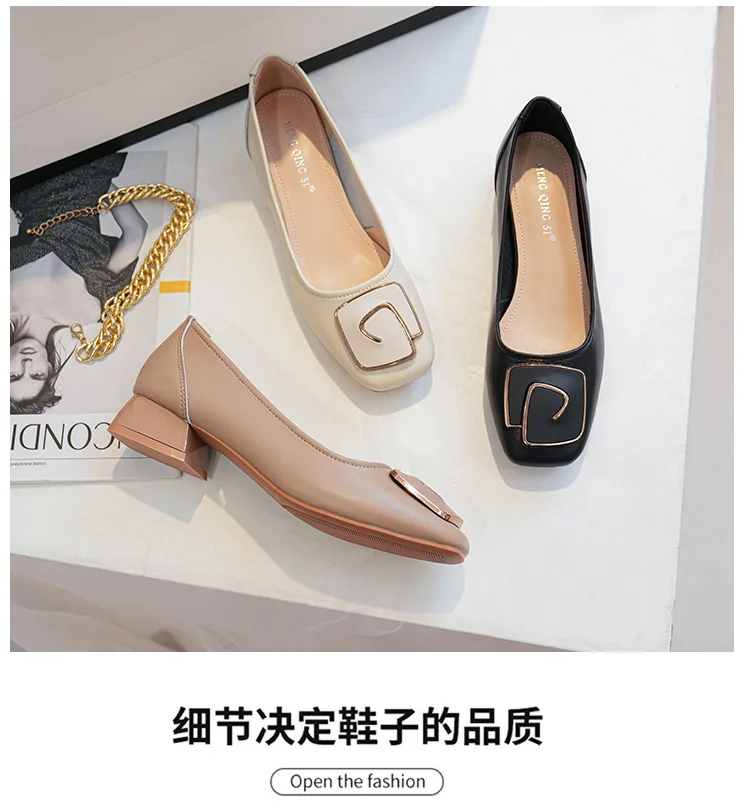 Elegant Ladies Office Dress Shoes Cow Leather Pumps Woman Medium High Heel Mary Janes Metal Button Loafers Femme Square Toe Shoe