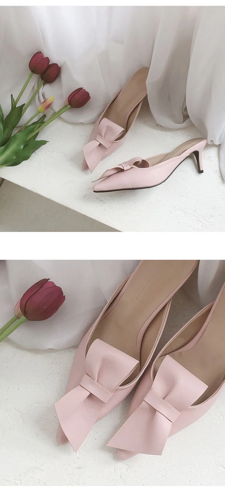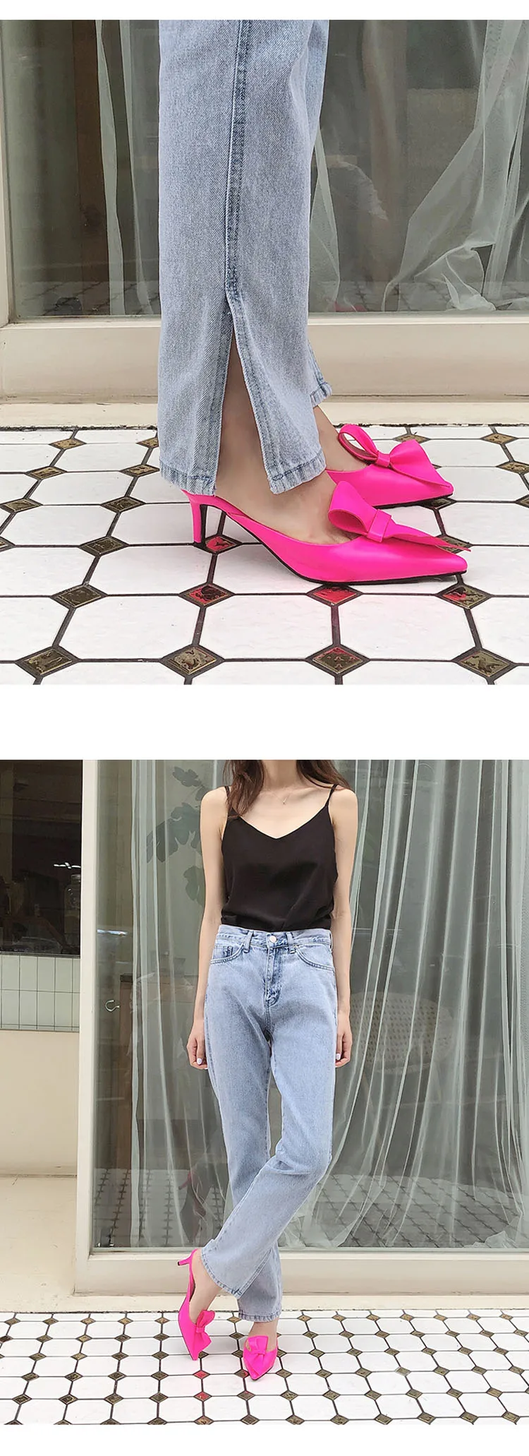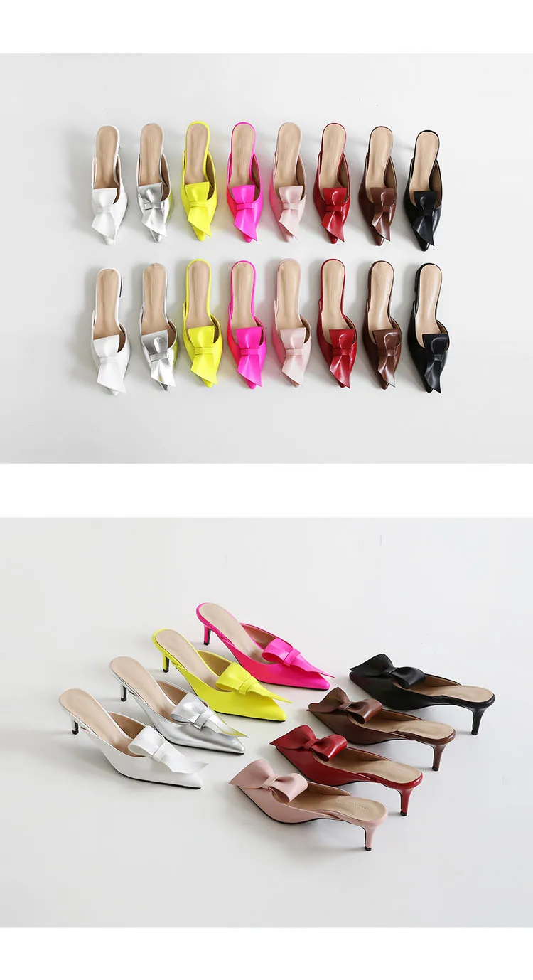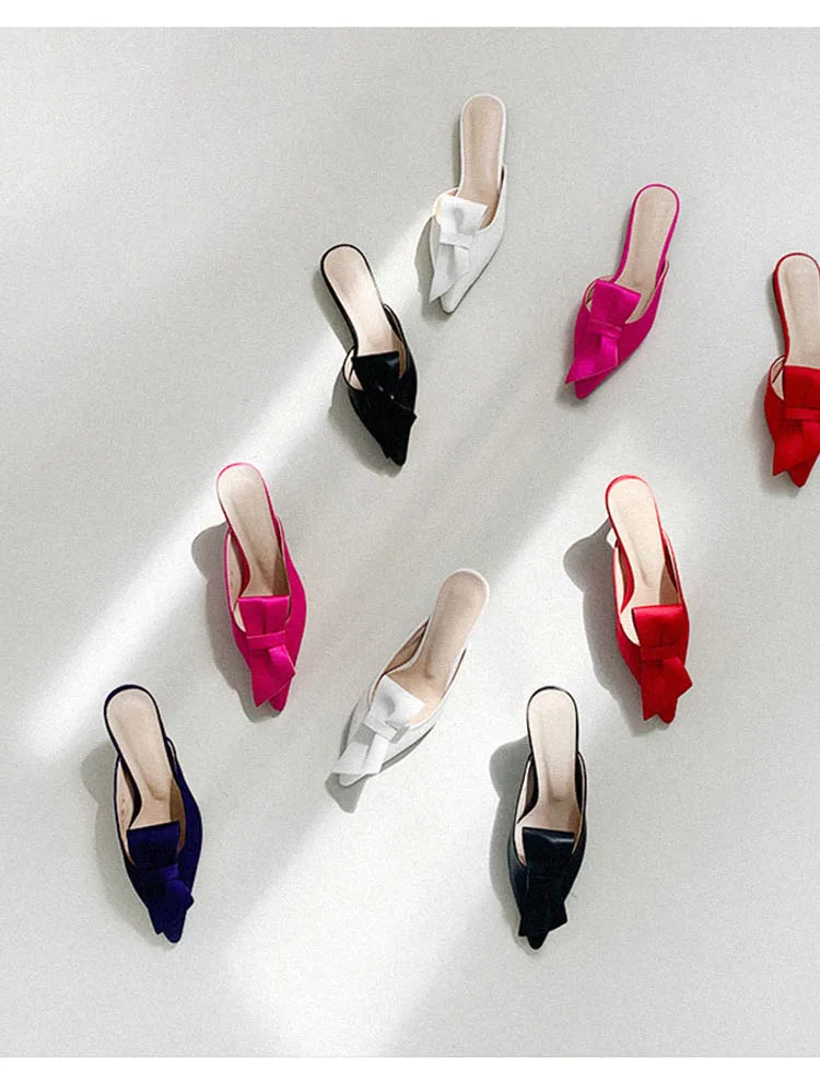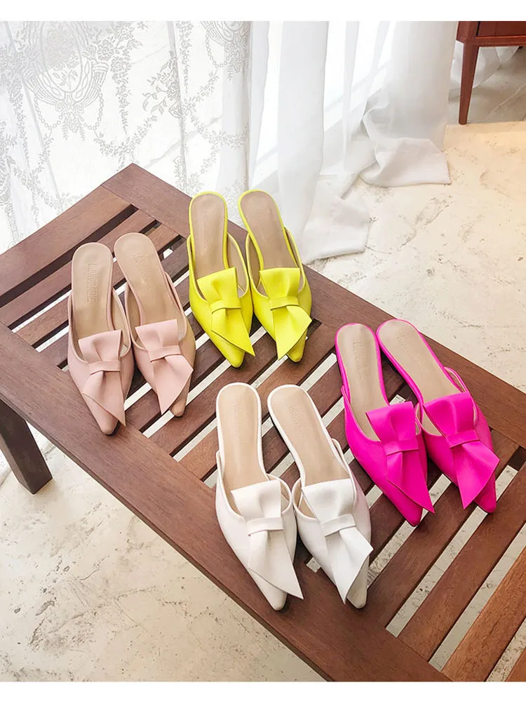 Elegant Ladies Stiletto Heels Woman Bow Slippers Candy Color Thin High Heels Mules Indoor Slides Shoes Pantufa Femme Flip Flops