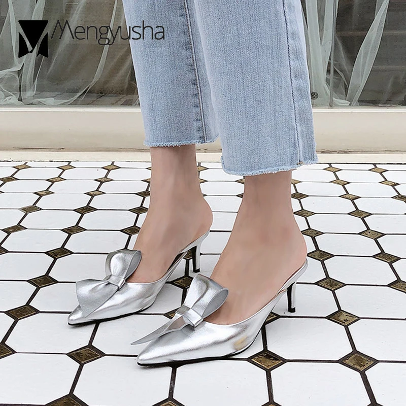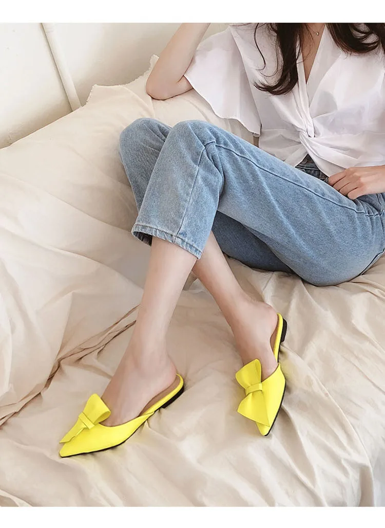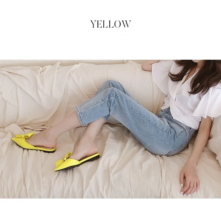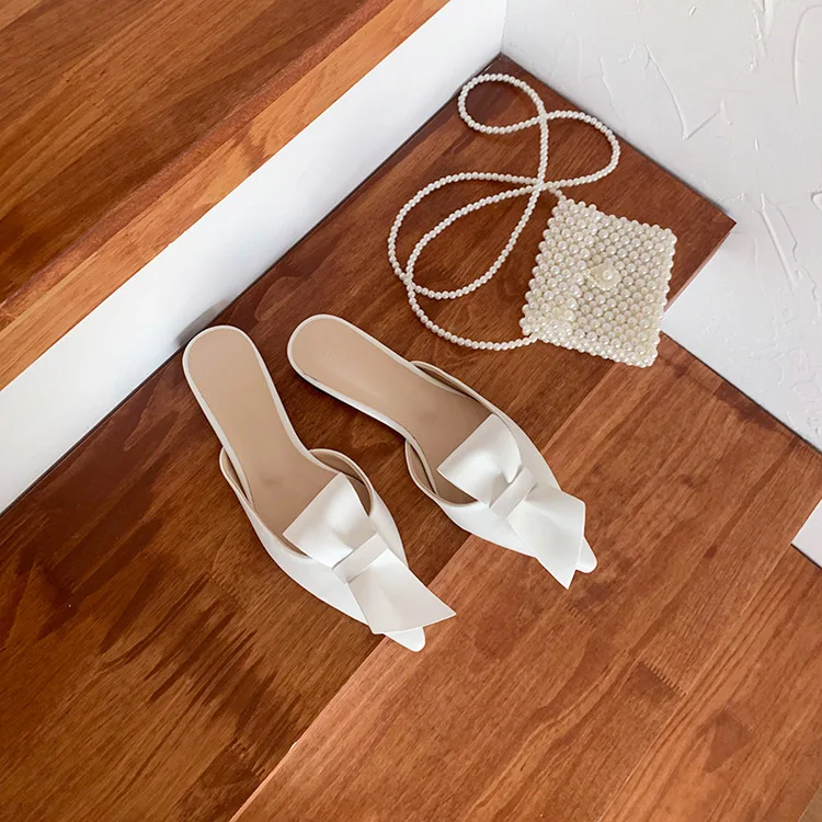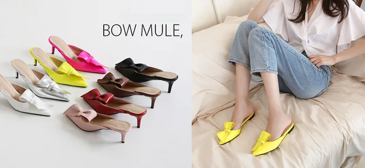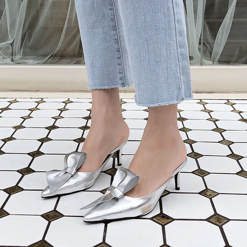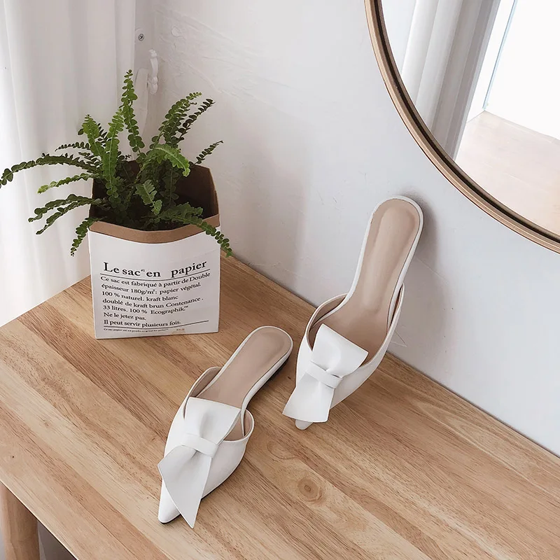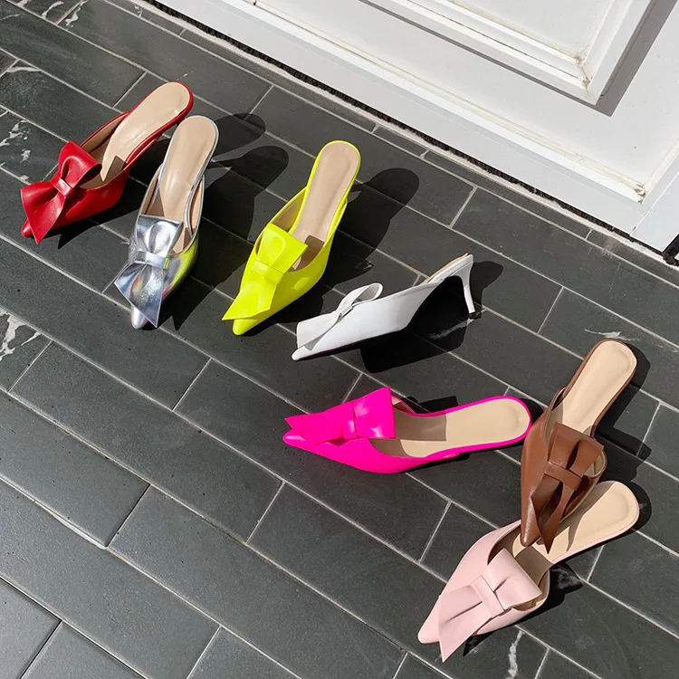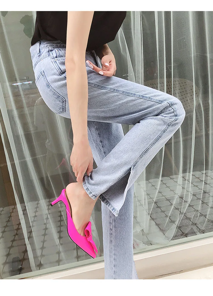 Elegant Ladies Stiletto Heels Woman Bow Slippers Candy Color Thin High Heels Mules Indoor Slides Shoes Pantufa Femme Flip Flops