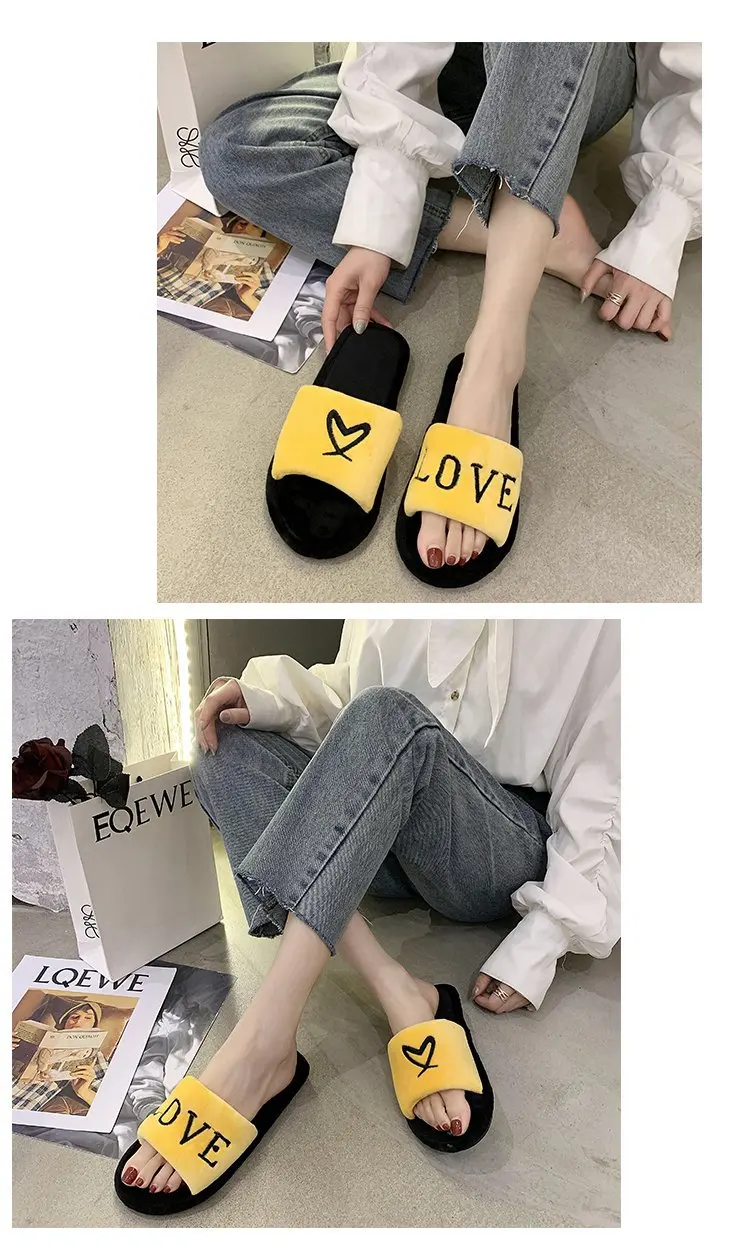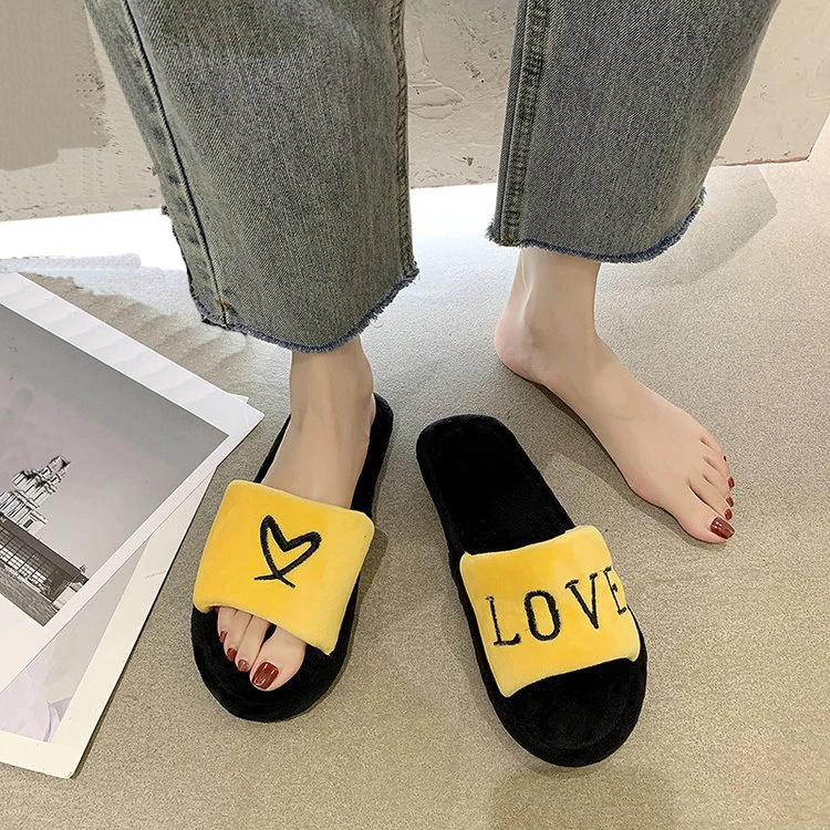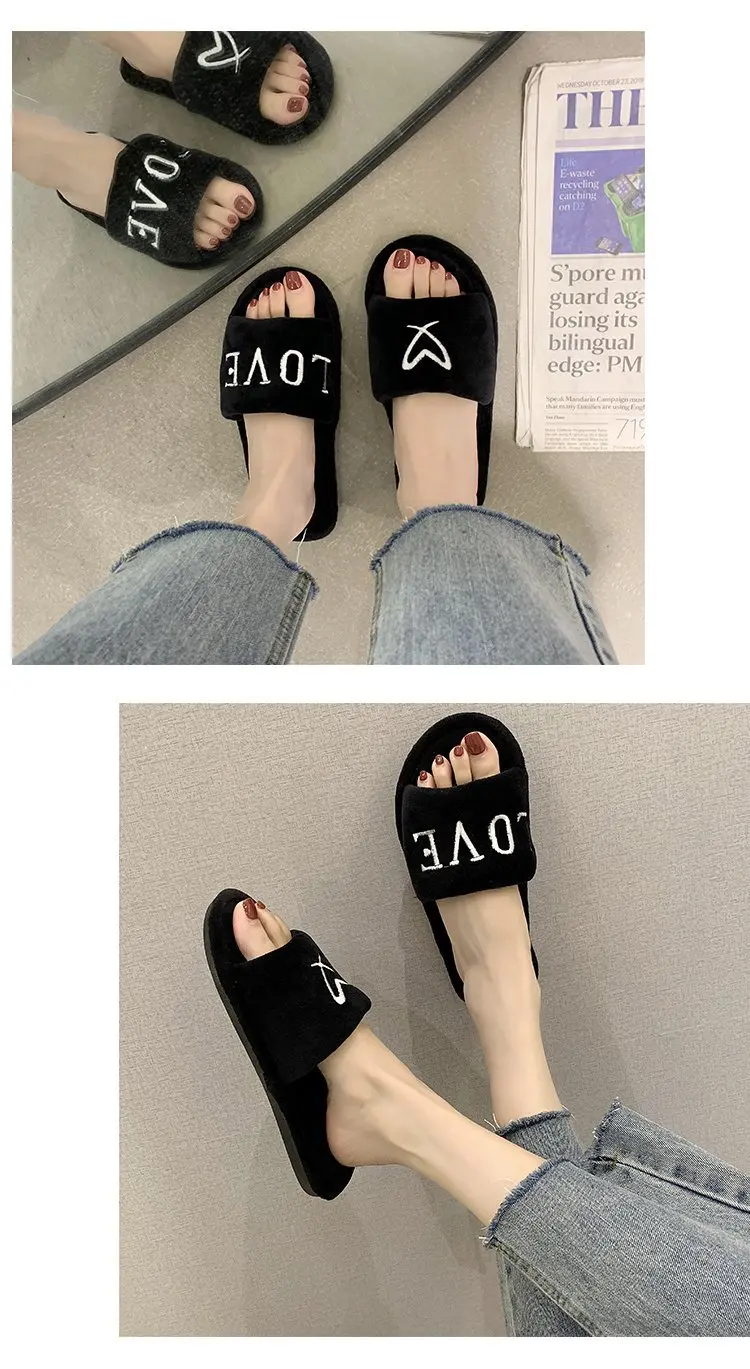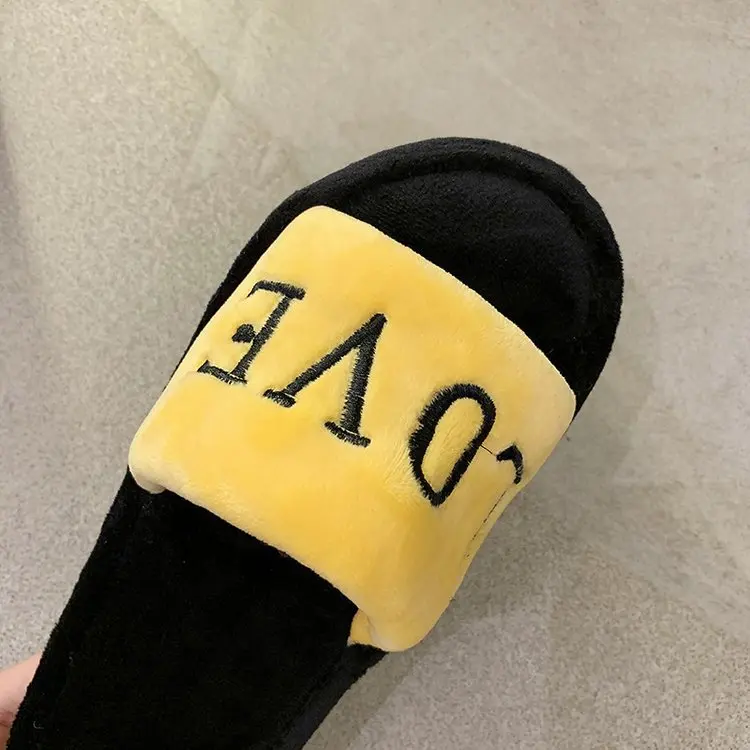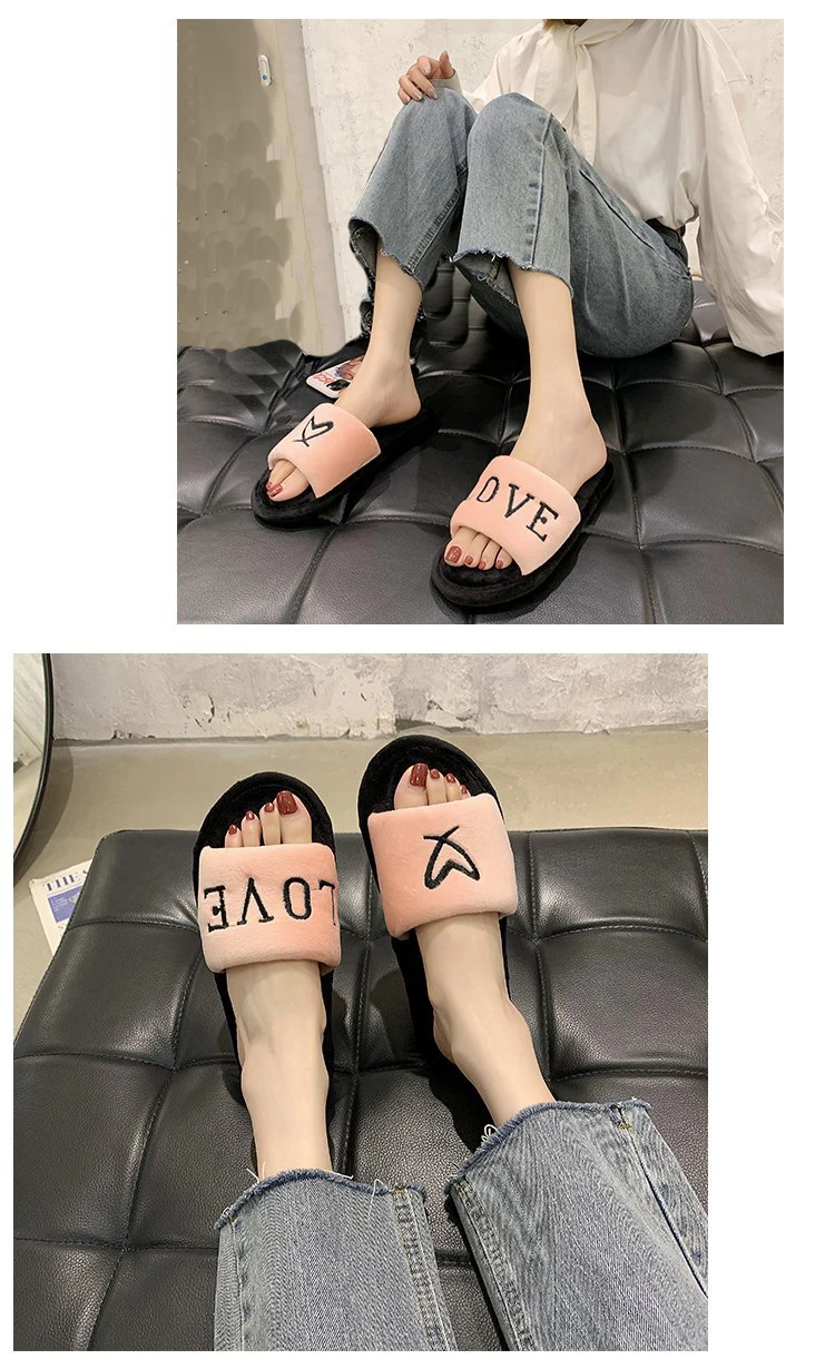 2020 New Arrived Flock Embroider Letters Hairy Slippers Indoor Ladies Shoes
