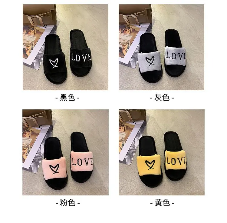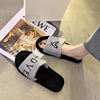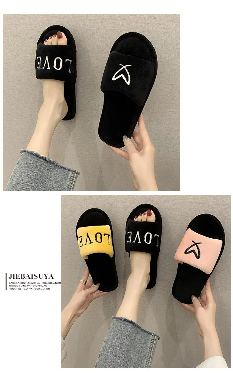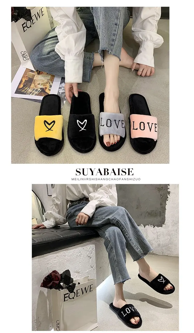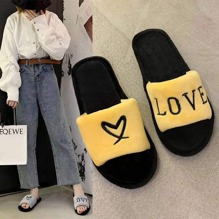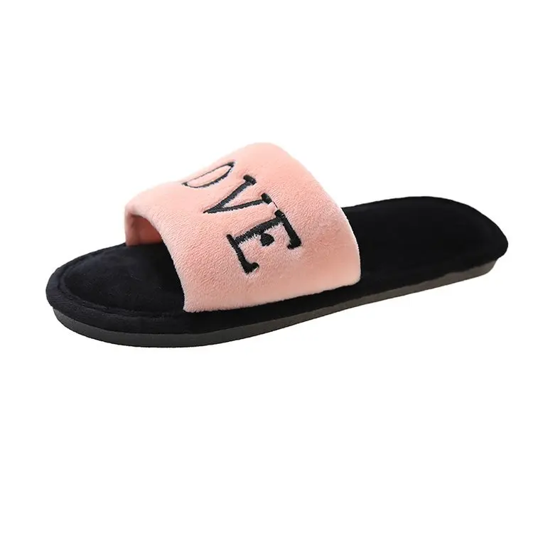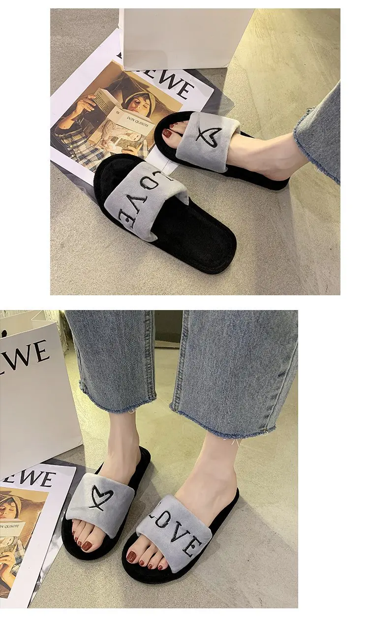 2020 New Arrived Flock Embroider Letters Hairy Slippers Indoor Ladies Shoes