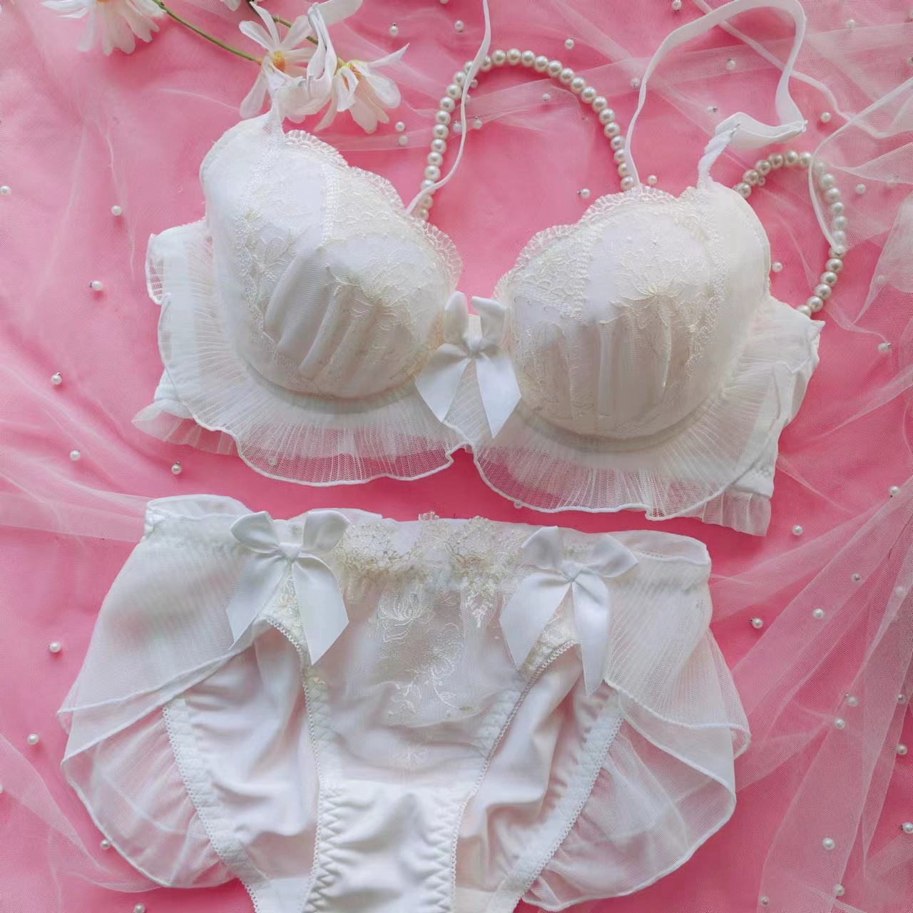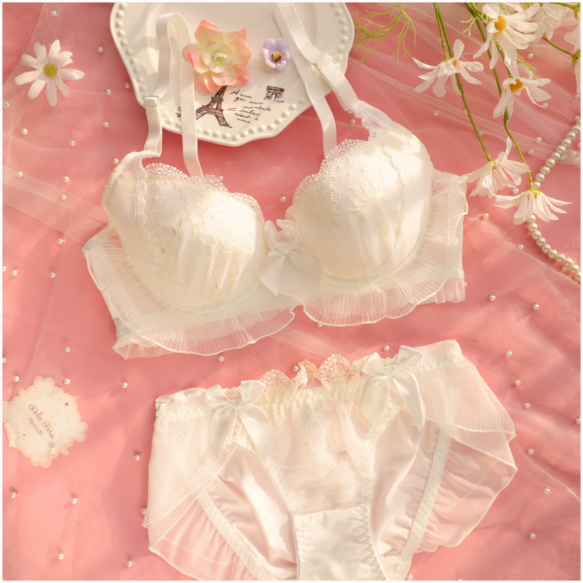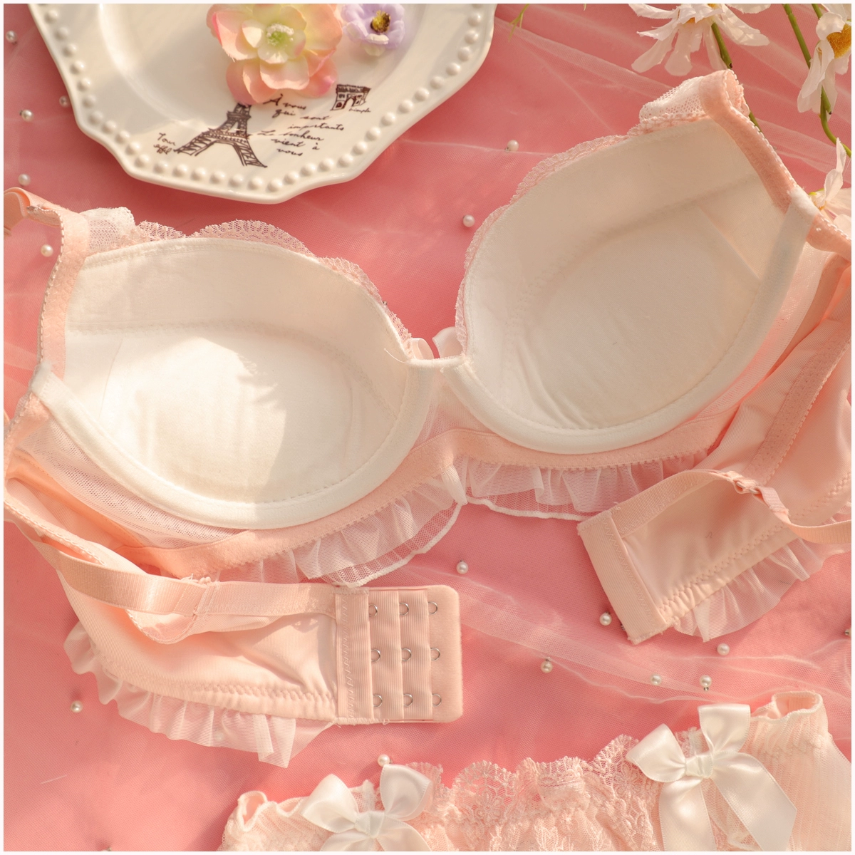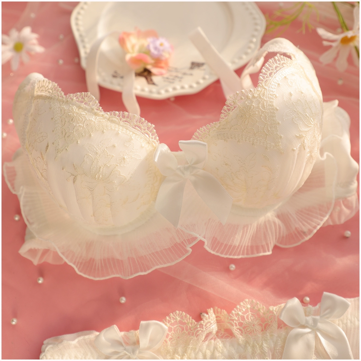 Embroidery thin section ruffled underwear girls sweet and lovely lingerie breifs sets three buckle gathered ladies bra set