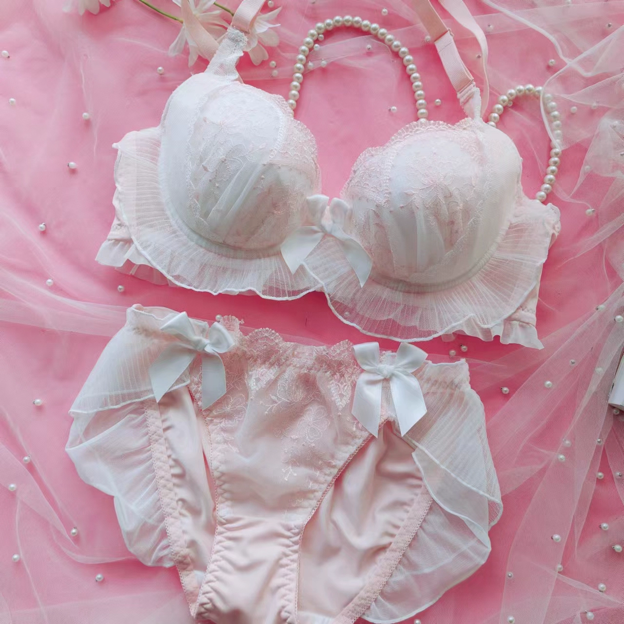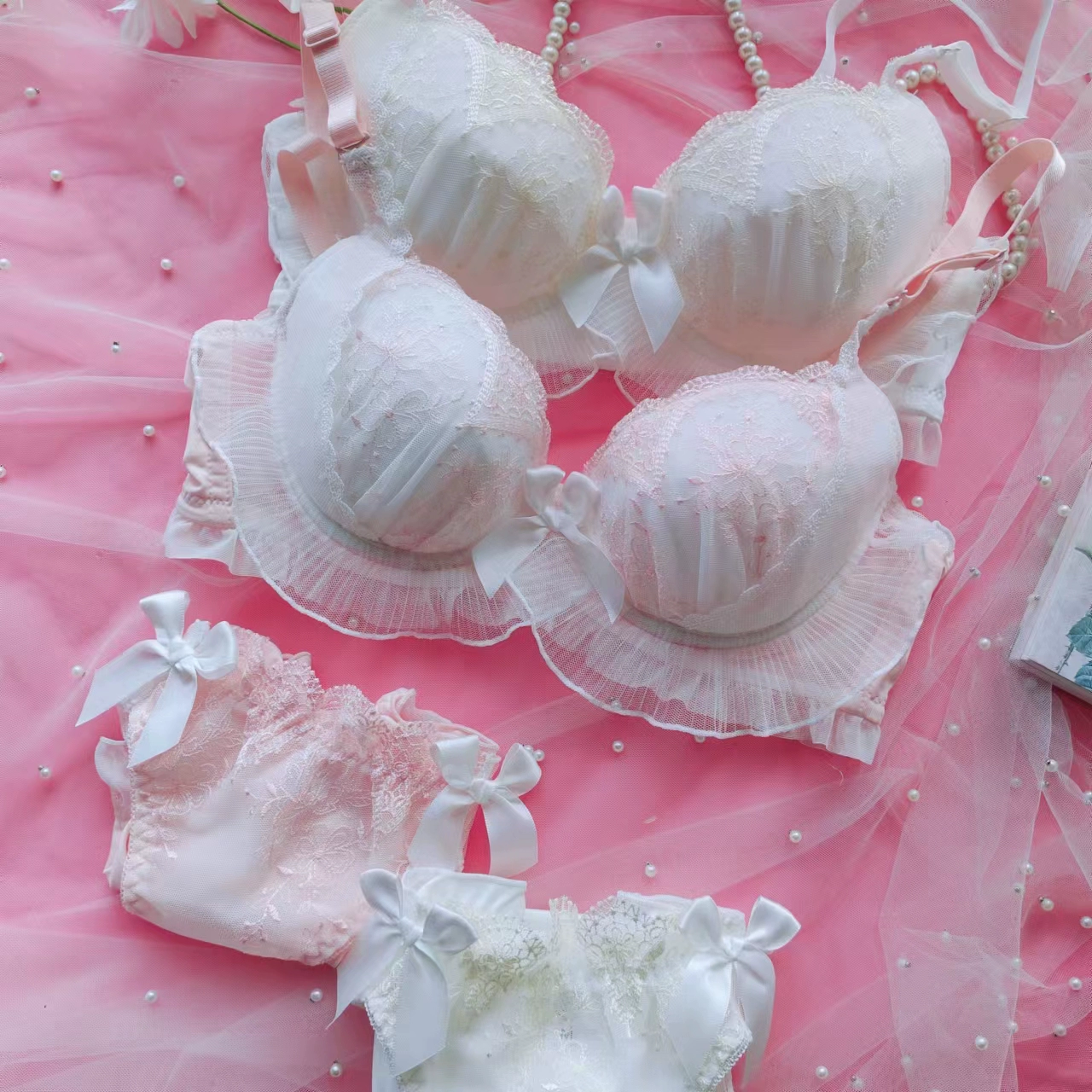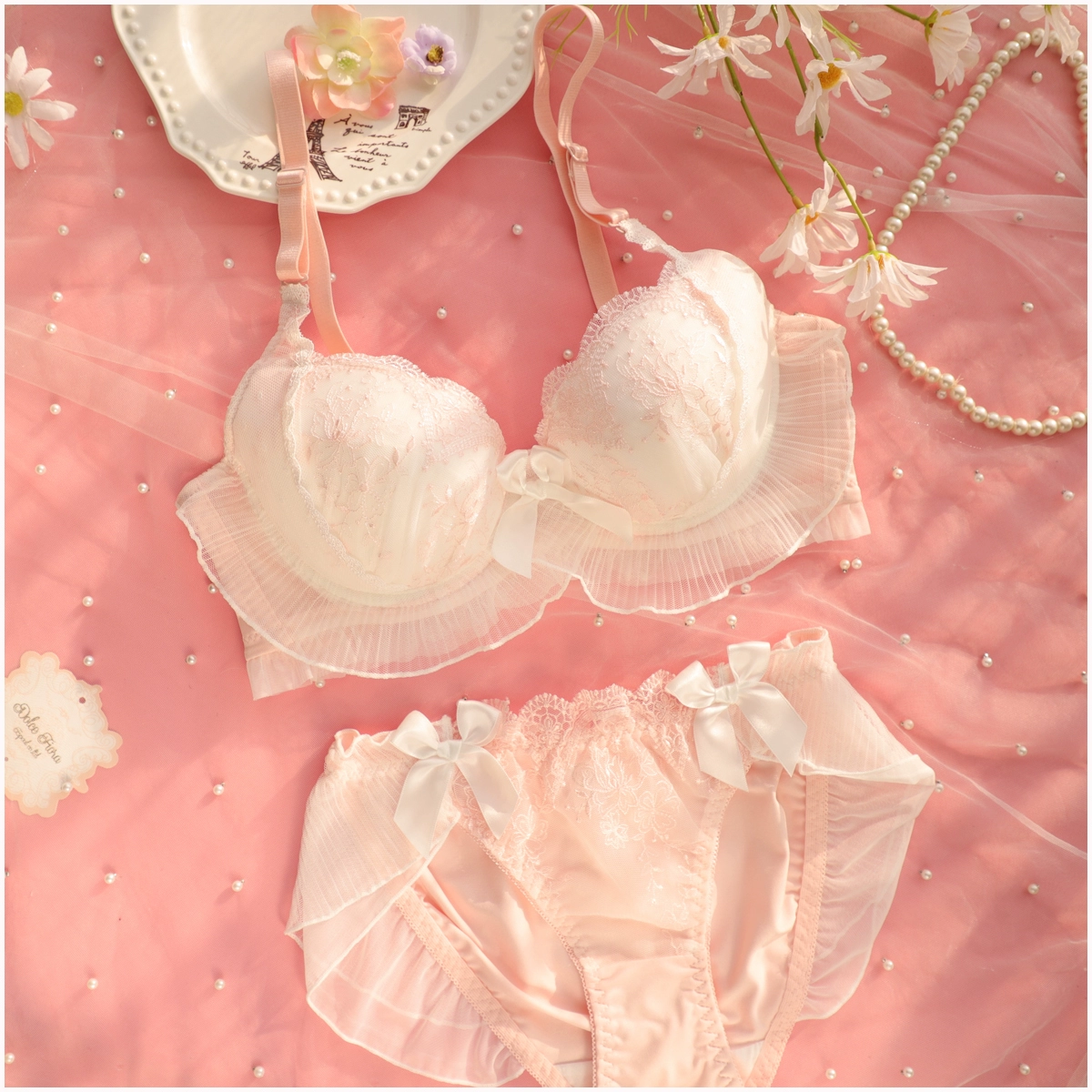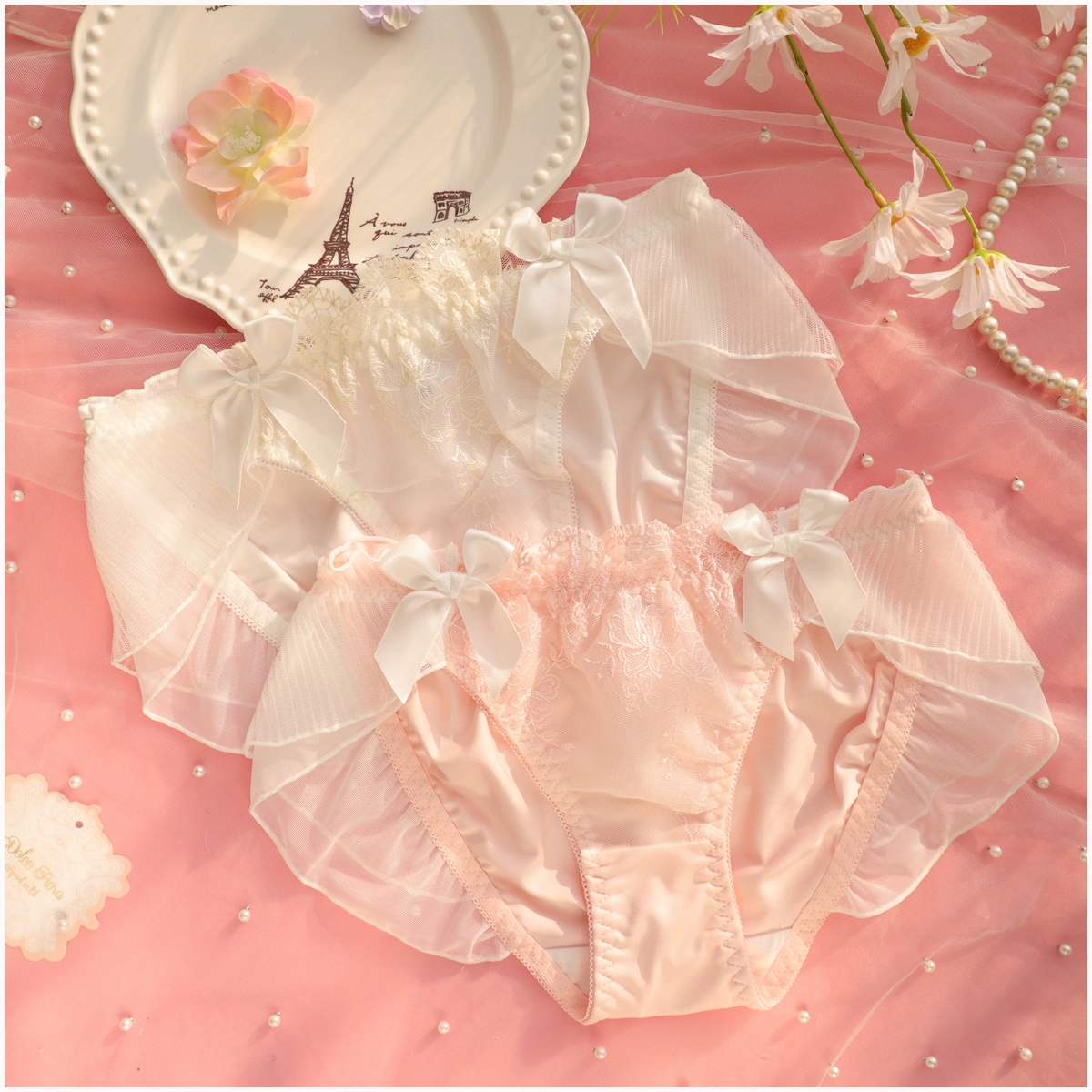 Embroidery thin section ruffled underwear girls sweet and lovely lingerie breifs sets three buckle gathered ladies bra set