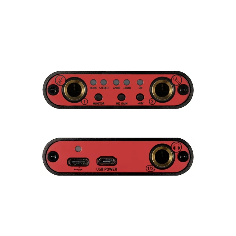 .One microphone preamp with 48V phantom power, up to 30 dB of gain, and a balanced 1/4″ TRS input