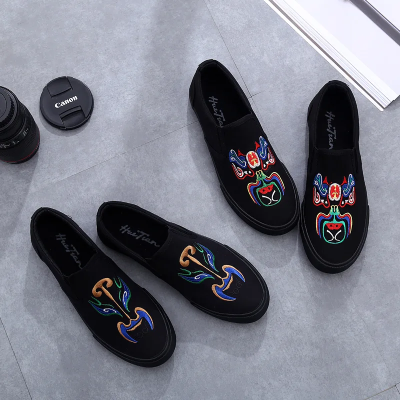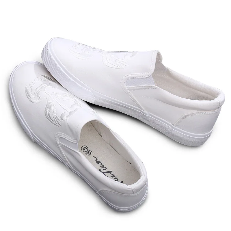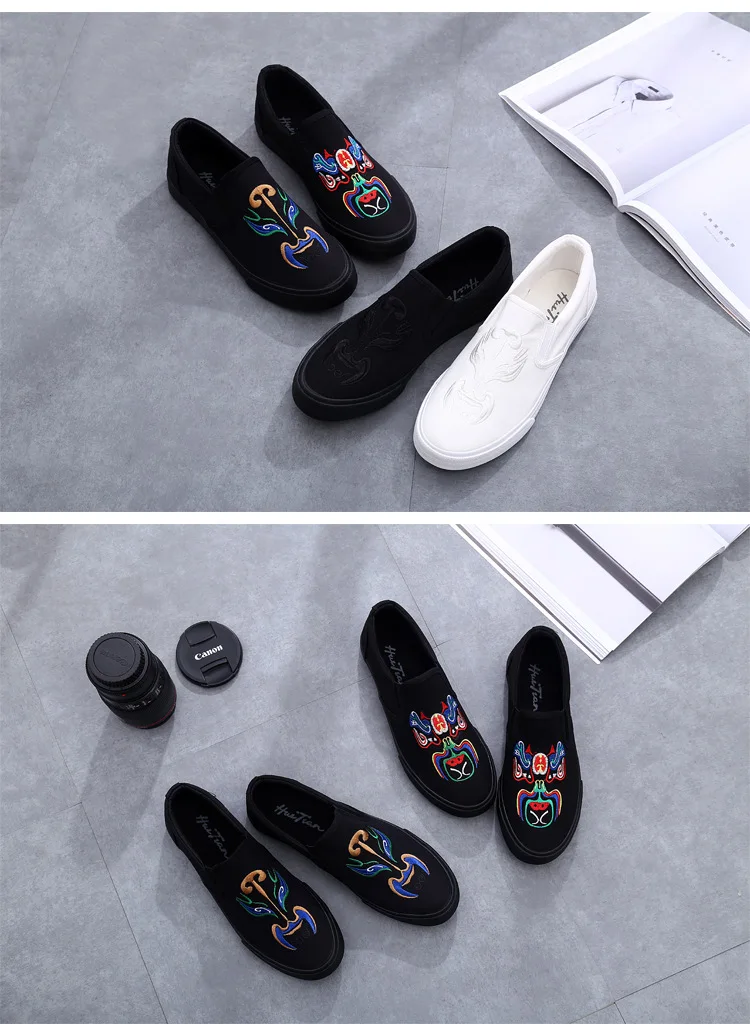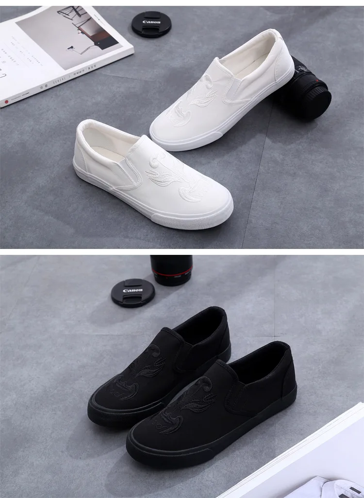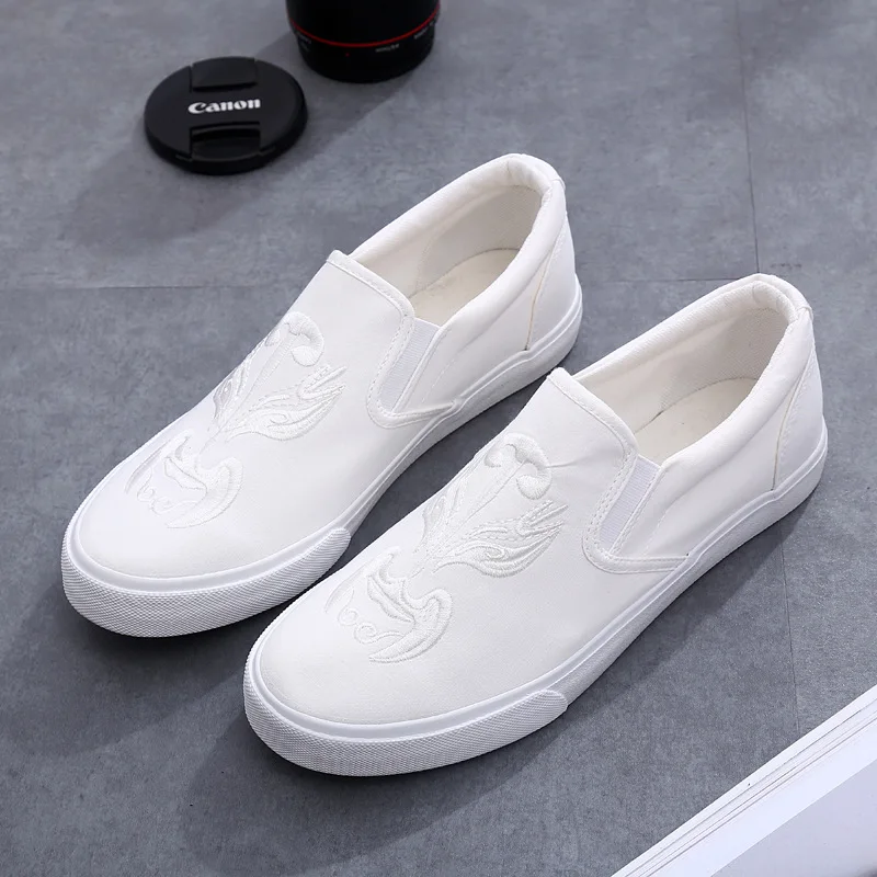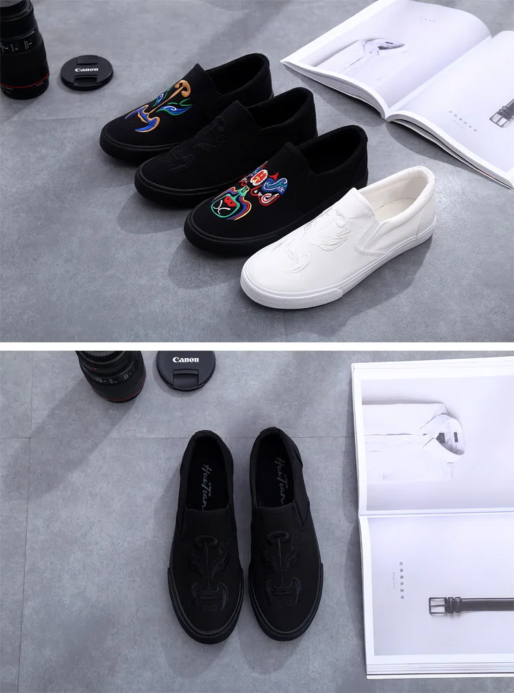 Ethnic Style White Sneakers Men Embroidery Casual Shoes Slip on Canvas Shoes Men Loafers Comfortable Vulcanized Shoes