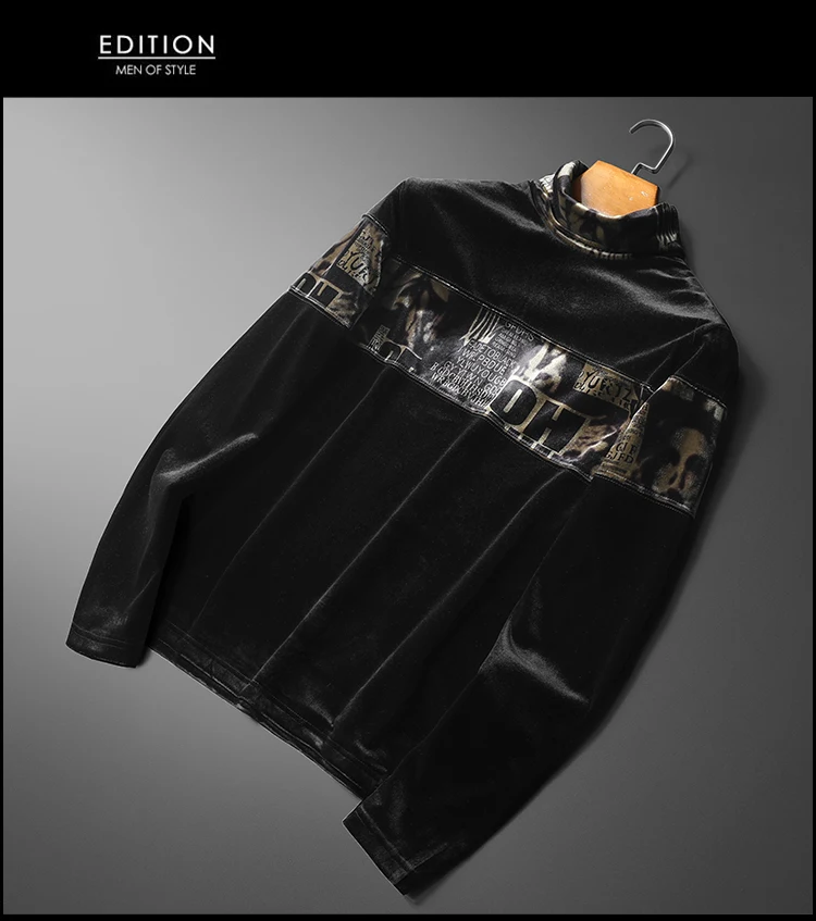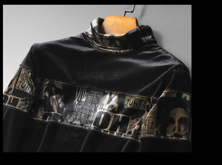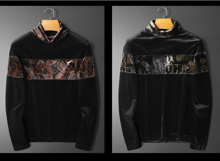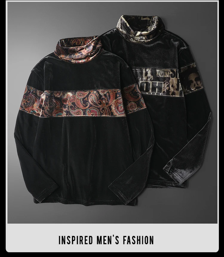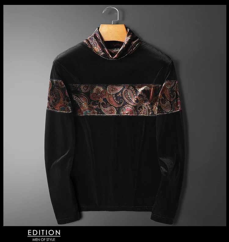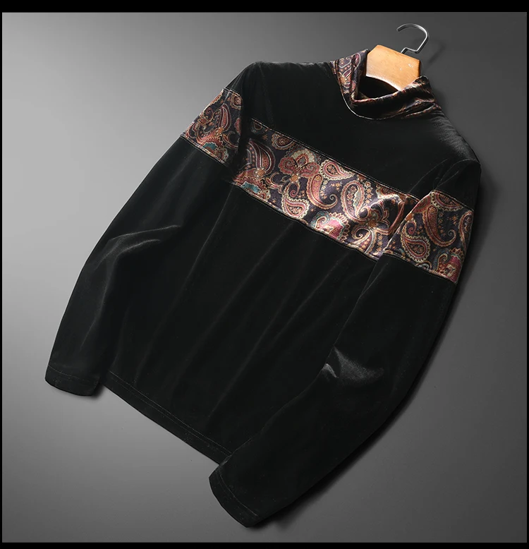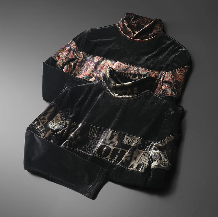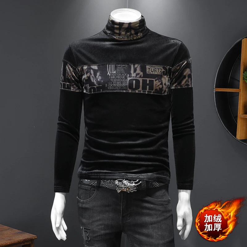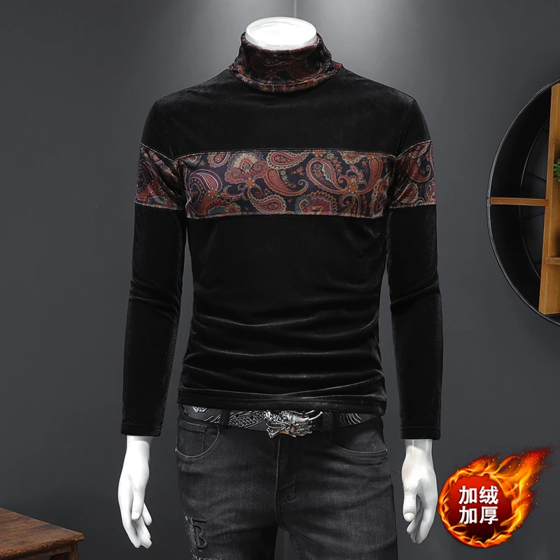 European Style Vintage Print Slim Turtleneck Long Sleeve T-Shirt Winter New Thick Mens Designer Clothes Velvet Quality Camisetas