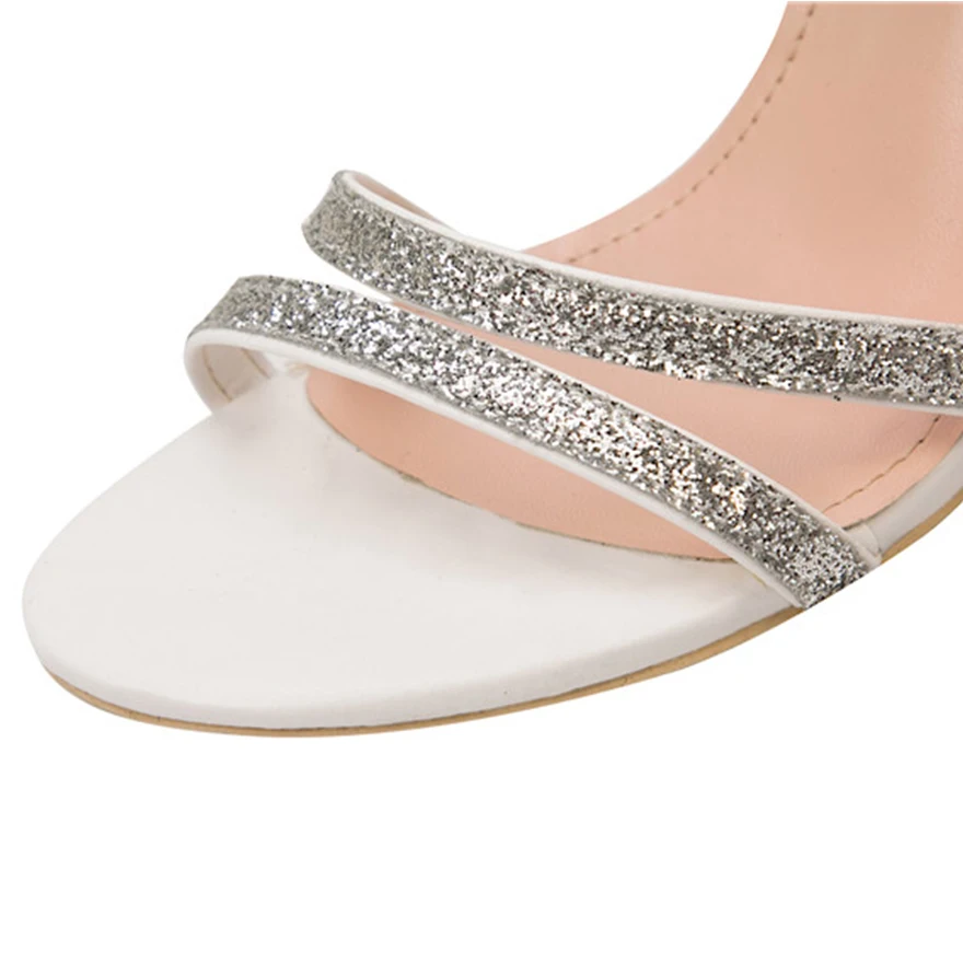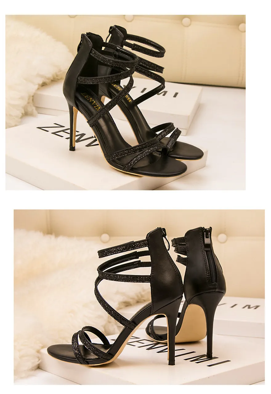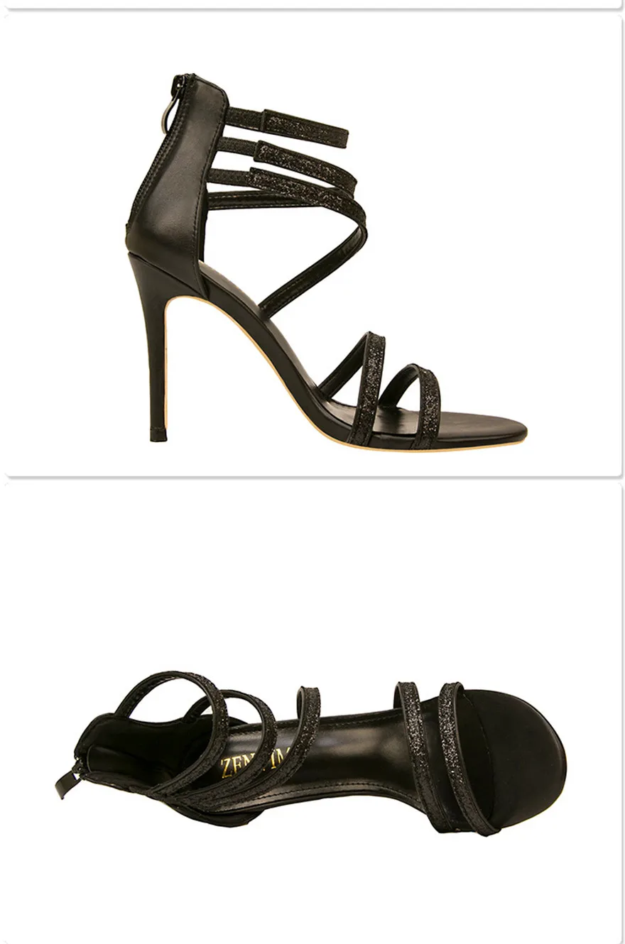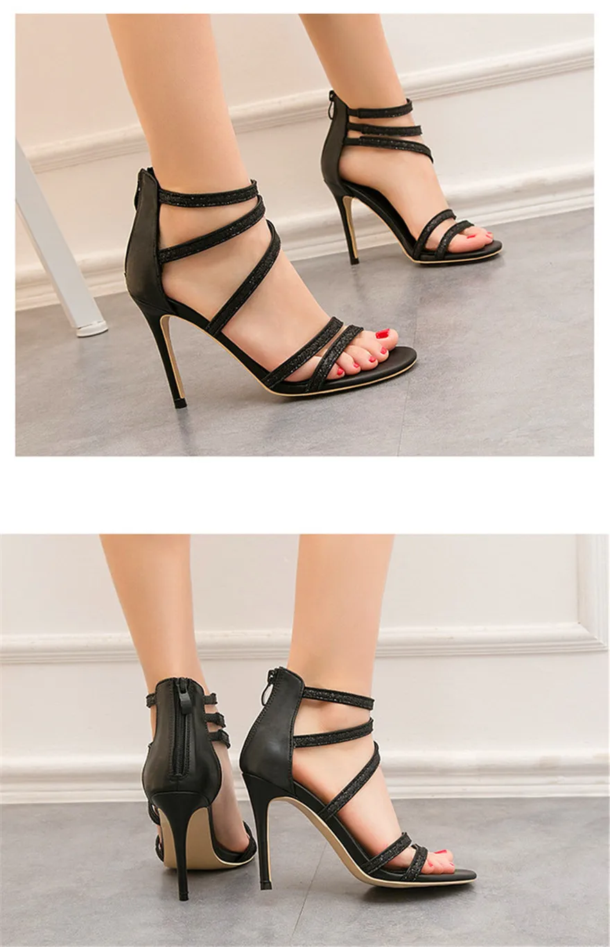 Fashion Women Sandals Bling High Heels Summer Leather Shoes Classics Black White Open Toe Zip Cover Heel Woman Party Shoes