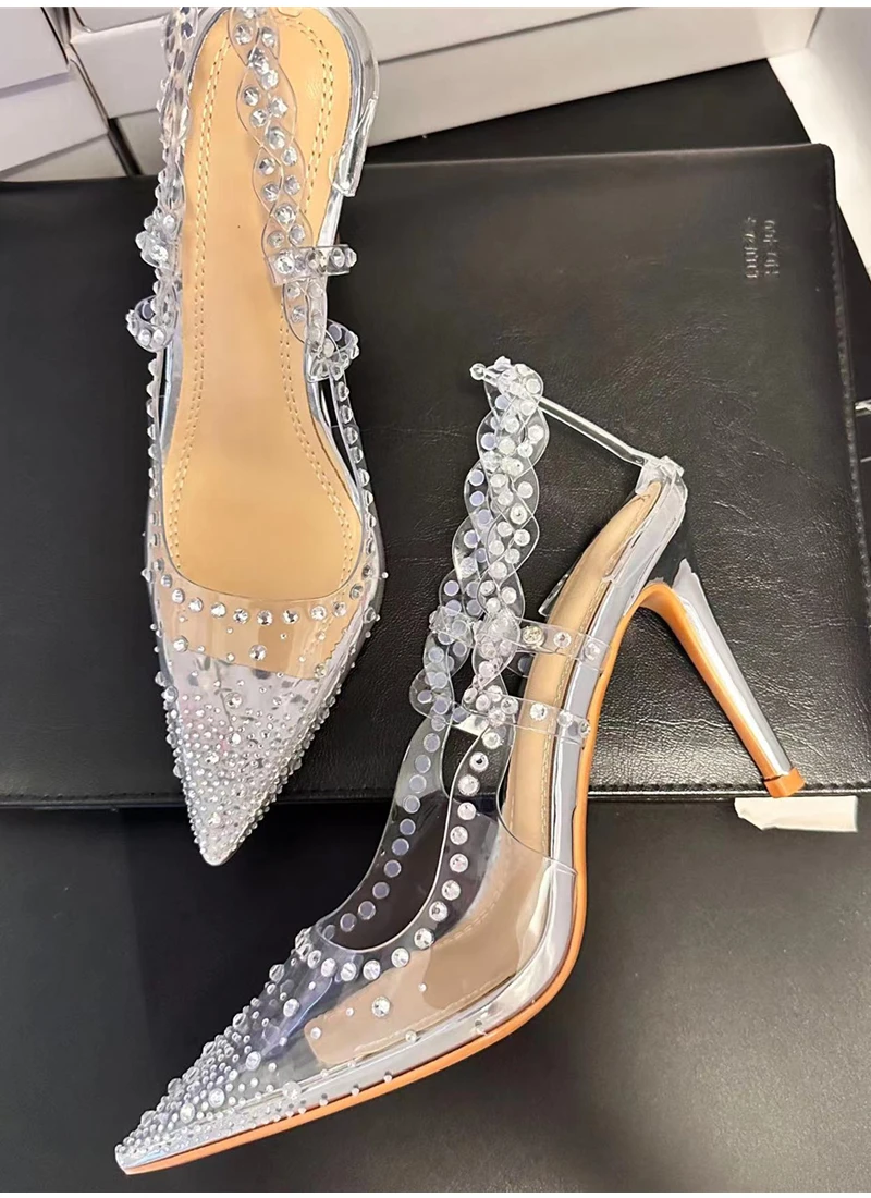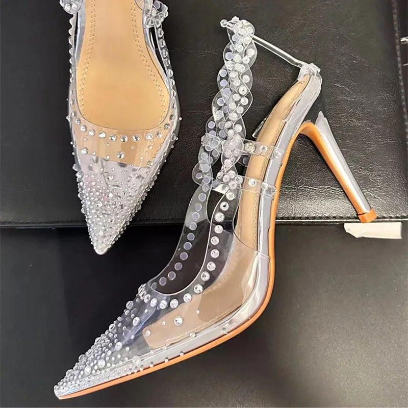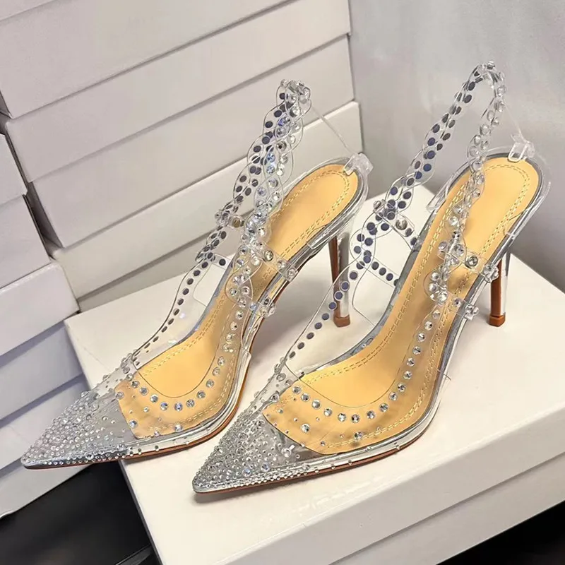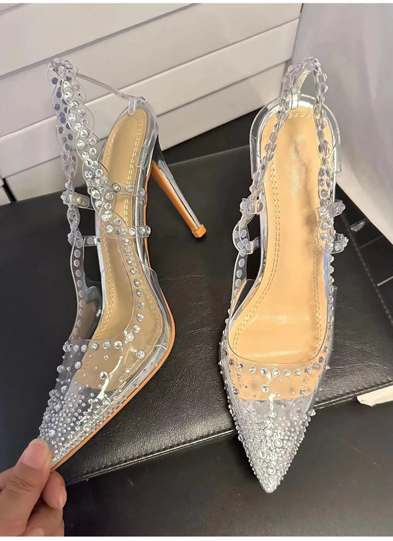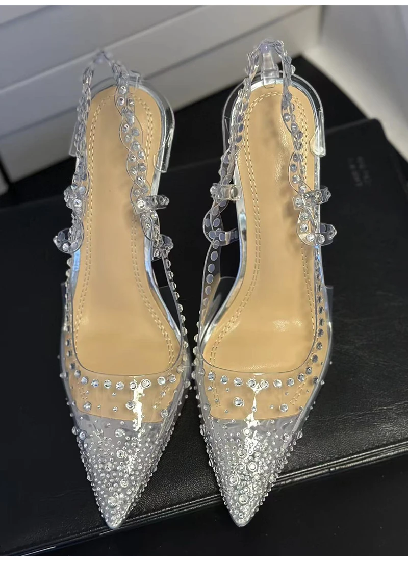 Fashion Brand Soft Clear PVC Women Pumps Elegant Pointed toe Slingbacks Rhinestones High heels Summer Autumn Party Prom Shoes