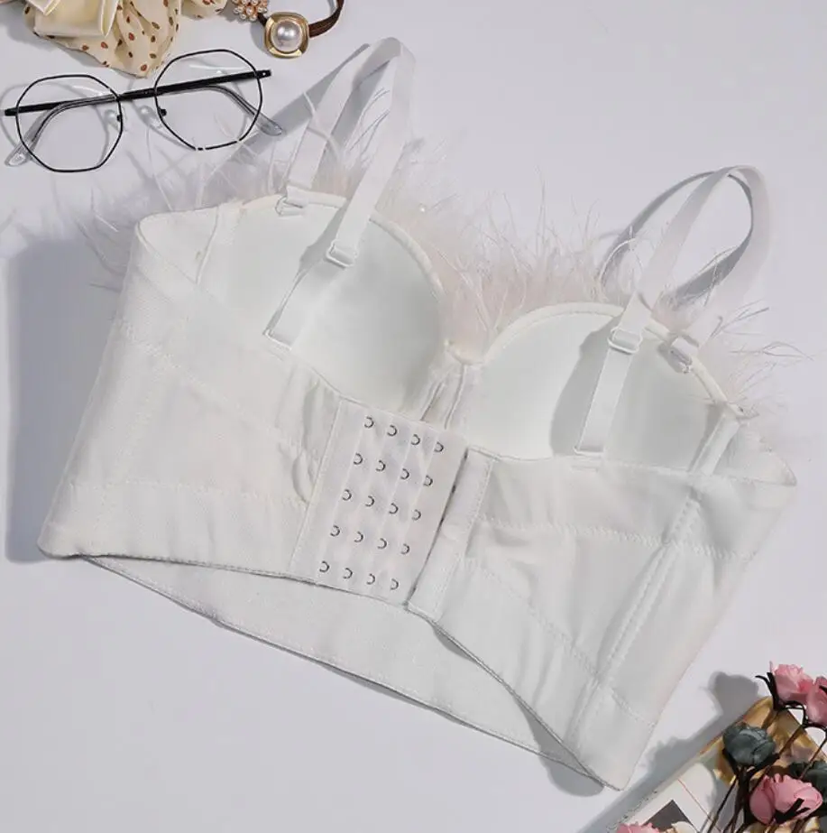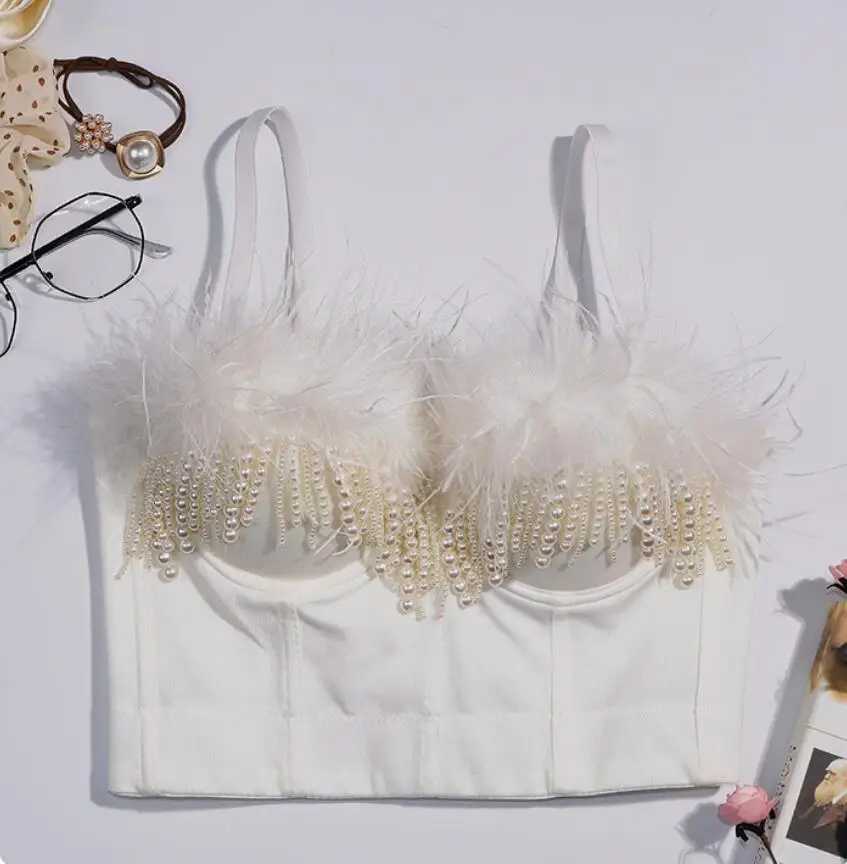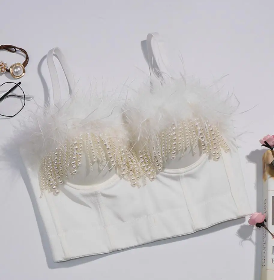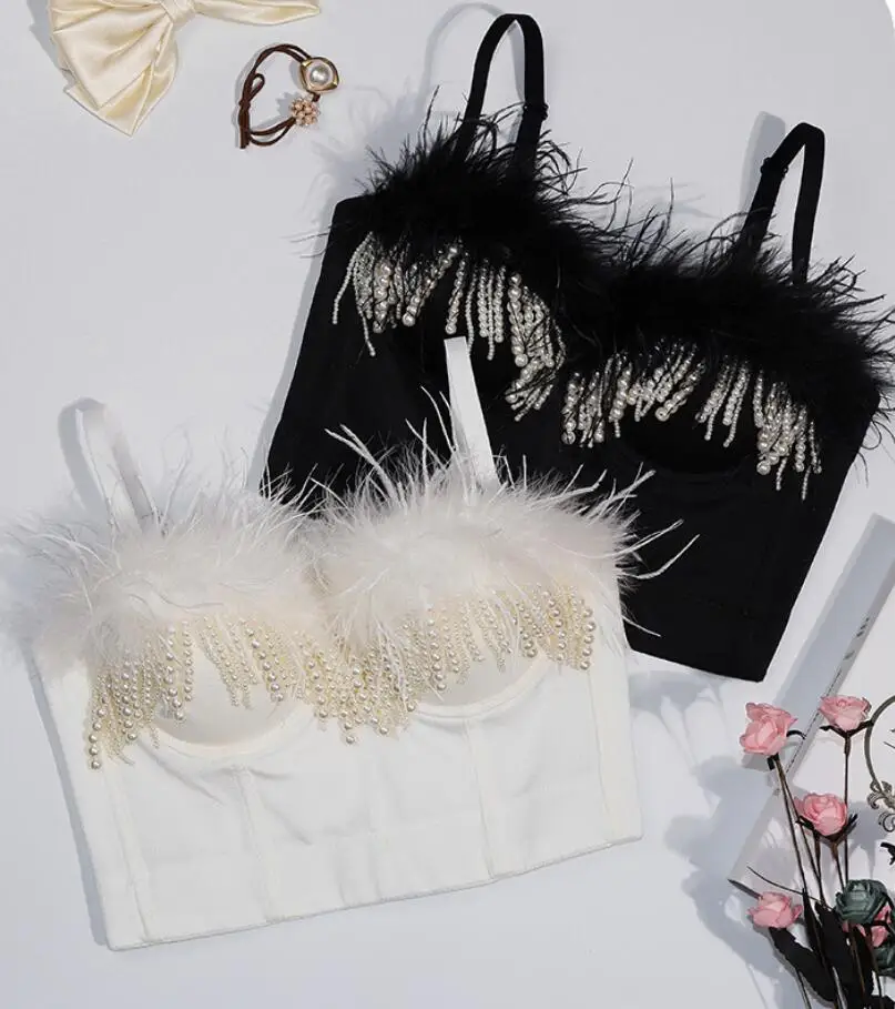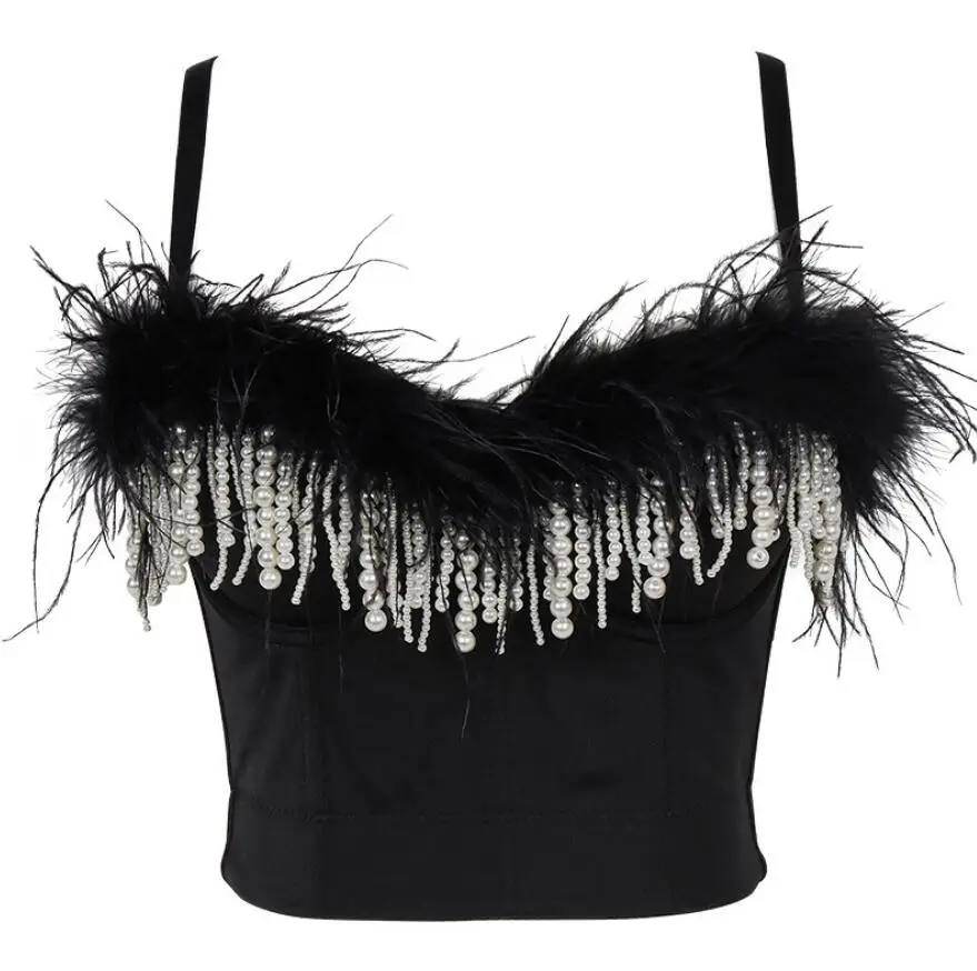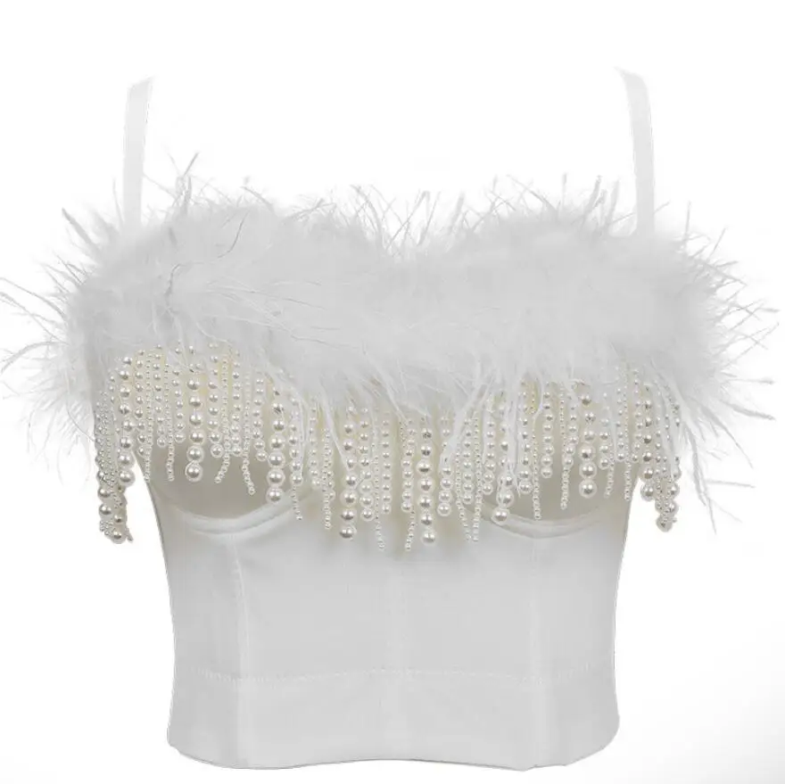 Fashion Luxury Feather Pearls Tassel Women Bustier Black White Sexy Sling Waist straps Chest Binder Punk Club Bra Corset q139