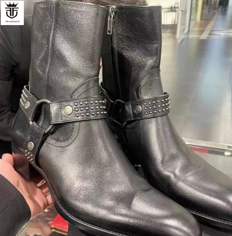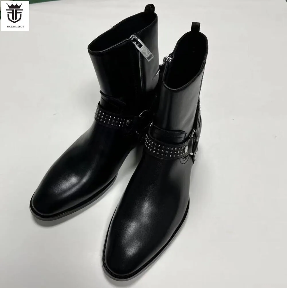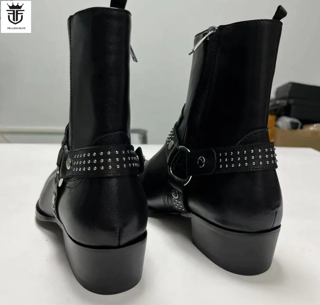 Fashion mens Black real leather boots side zip ankle booties beading stud male party shoes point toe men boots thick heel