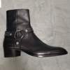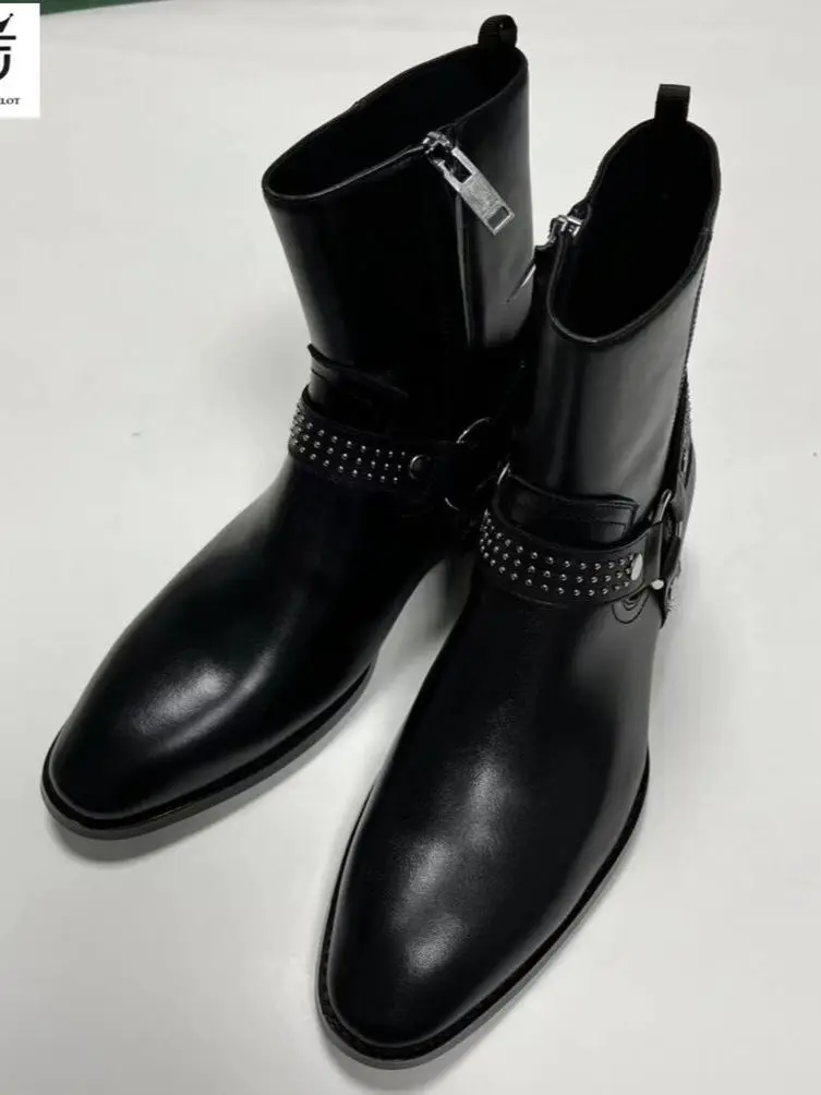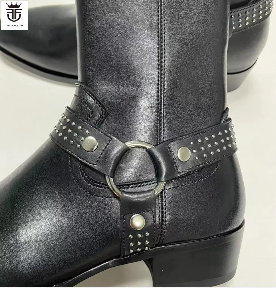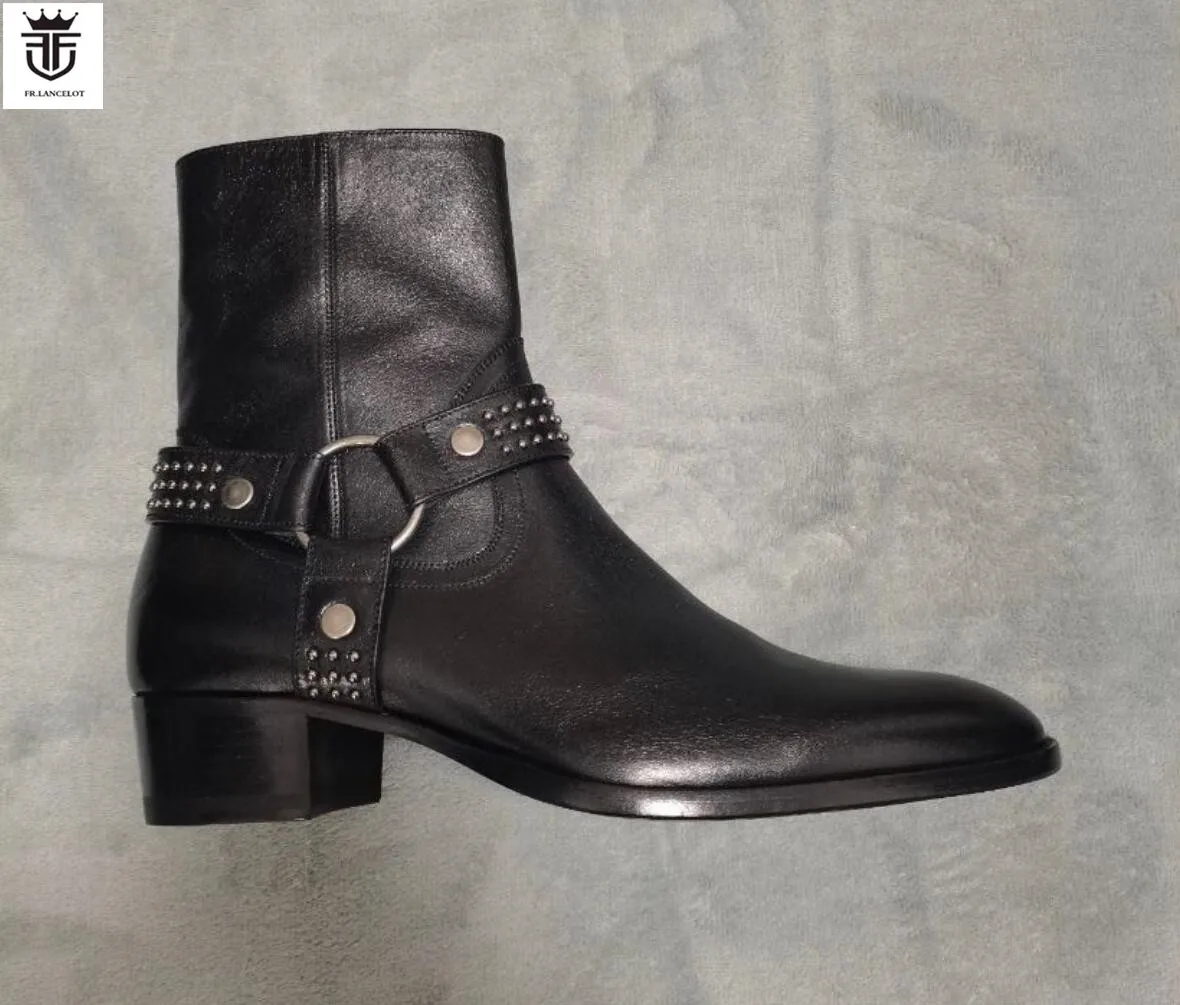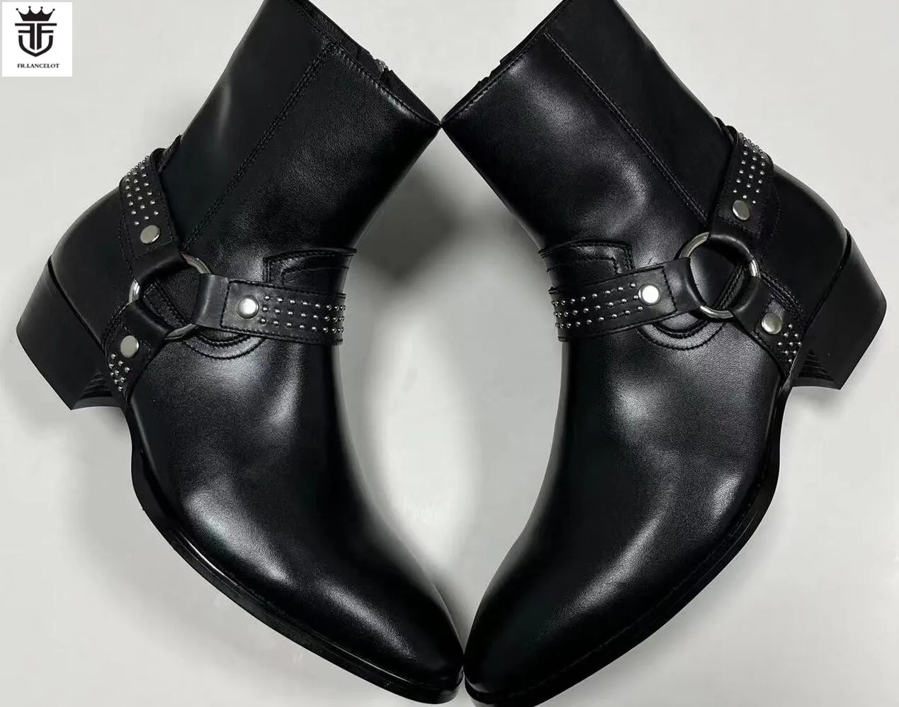 Fashion mens Black real leather boots side zip ankle booties beading stud male party shoes point toe men boots thick heel