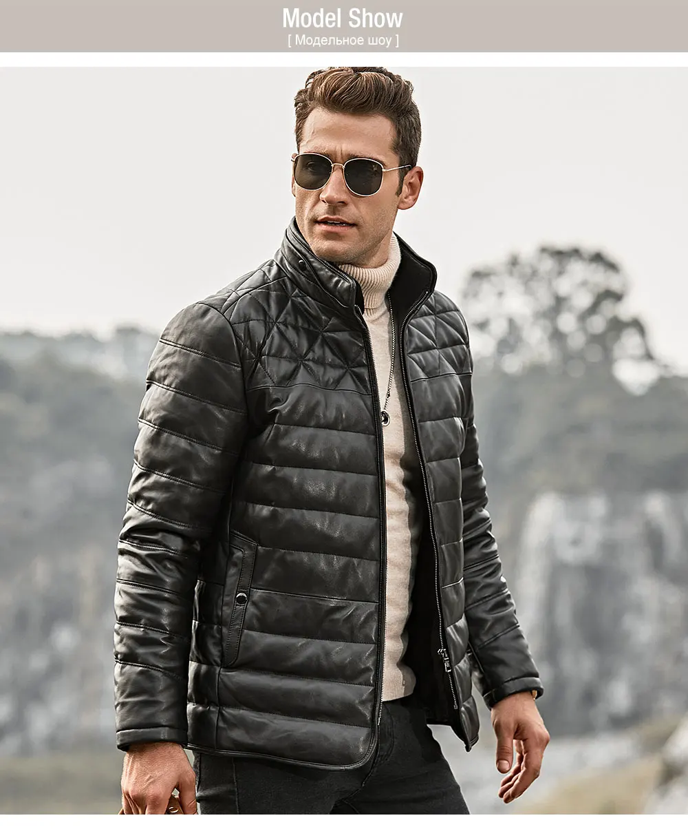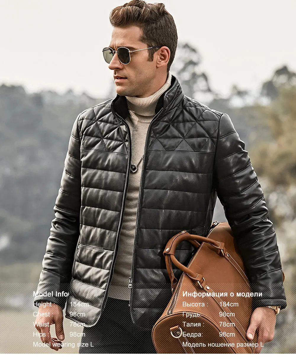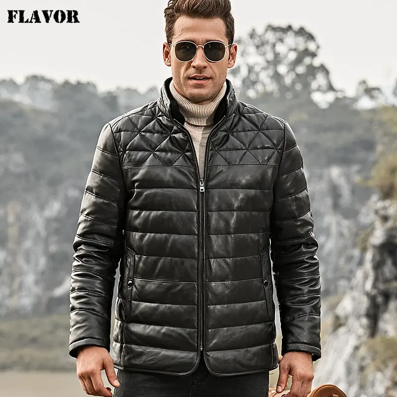 FLAVOR Men’s Real Leather Down Jacket Men Genuine Lambskin Winter Warm Leather Coat with Removable Sheep Fur Collar