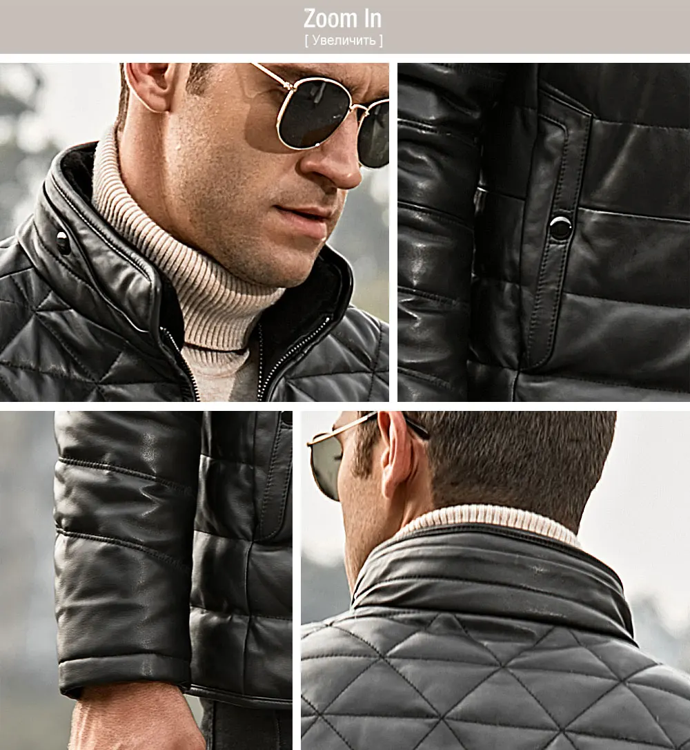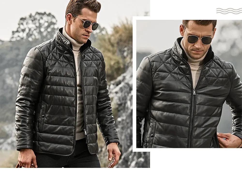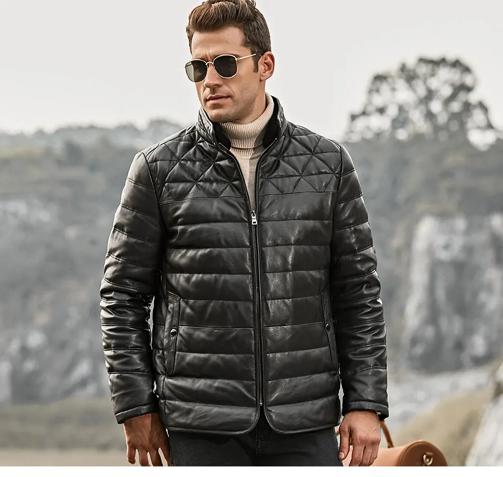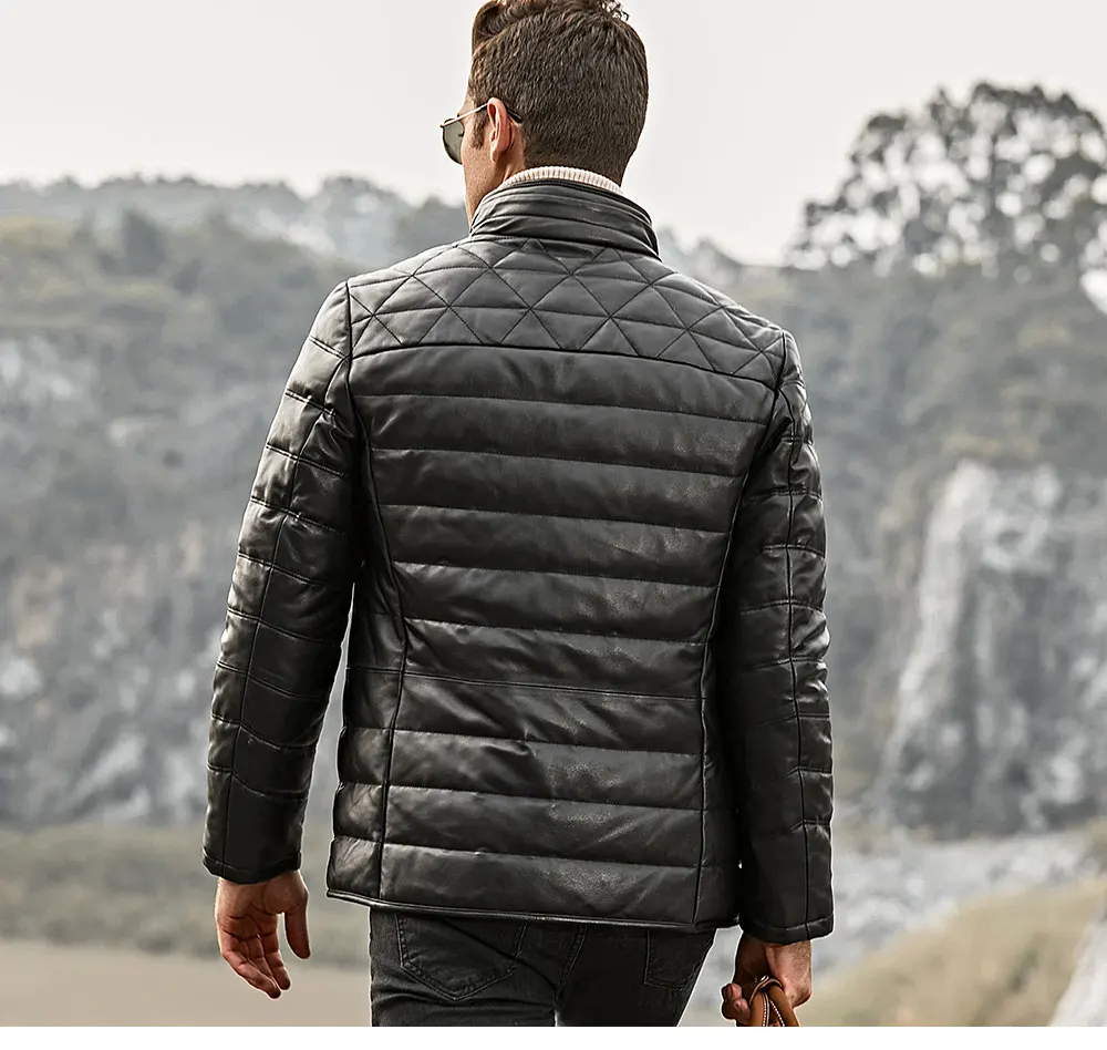 FLAVOR Men’s Real Leather Down Jacket Men Genuine Lambskin Winter Warm Leather Coat with Removable Sheep Fur Collar
