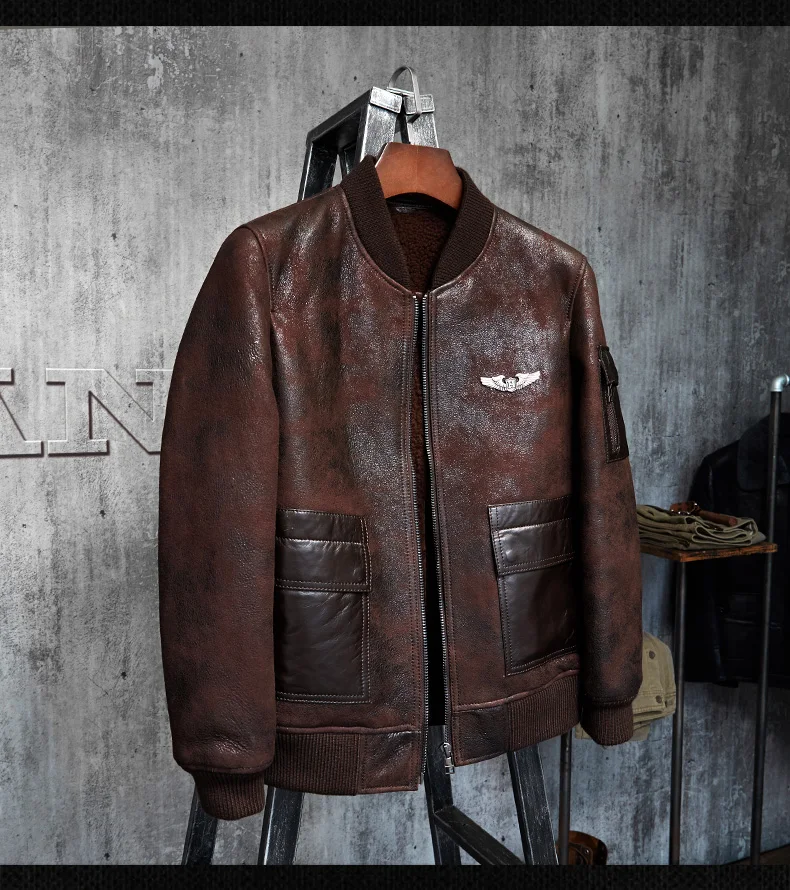 Flight Jacket Short Fur Leather Jacket Men’s Shearling Coat Imported Wool From Australia Man Sheepskin Aviator Fur Coat