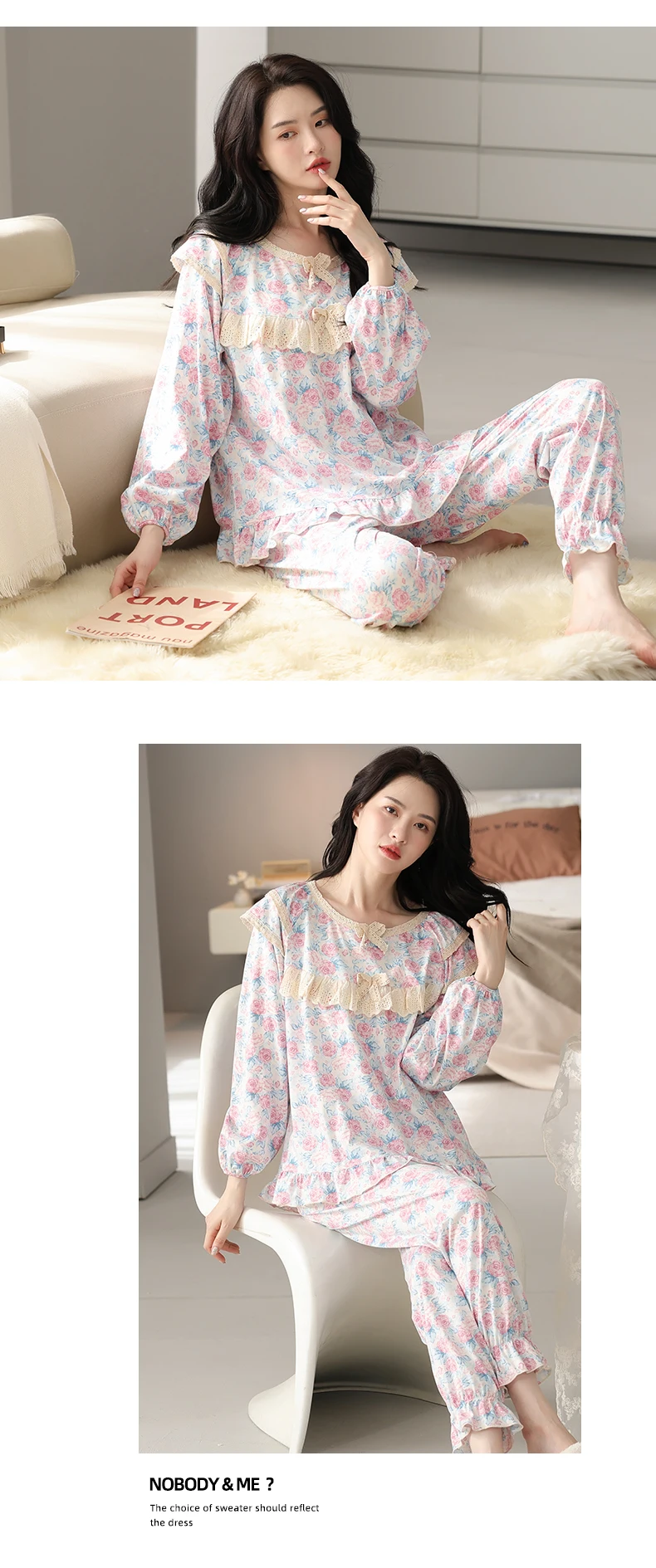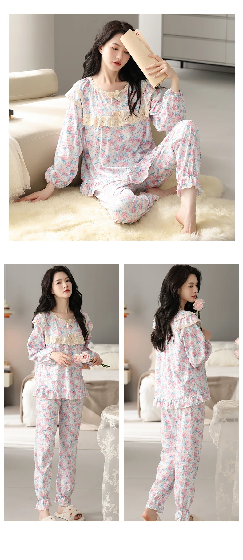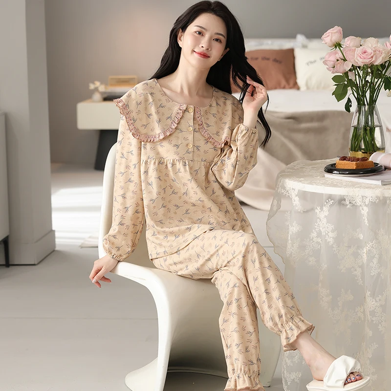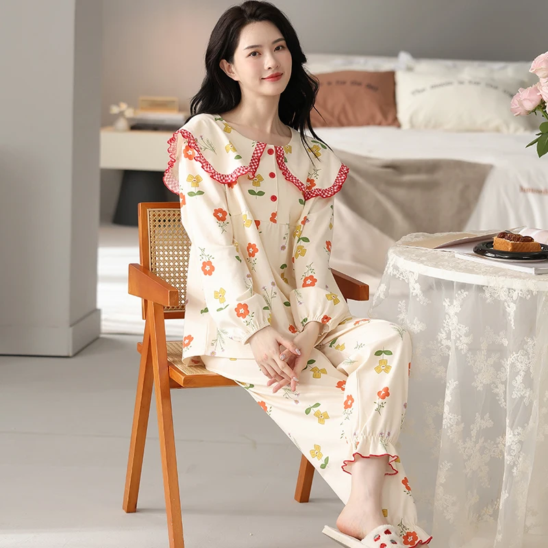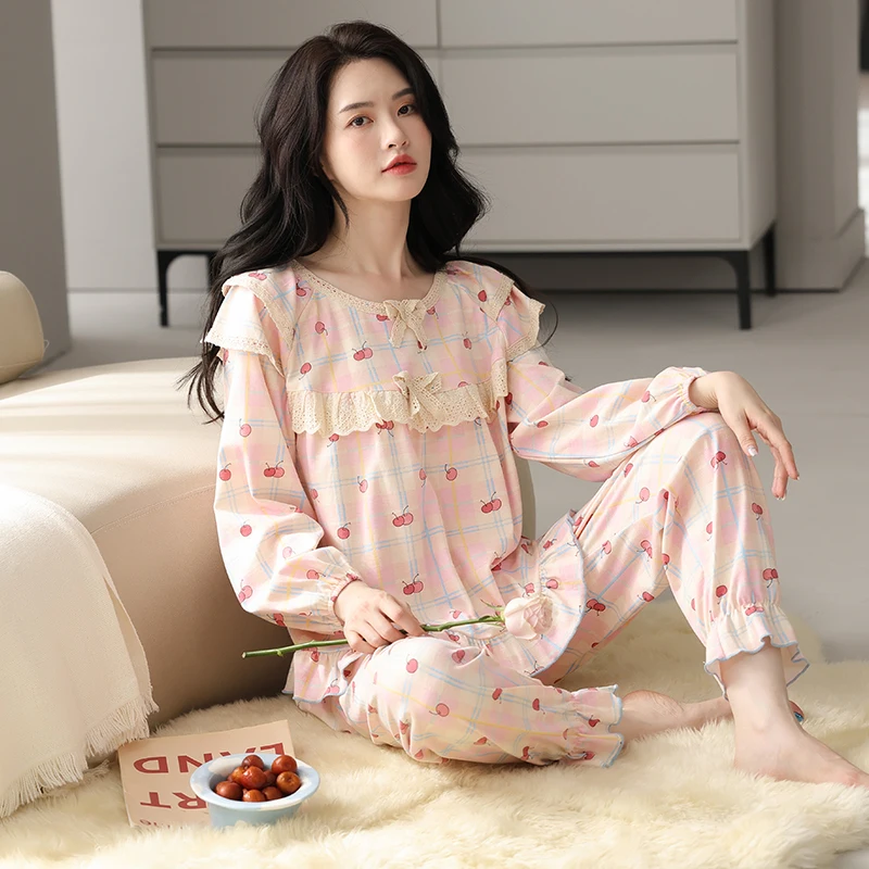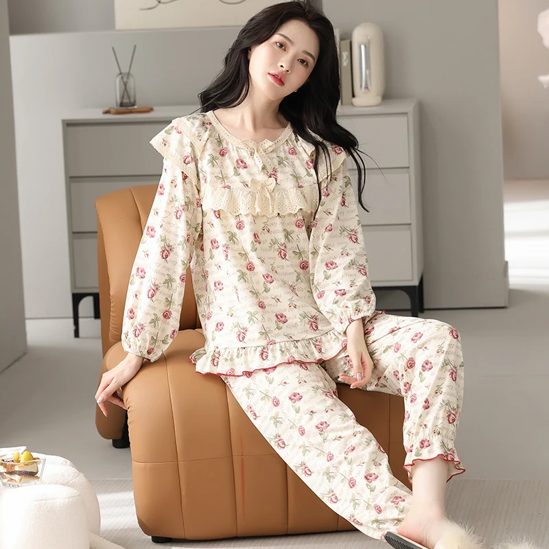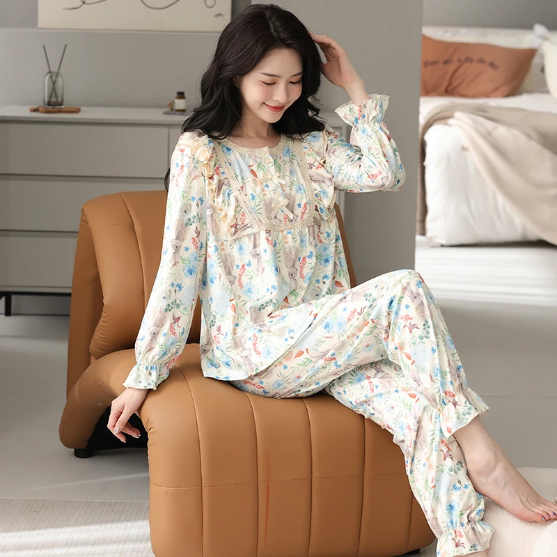 Floral Pajamas For Young Girls Spring Modal Sleepwear Princess Lace O-Neck Long Sleeve Pyjamas Female Autumn Home Suit XXXXL