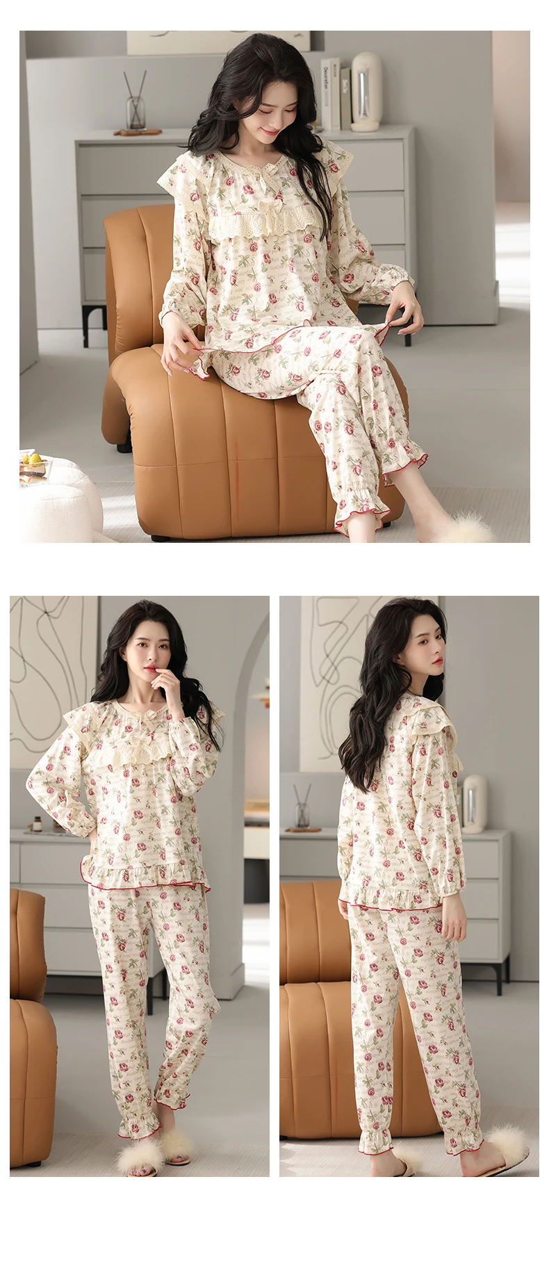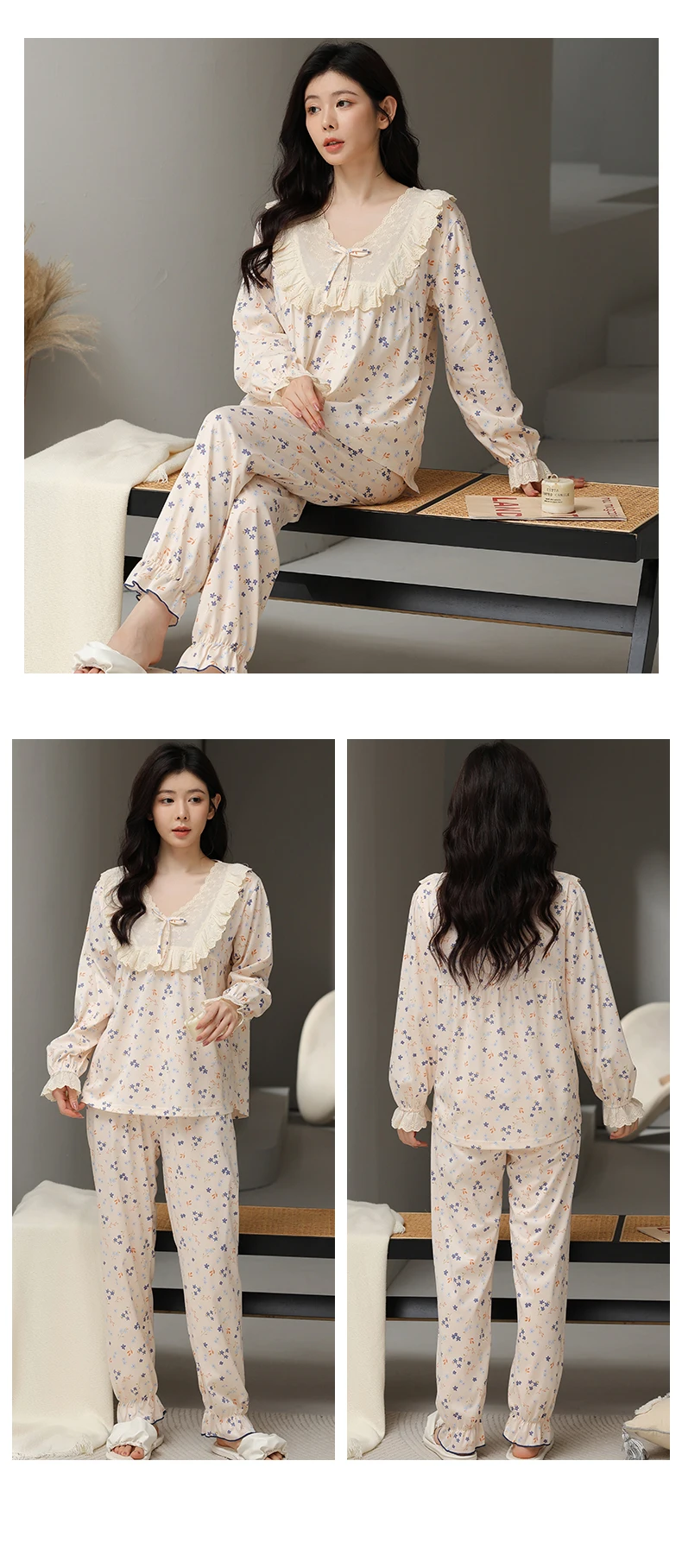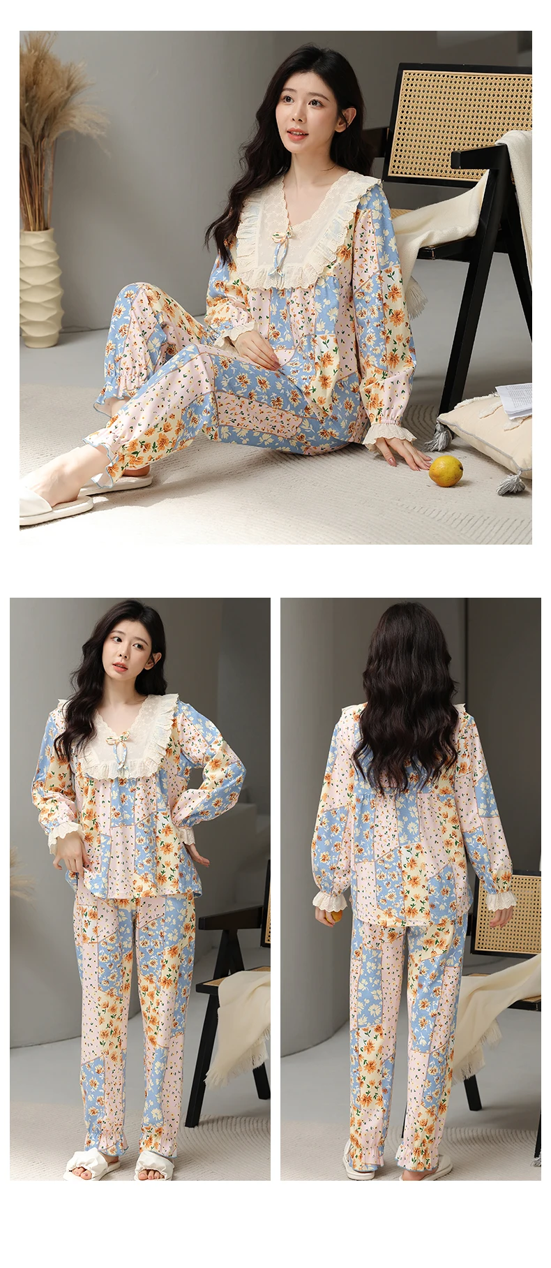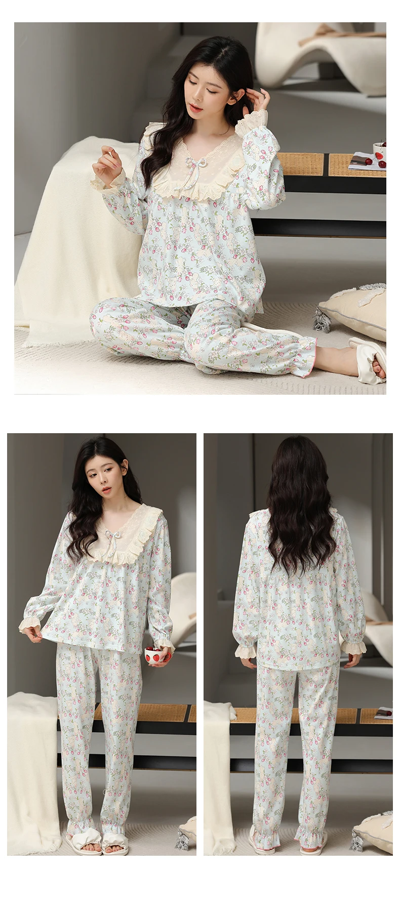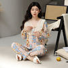 Floral Pajamas For Young Girls Spring Modal Sleepwear Princess Lace O-Neck Long Sleeve Pyjamas Female Autumn Home Suit XXXXL