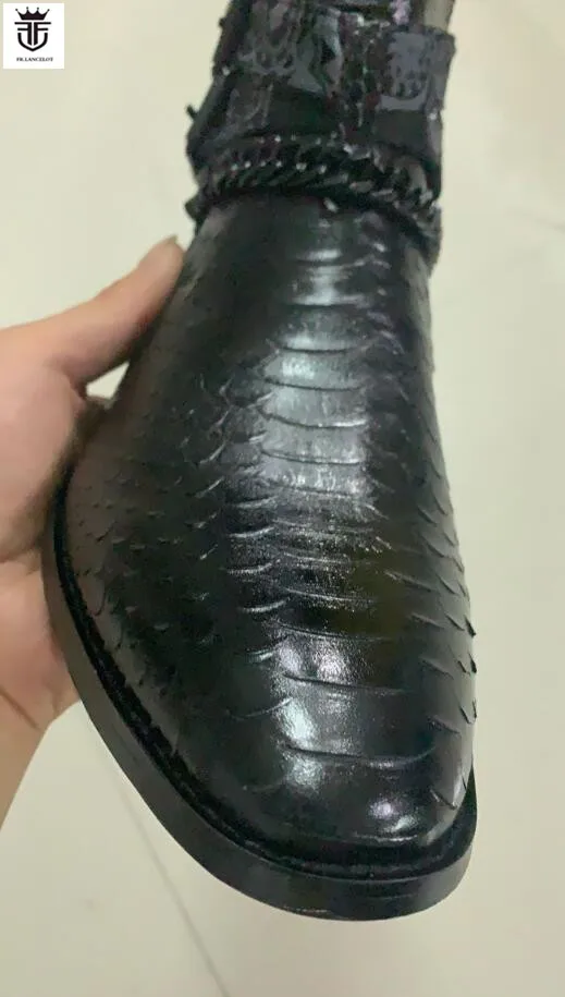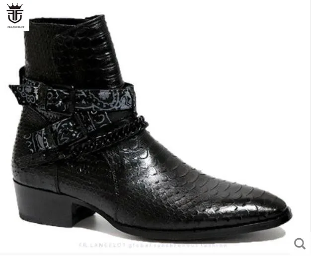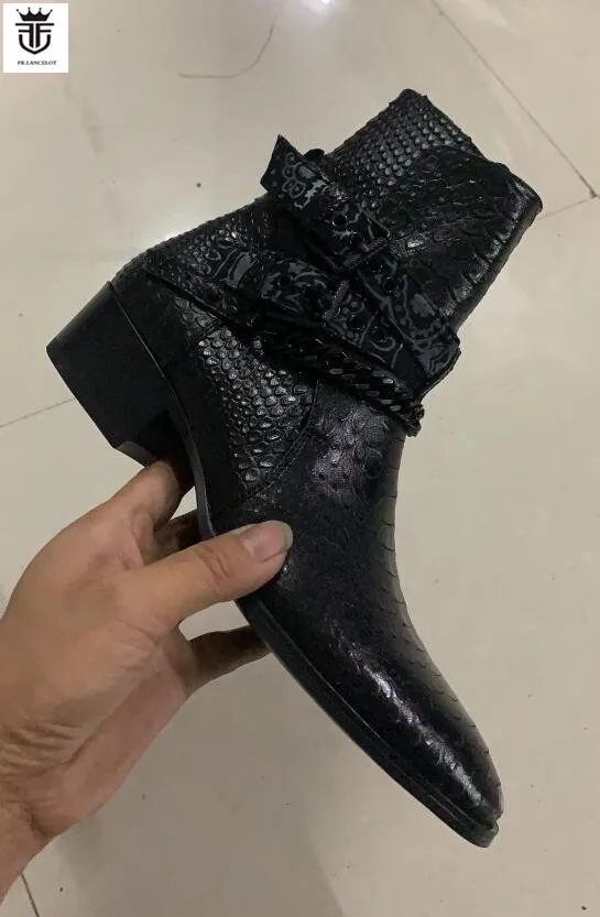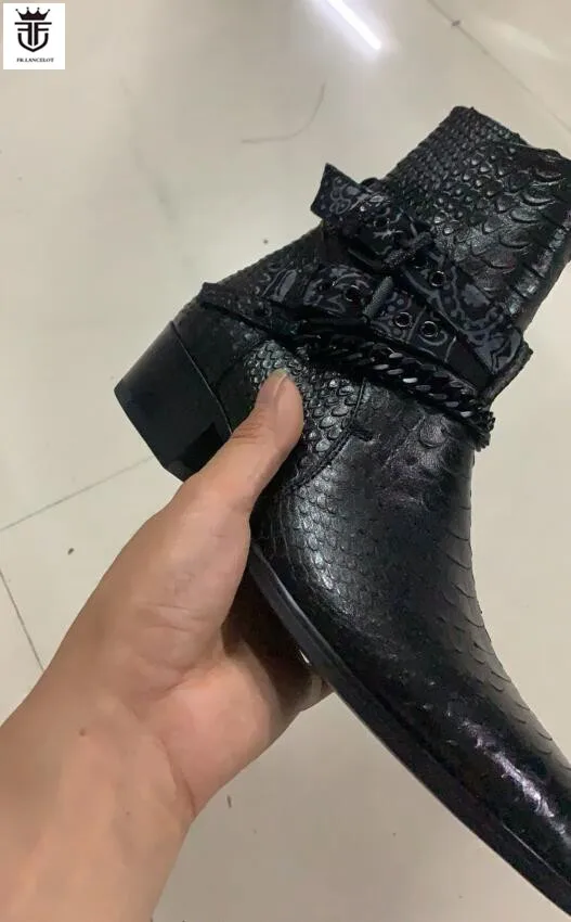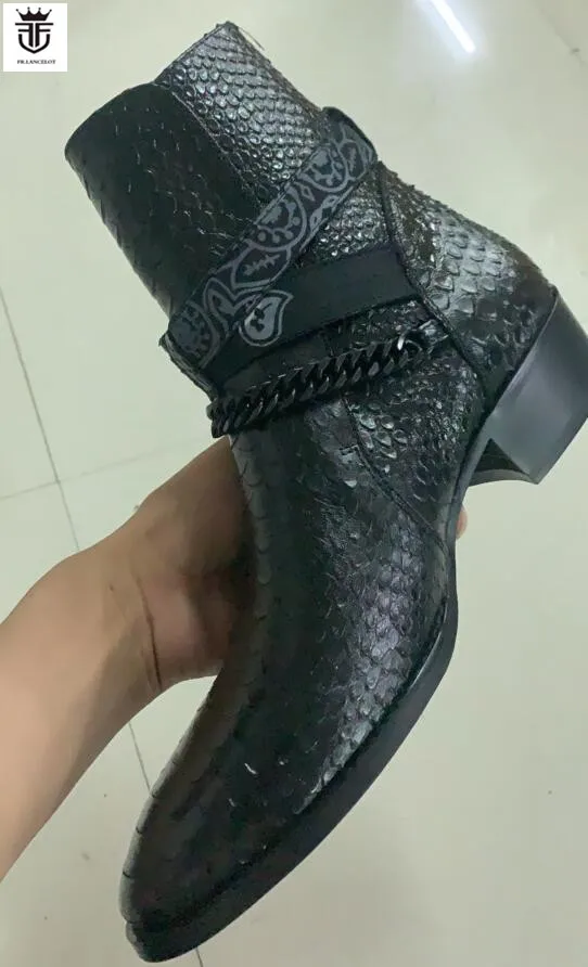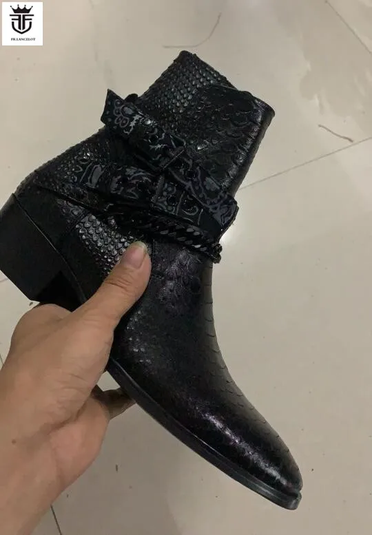 FR.LANCELOT 2020 New men boot snakeskin print leather ankle boots black chains booties male mujer botas party shoes men