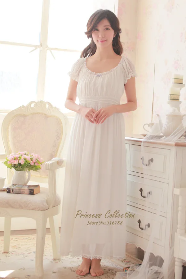 Free Shipping Classical Vintage Princess Chiffon and Modal Long Nightgown White and Purple Nightshirt Summer Sleepwear