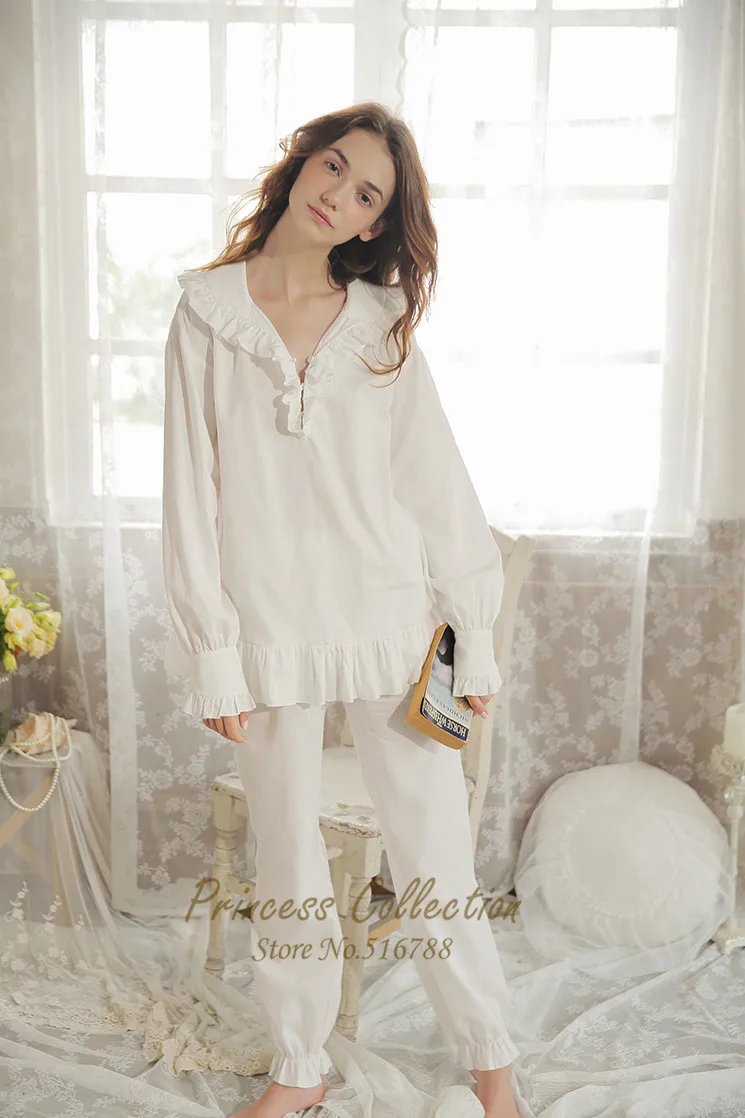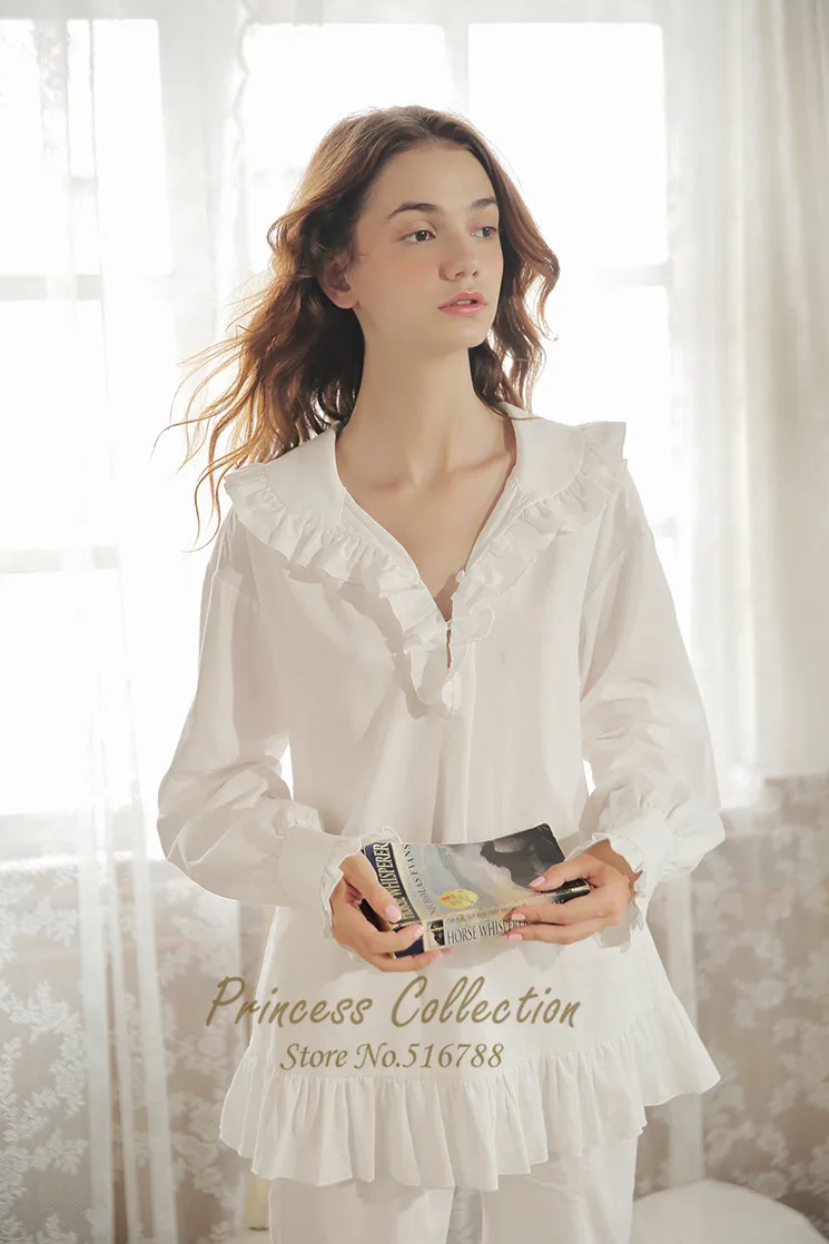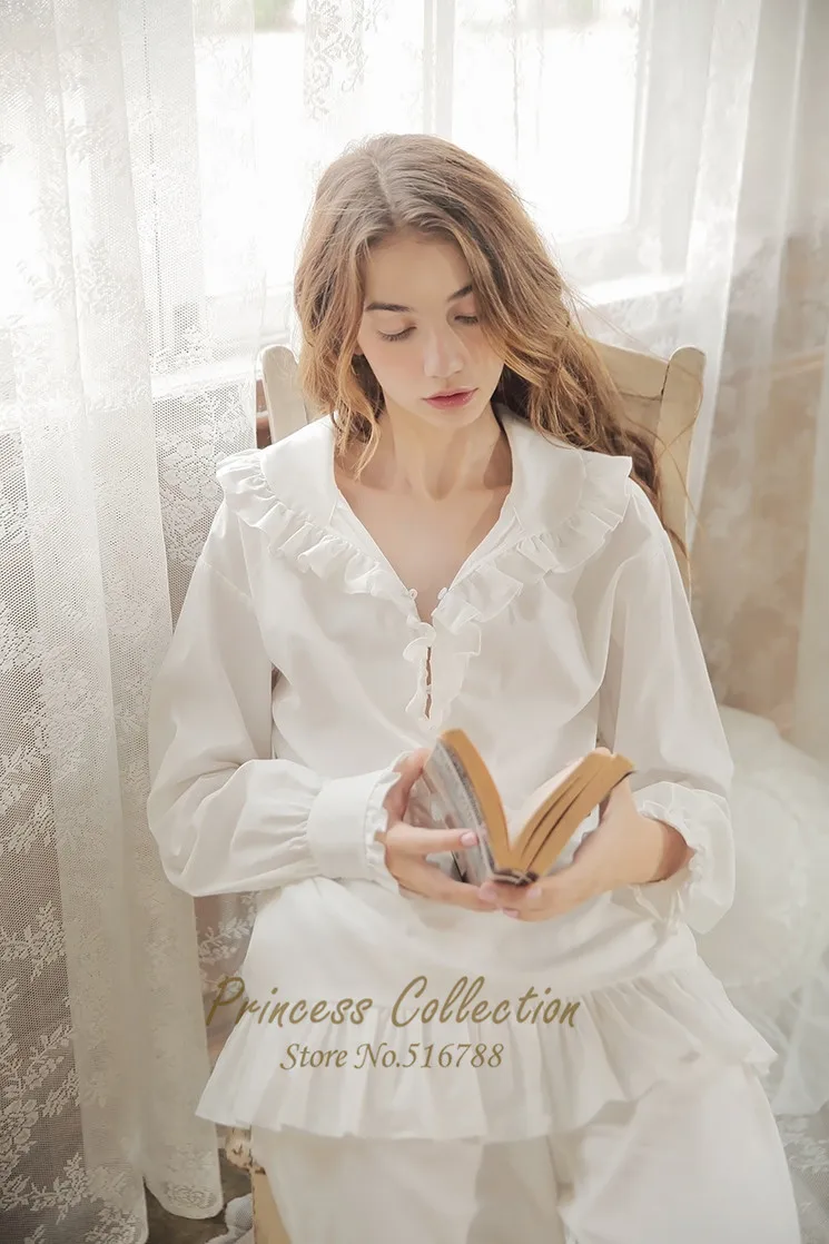 Free Shipping New Autumn Princess Women’s Pajamas Long Pants Set White Sleepwear 100% Cotton Nightshirt Vintage Nightgown
