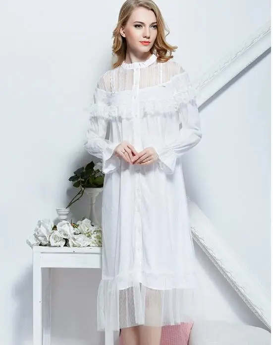 Free Shipping New Autumn Women’s Long Blue and White Vintage Pyjamas Lace Sleepwear Cotton Nightgown Lady Royal Nightshirt