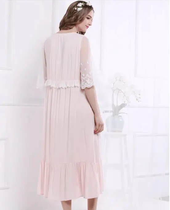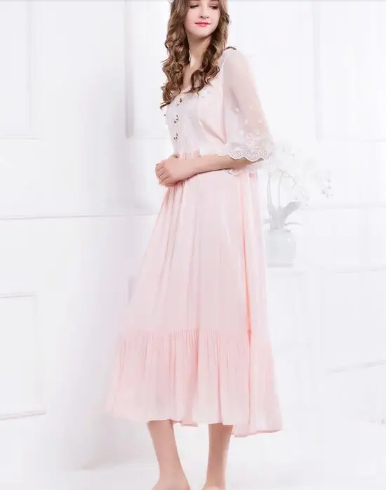 Free Shipping New Summer Princess Nightdress Royal Pyjamas Women’s Long Nightgown Pink Lace Sleepwear Can Outer Wear