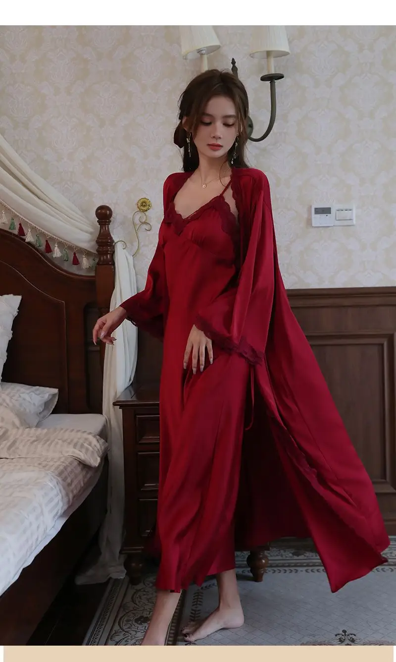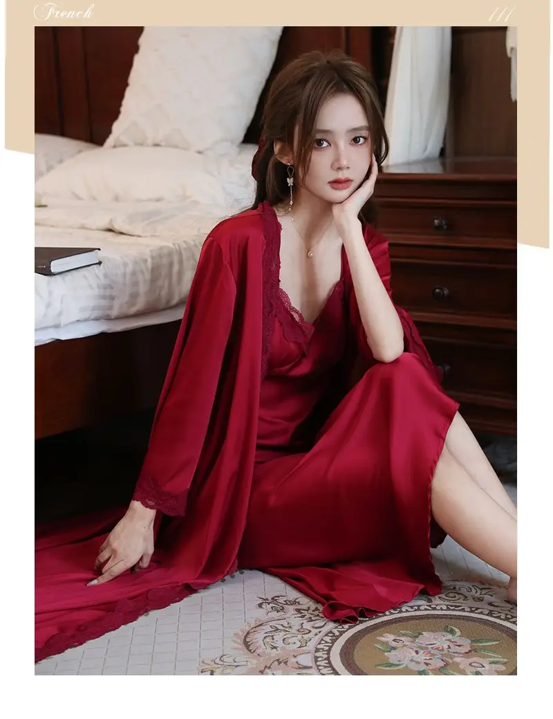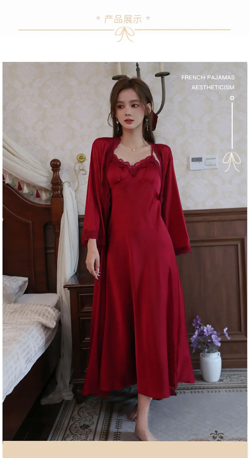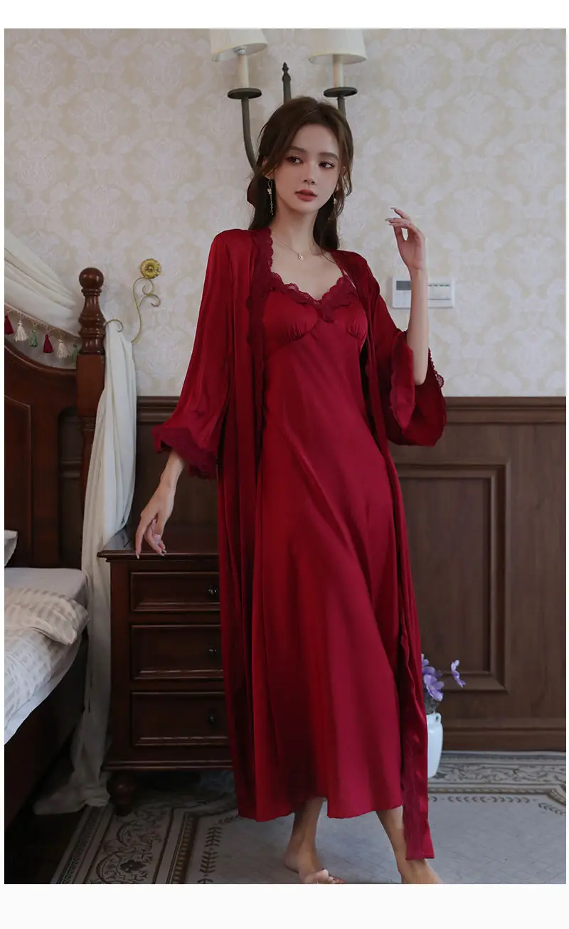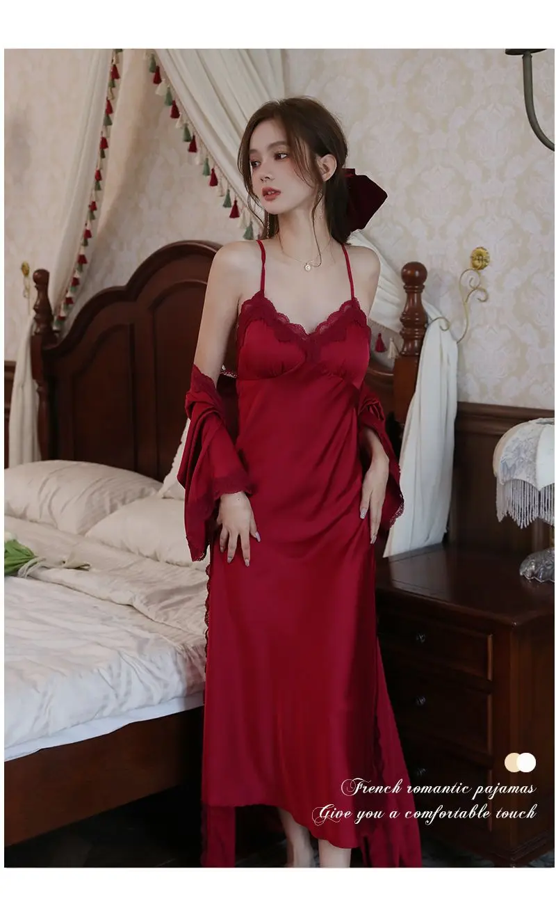 French Court Style Long pajamas V-neck Lace Nightdress Red Nightwear Retro Lace Nightgown Nighty for Ladies Bridal Dressing Gown