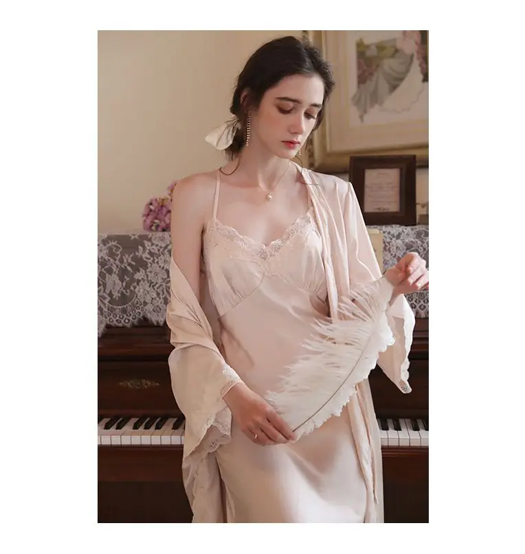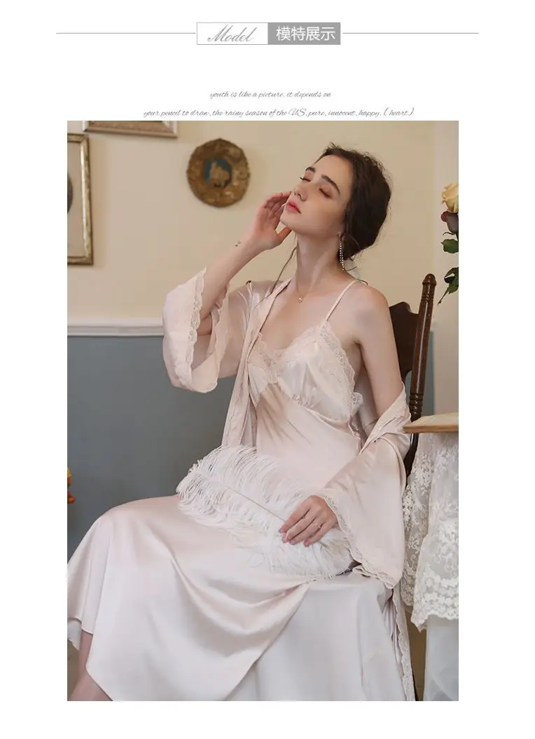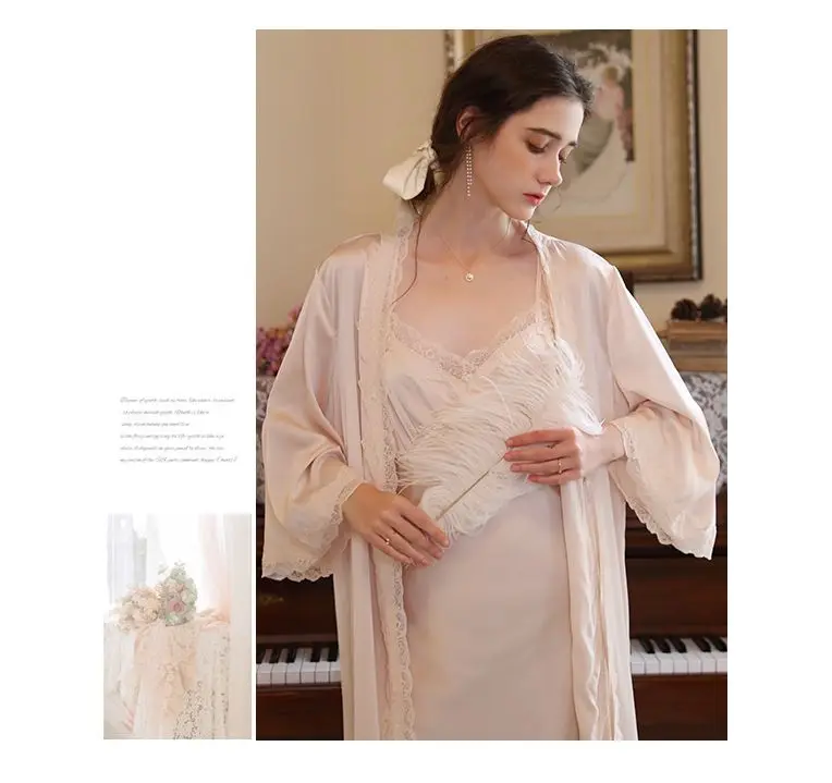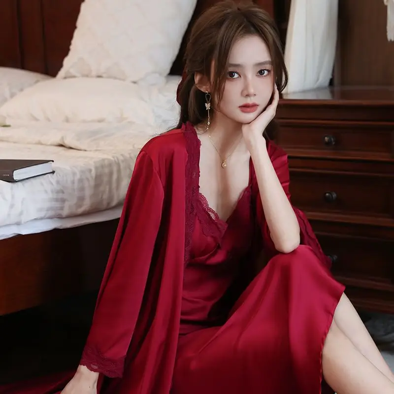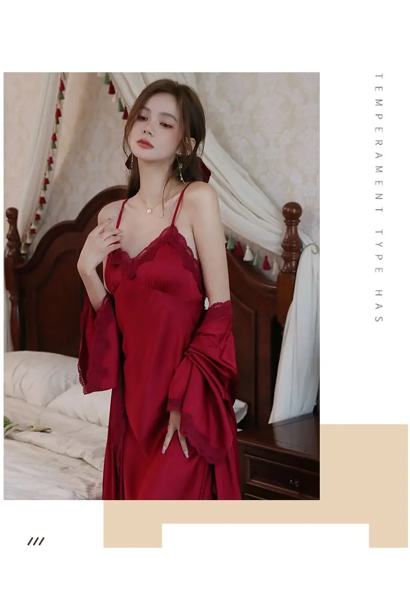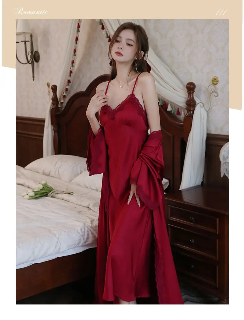 French Court Style Long pajamas V-neck Lace Nightdress Red Nightwear Retro Lace Nightgown Nighty for Ladies Bridal Dressing Gown