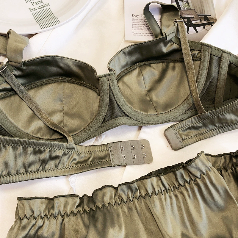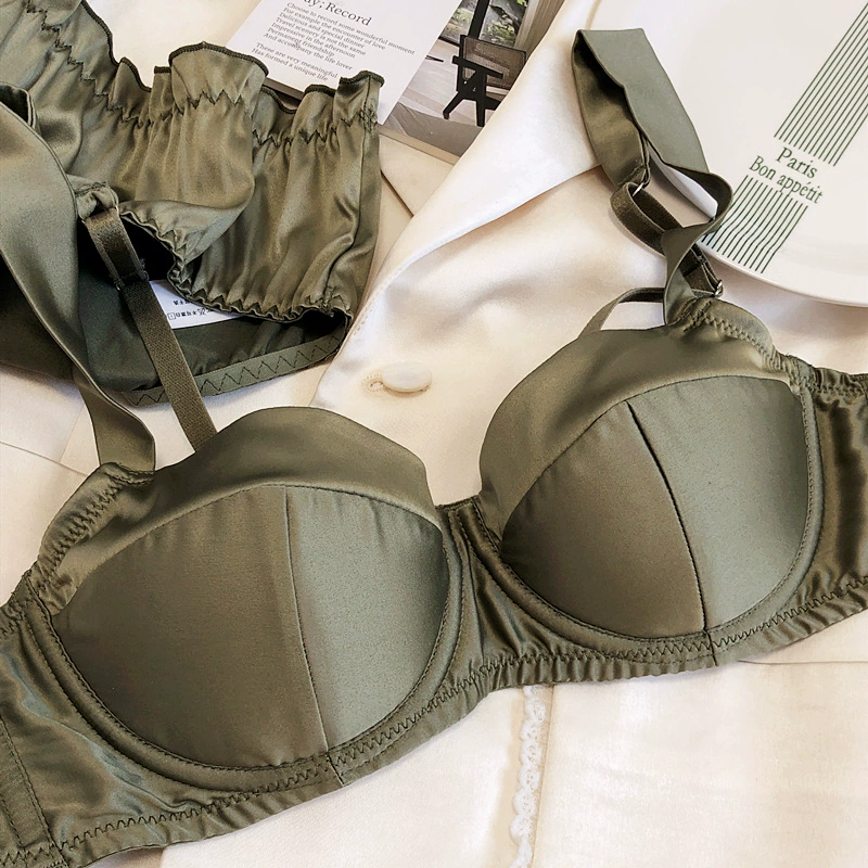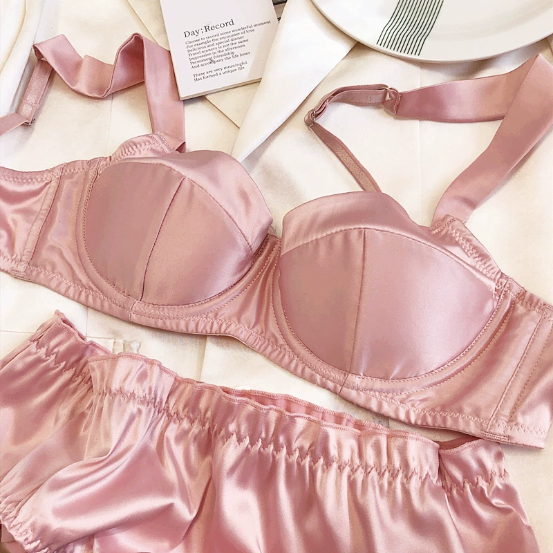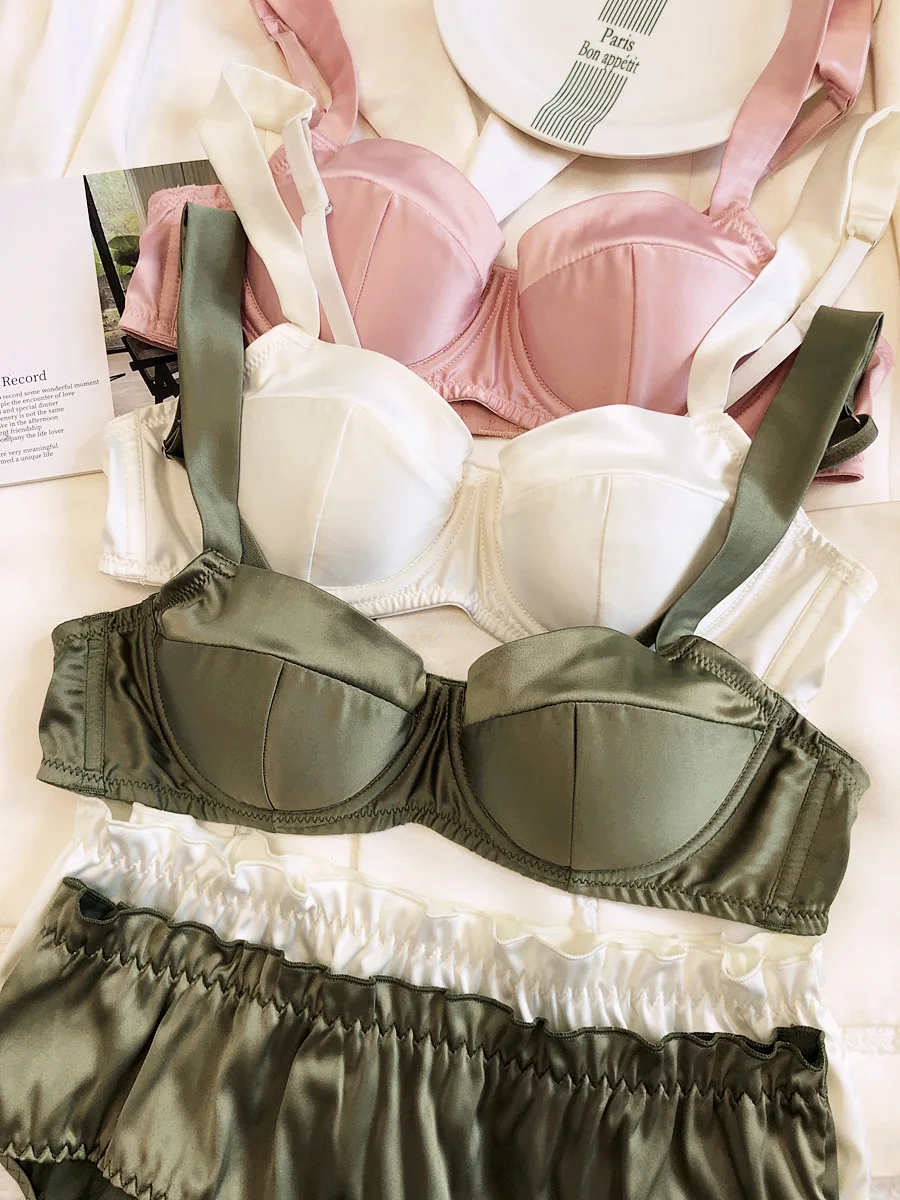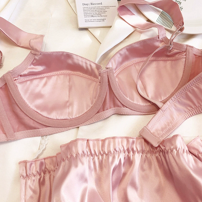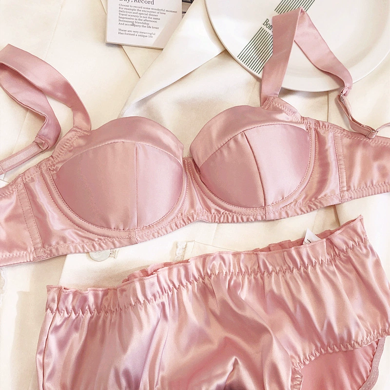 French soft steel ring satin thin underwear set large breasts show small half cup anti-sagging side breast lingerie satin