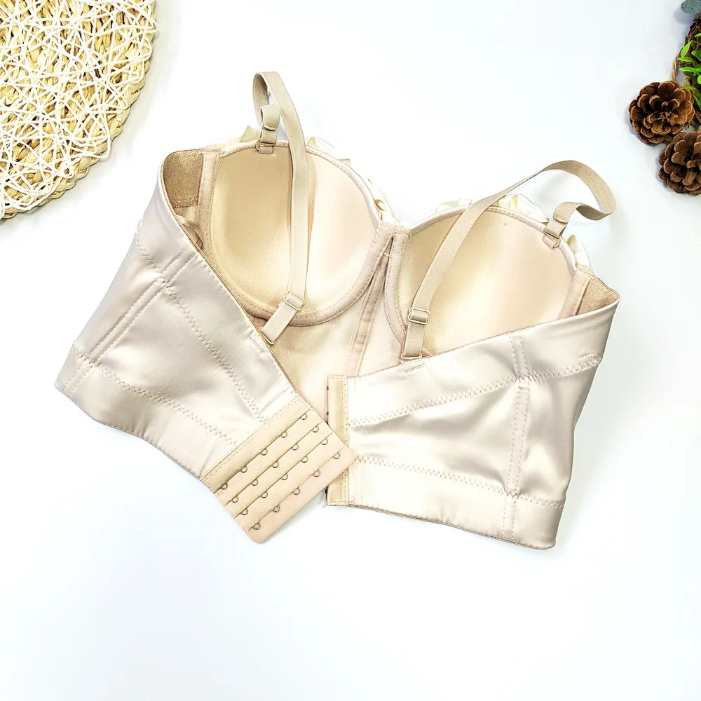 French Style Design Satin 3d Flower Decoration Bustier Women High Street Push Up Bra Female Sexy Cropped Tops q169