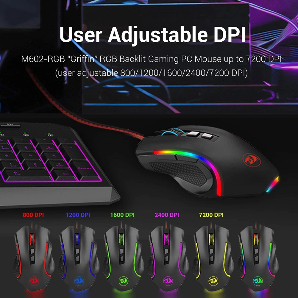 Redragon M602A-RGB 8 Buttons USB Wired Gaming Mouse 5 Gears 7200 DPI Adjustable RGB Backlight Computer PC Mice Description: 1. The Redragon GRIFFIN M602A-RGB is superbly designed highly customizable wired gaming mouse. 2. The mouse is designed for eSports Gaming Pros who demand the very best performance. 3. The Gaming Mouse is elegantly and comfortable thanks to a contoured smooth ergonomic design and offers smooth and precise movements due its high precision sensor. 4. This makes the mouse perfect for long lasting gaming sessions providing maximum comfort and support. 5. Ideal for FPS gaming, the Redragon Griffin features a 7200 DPI optical gaming sensor with advanced tracking and high-speed motion detection for precise control. 6. Offering on-the-fly DPI and profile switching with DPI Color indicator so you always make the right moves and can focus on your game play. Feature: Specification: Note: 1 X Gaming Mouse 1 X Manual