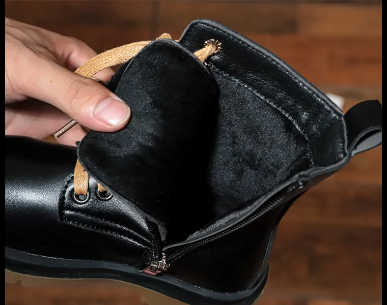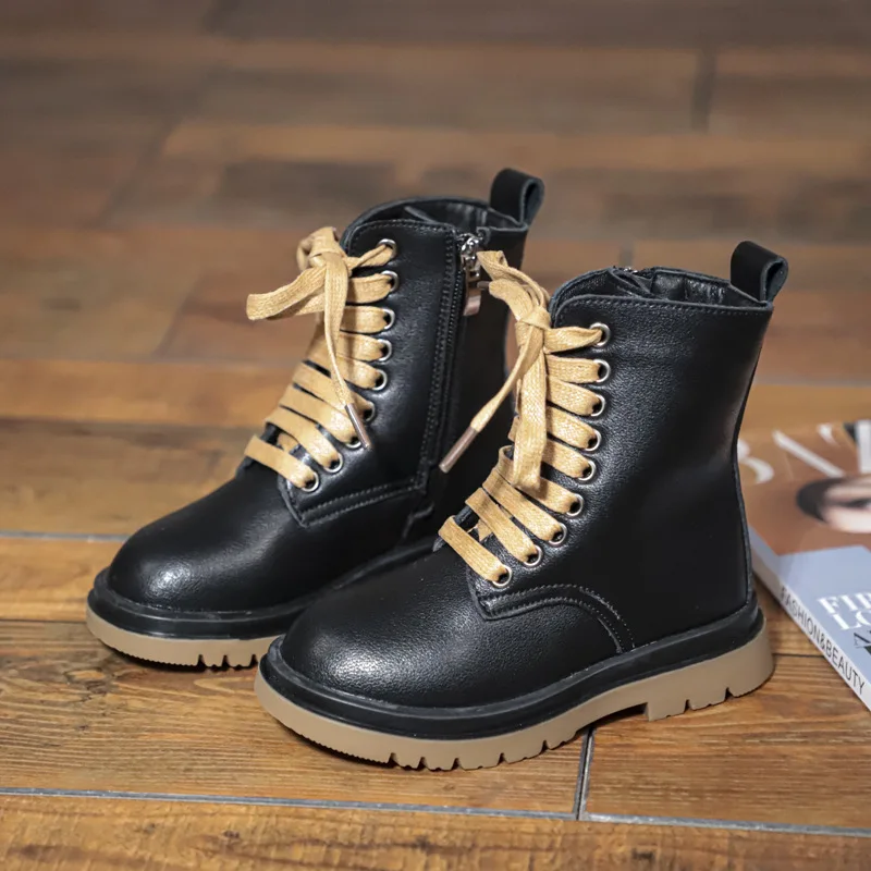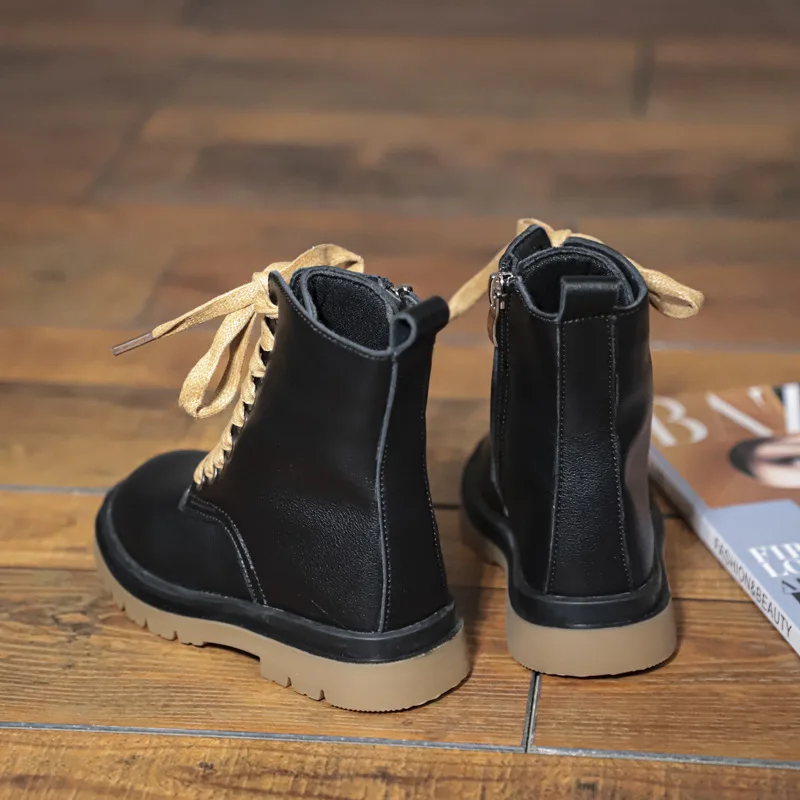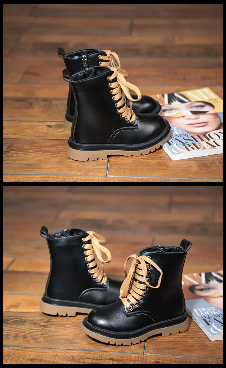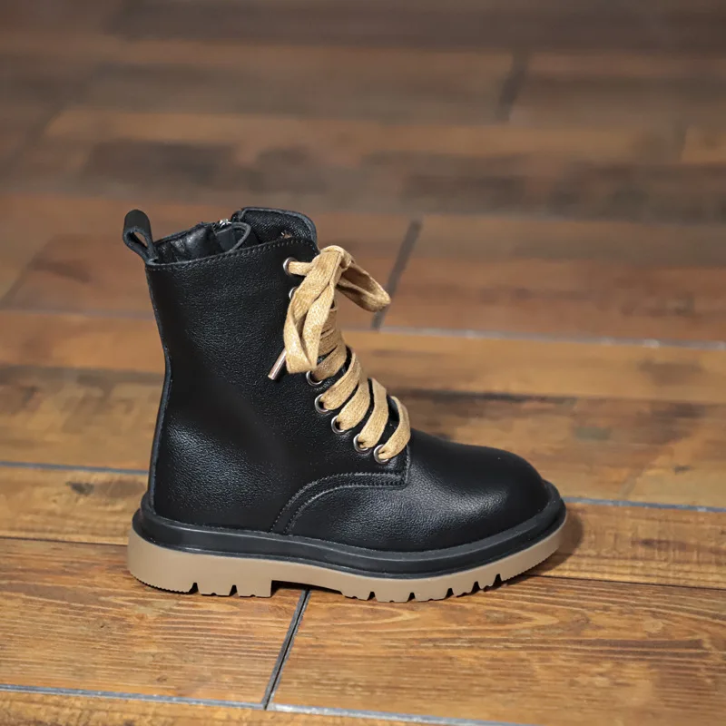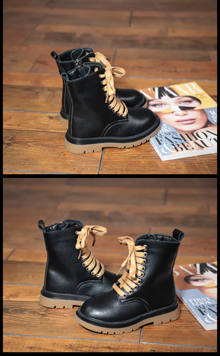 Genuine Leather Children Martin Boots Boys Casual Boots Baby Plush Winter Shoes Side Zipper Kids Warm Shoes Black British Shoes
