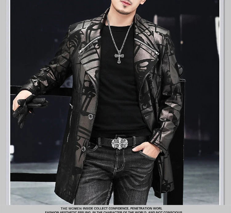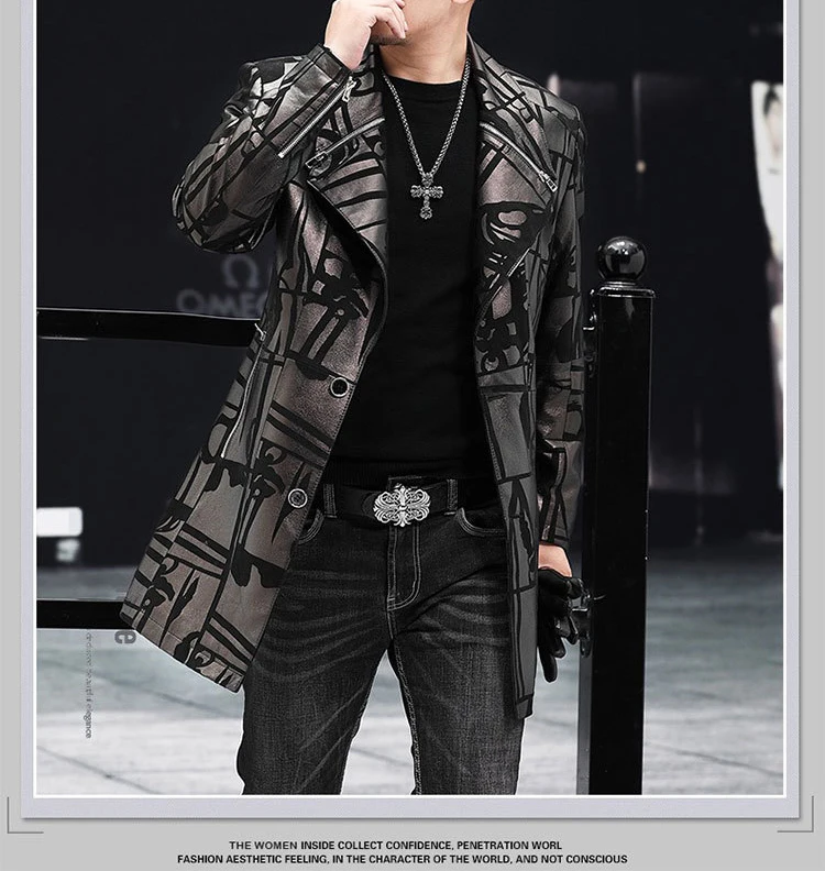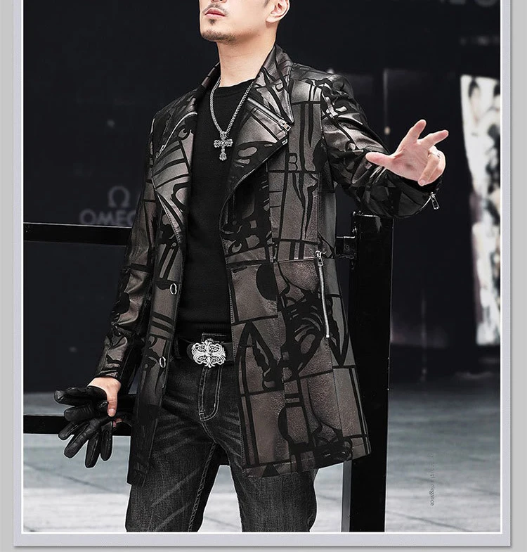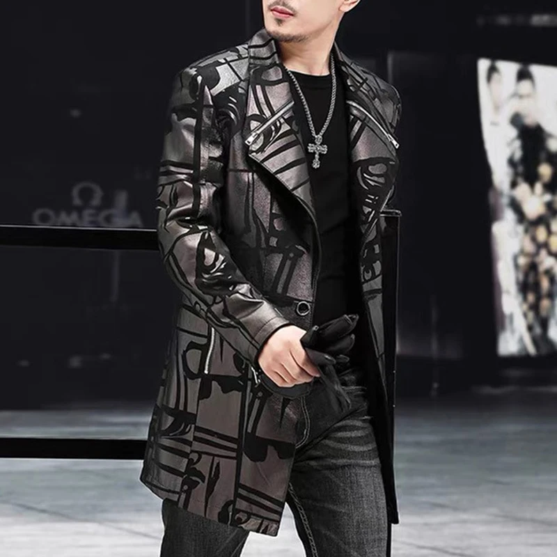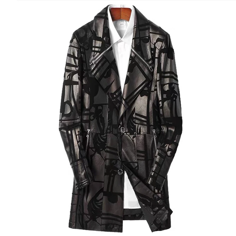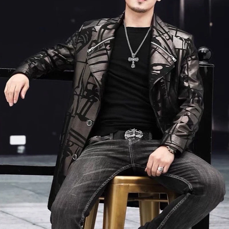 Genuine Leather Jacket Men Mid Length Suit Suede Printed Trench