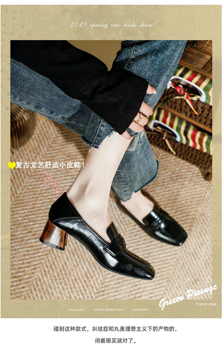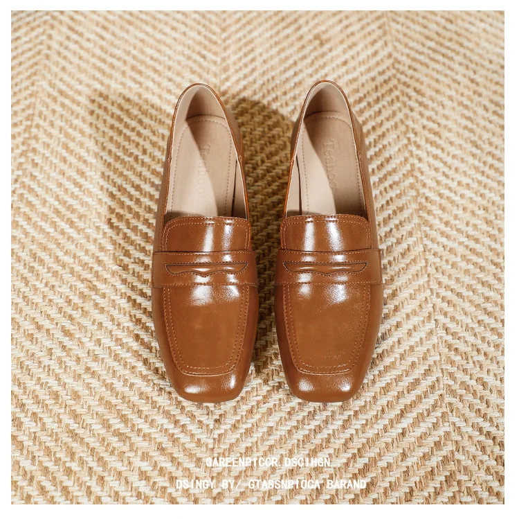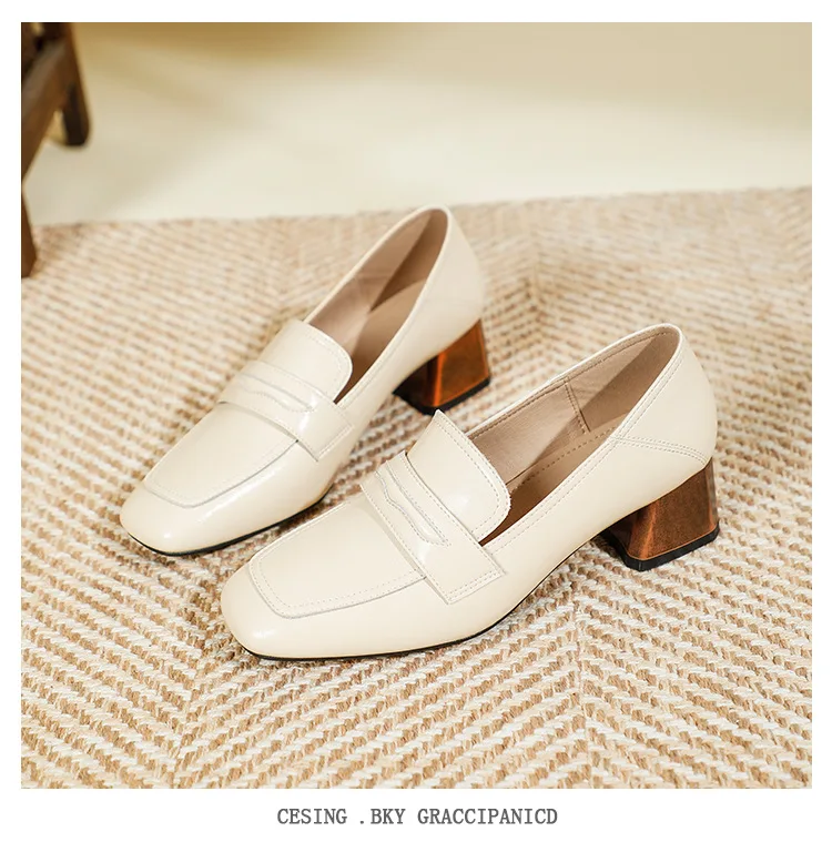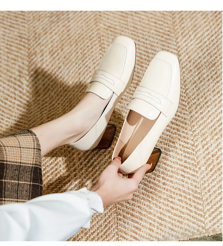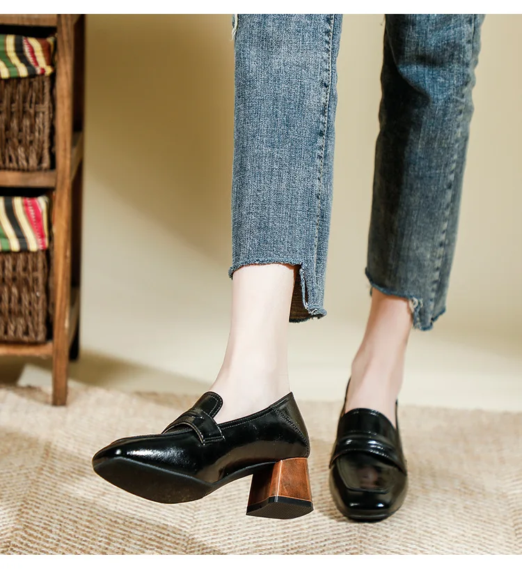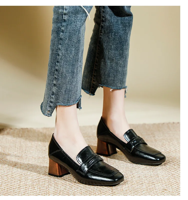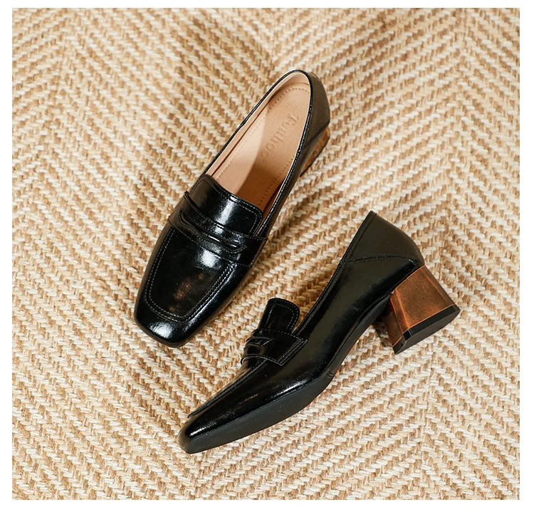 Genuine Leather oxford shoes women 2022 shallow flats shiny leather office shoes british square toe chunky heels loafers woman