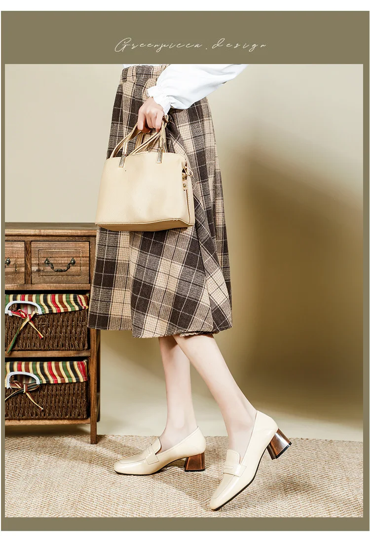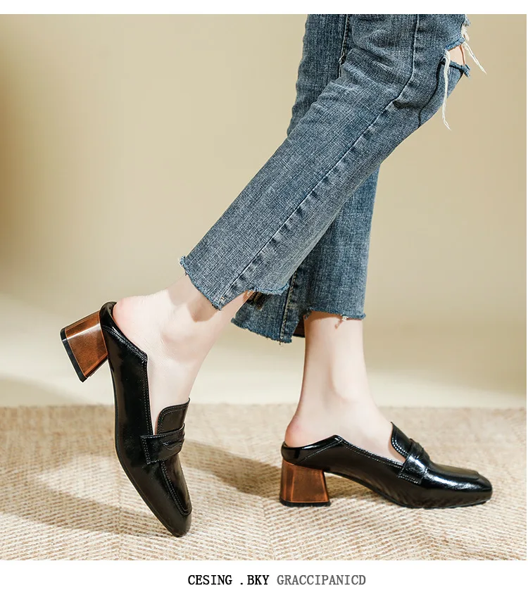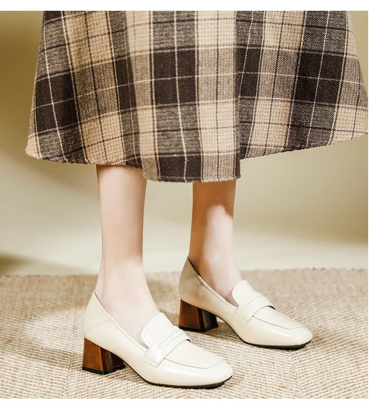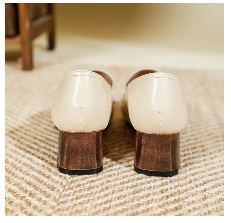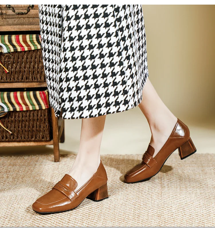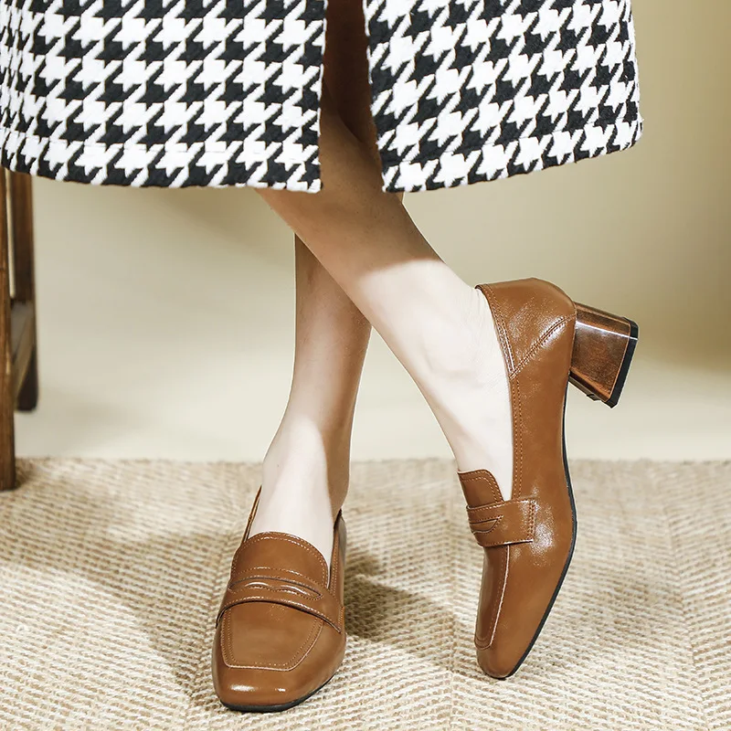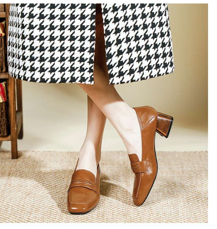Genuine Leather oxford shoes women 2022 shallow flats shiny leather office shoes british square toe chunky heels loafers woman