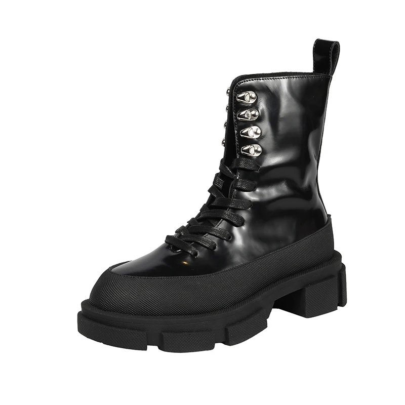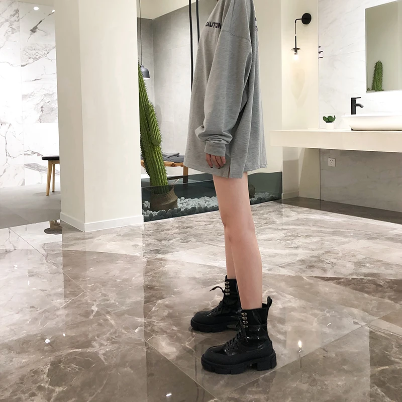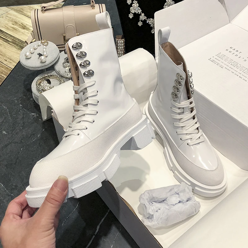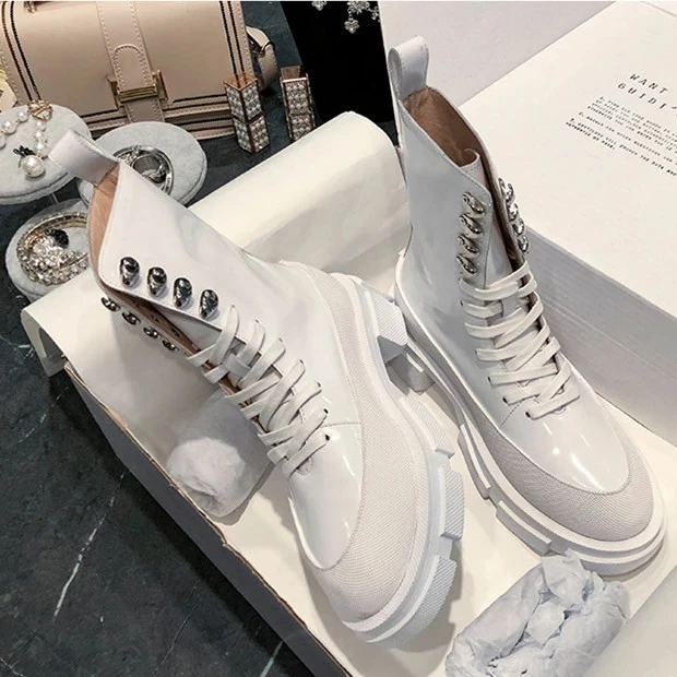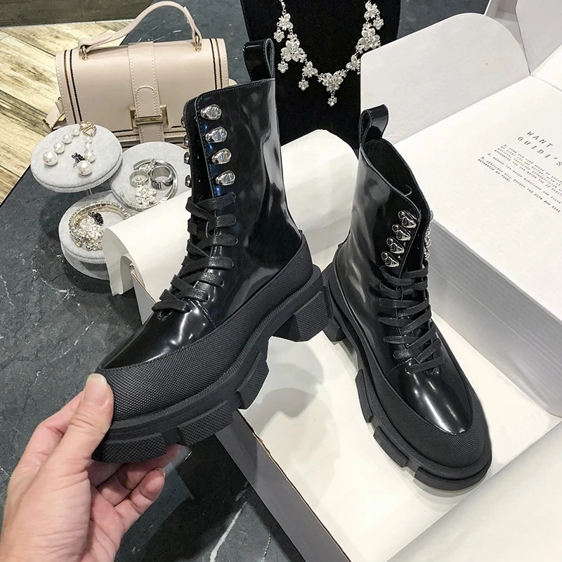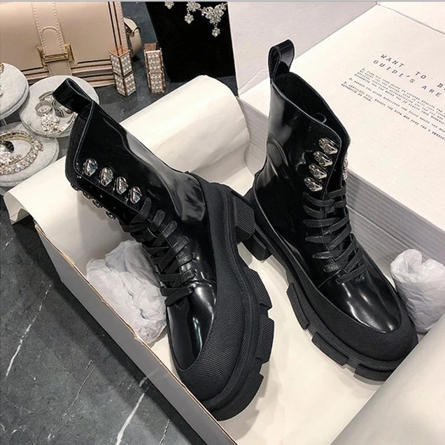 Genuine Leather Women Ankle Boots Luxury Brand Crystal Lace Up Martin Boots Fahsion Lace Up Motorcycle Boots Autumn Winter Boots